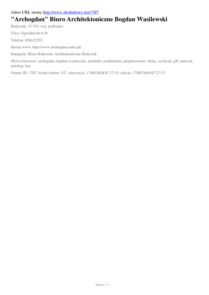 Adres URL strony http://www.abcbudowy.net/1707 "Archogdan" Biuro Architektoniczne Bogdan Wasilewski Białystok, 15-763, woj. podlaskie Ulica: Ogrodniczki 6 /6 Telefon: 856622293 Strona www: http://www.archogdan.cadea.pl Kategorie: Biura Białystok, Architektoniczne Białystok Słowa kluczowe: archogdan, bogdan wasilewski, architekt, architektura, projektowanie, domy, archicad, gdl, autocad, autolisp, lisp Numer ID: 1707, liczba odsłon: 157, aktywacja: 17/05/2010 07:27:53, edycja: 17/05/2010 07:27:53 Strona 1 / 1