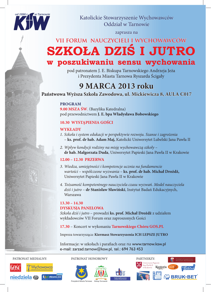 Katolickie Stowarzyszenie Wychowawców Oddział w Tarnowie zaprasza na VII FORUM NAUCZYCIELI I WYCHOWAWCÓW SZKOŁA DZIŚ I JUTRO w poszukiwaniu sensu wychowania pod patronatem J. E. Biskupa Tarnowskiego Andrzeja Jeża i Prezydenta Miasta Tarnowa Ryszarda Ścigały 9 MARCA 2013 roku Państwowa Wyższa Szkoła Zawodowa, ul. Mickiewicza 8, AULA C017 PROGRAM 9.00 MSZA ŚW. (Bazylika Katedralna) pod przewodnictwem J. E. bpa Władysława Bobowskiego 10.30 WYSTĄPIENIA GOŚCI WYKŁADY 1.Szkoła i system edukacji w perspektywie rozwoju. Szanse i zagrożenia – ks. prof. dr hab. Adam Maj, Katolicki Uniwersytet Lubelski Jana Pawła II 2.Wpływ kondycji rodziny na misję wychowawczą szkoły – dr hab. Małgorzata Duda, Uniwersytet Papieski Jana Pawła II w Krakowie 12.00 – 12.30 PRZERWA 3.Wiedza, umiejętności i kompetencje ucznia na fundamencie wartości – współczesne wyzwania – ks. prof. dr hab. Michał Drożdż, Uniwersytet Papieski Jana Pawła II w Krakowie 4.Tożsamość kompetentnego nauczyciela czasu wyzwań. Model nauczyciela dziś i jutro – dr Stanisław Sławiński, Instytut Badań Edukacyjnych, Warszawa 13.30 – 14.30 DYSKUSJA PANELOWA Szkoła dziś i jutro – prowadzi ks. prof. Michał Drożdż z udziałem wykładowców VII Forum oraz zaproszonych Gości 17.30 – Koncert w wykonaniu Tarnowskiego Chóru GOS.PL Impreza towarzysząca: Kiermasz Stowarzyszenia ICH LEPSZE JUTRO Informacje: w szkołach i parafiach oraz na www.tarnow.ksw.pl e-mail: [email protected], tel.: 694 763 453 PATRONAT MEDIALNY: PATRONAT HONOROWY Prezydent Miasta Tarnowa Biskup Tarnowski PARTNERZY: