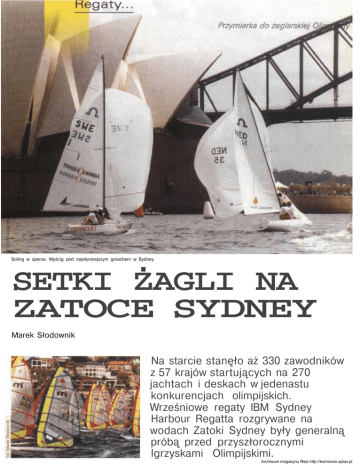 Soling w operze. Wyścig pod najsłynniejszym gmachem w Sydney SETKI ŻAGLI NA ZATOCE SYDNEY Marek Słodownik Na starcie stanęło aż 330 zawodników z 57 krajów startujących na 270 jachtach i deskach w jedenastu konkurencjach olimpijskich. Wrześniowe regaty IBM Sydney Harbour Regatta rozgrywane na wodach Zatoki Sydney były generalną próbą przed przyszłorocznymi Igrzyskami Olimpijskimi. Archiwum magazynu Rejs http://kormoran.aplus.pl Imprezę przeprowadzono dokładnie na rok przed Igrzyskami, aby wszystkie elementy sprawdzić w warunkach odpowiadających przyszłorocznej rywalizacji. Akweny startowe dla poszczególnych klas nie ulegną już zmianie, zawodnicy mieli zatem znakomitą okazję do „przymierzenia się" do nich. Wśród zawodników aż roiło się od gwiazd: medalistów olimpijskich aktualnych i z lat minionych, mistrzów świata i uczestników regat o Puchar Ameryki. Regaty były także generalnym sprawdzianem dla organizatorów. Zasłużyli na najwyższe oceny. Wprawdzie zdarzały się drobne wpadki; sędziowie czasem nie nadążali z rozpatrywaniem protestów, ale poza tym impreza była bardzo sprawnie przeprowadzona i nie było bałaganu. Bliżej widza... Jedyną smętną porażką Australijczyków okazał się eksperyment z wyposażeniem jachtów niektórych klas w urządzenia GPS przekazujące pozycje wszystkich jednostek podczas wyścigu w czasie rzeczywistym. Umożliwiać to miało śledzenie rywalizacji na ekranach monitorów nie ruszając się z wioski żeglarskiej. Aliści już pierwszego dnia z jachtów Tornado żeglujących na otwartym oceanie fala zmyła osiem nadajników i zapał do stosowania nowinek technicznych wyraźnie osłabł. Pewne kontrowersje wywołało usytuowanie tras wewnątrz zatoki, a nie na oceanie. Jest to właściwie wbrew zasadom przyjętym dla regat najwyższej rangi, ale organizatorzy Igrzysk mieli nadzieję na przyciągnięcie do widowiska szerszej publiczności. Jednak nawet matchracingowy finał w Solingu rozgrywany w niedzielne południe nieopodal słynnego gmachu opery zgromadził zaledwie garstkę widzów. Marzenia organizatorów imprezy o wielotysięcznych tłumach sympatyków żagli pozostały więc marzeniami. Ostatecznie areną przyszłorocznych zmagań będą cztery akwe- Tornado na oceanicznej fali ny na wodach zamkniętych i dwa na otwartym oceanie, a żeglowania na nich nie ułatwiają prądy i zmienne warunki wiatrowe. Wieloryb nie słucha zarządzeń Jak udało się ograniczyć ruch statków w porcie handlowym Sydney, jednym z najbardziej ruchliArchiwum magazynu Rejs http://kormoran.aplus.pl wych na wschodnim wybrzeżu Australii, pozostanie tajemnicą komitetu organizacyjnego. Faktem jest jednak, że na czas regat wszystkie jednostki zmuszone były do korzystania z tras zastępczych. Australijski Urząd Morski podporządkował się decyzjom władz miejskich i regaty uzyskały maksymalne preferencje. Zarządzenie zignorował jedynie wieloryb, który tuż przed rozpoczęciem jednego z wyścigów pojawił się w polu startowym, co zmusiło sędziów do odwołania biegu. Łatwo sobie wyobrazić, jakie spustoszenia wywołałaby kolizja walenia z rozpędzonym katamaranem. Po godzinie alarm odwołano. olbrzym skrył się w głębi oceanu i można było kontynuować regaty. Dziennikarze akredytowani w liczbie około dwustu nie mogli narzekać; mieli do dyspozycji wszystko, czego od organizatorów można wymagać. Test systemów przygotowań Regaty miały przynieść odpowiedź na pytania dotyczące formy poszczególnych zawodników, jakości ich łódek oraz osobliwości akwenu. Systemy przygotowań poszczególnych ekip poddane zostały pierwszej poważnej weryfikacji. Część ekip (wśród nich polska) wychodząc z założenia, że najważniejsze jest poznanie akwenów i panujących na nich warunków zafundowała swoim zawodnikom kilkumiesięczne pobyty treningowe w Australii. Sezon w Europie dobiegł już praktycznie końca, a tam, na miejscu przyszłej rywalizacji można spokojnie szlifować formę w doskonałych warunkach klimatycznych. Niektóre ekipy (amerykańska, nowozelandzka) poprzestały na bezpośrednim udziale w regatach, „zaatakowanych" praktycznie z marszu. Inne (na przykład Włochy) zdecydowały się na krótkie, trzytygodniowe pobyty w Australii powiązane z konkretnymi imprezami. Jest to problem nie tylko dla trenerów i zawodników, ale także dla fizjologów. Optymalna adaptacja organizmu do warunków australijskich, uzyskanie odpowiedniej dyspozycji fizycznej i koncentracji to wobec stale wyrównującego się poziomu sportowego kluczowe zagadnienia we współczesnym żeglarstwie. Zwycięzcy klasy 49-er bracia Bruni z Włoch 49-er jest bardzo widowiskowa Archiwum magazynu Rejs http://kormoran.aplus.pl Bazą regat IBM Sydney Harbour Regatta Zatoka Rushcutters. Tu także odbędą się przyszłoroczne regaty olimpijskie. Jest to jedna z zatok położonych w obrębie Zatoki Sydneyskiej, znajduje się nieopodal centrum Sydney i budynku opery. Żeglarze mieli do dyspozycji dawną bazę szkolenia marynarki australijskiej odremontowaną dwa lata temu. Dla zawodników przygotowano obszerny plac na łódki, z którego jest bezpośredni dostęp do czterech slipów. Na każdym z nich znajduje się po kilka ujęć wody słodkiej do spłukiwania morskiej soli z jachtów i ekwipunku. Bezpośrednio za placem na łódki ustawiono kontenery warsztatowo-magazynowe dla poszczególnych ekip. W pobliżu urządzono także zaplecze socjalne; natryski i toalety dla zawodników, a także rozstawiono namioty do pomiarów sprzętu. W centralnej części wioski stanął obszerny namiot dla zawodników, w którym była jadalnia i pokój spotkań towarzyskich i narad trenerskich. Tutaj wywieszano codzienne szczegółowe analizy meteorologiczne. Pontony trenerów „parkowano" przy pirsie mariny, która na czas regat wyłączona była z normalnej eksploatacji. W tym samym porcie stawały także motorówki organizatorów służące 