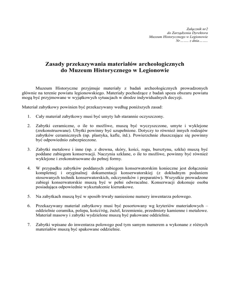 Załącznik nr2 do Zarządzenia Dyrektora Muzeum Historycznego w Legionowie Nr…….. z dnia…….. Zasady przekazywania materiałów archeologicznych do Muzeum Historycznego w Legionowie Muzeum Historyczne przyjmuje materiały z badań archeologicznych prowadzonych głównie na terenie powiatu legionowskiego. Materiały pochodzące z badań spoza obszaru powiatu mogą być przyjmowane w wyjątkowych sytuacjach w drodze indywidualnych decyzji. Materiał zabytkowy powinien być przekazywany według poniższych zasad: 1. Cały materiał zabytkowy musi być umyty lub starannie oczyszczony. 2. Zabytki ceramiczne, o ile to możliwe, muszą być wyczyszczone, umyte i wyklejone (zrekonstruowane). Ubytki powinny być uzupełnione. Dotyczy to również innych rodzajów zabytków ceramicznych (np. plastyka, kafle, itd.). Powierzchnie złuszczające się powinny być odpowiednio zabezpieczone. 3. Zabytki metalowe i inne (np. z drewna, skóry, kości, rogu, bursztynu, szkła) muszą być poddane zabiegom konserwacji. Naczynia szklane, o ile to możliwe, powinny być również wyklejone i zrekonstruowane do pełnej formy. 4. W przypadku zabytków poddanych zabiegom konserwatorskim konieczne jest dołączenie kompletnej i oryginalnej dokumentacji konserwatorskiej (z dokładnym podaniem stosowanych technik konserwatorskich, odczynników i preparatów). Wszystkie prowadzone zabiegi konserwatorskie muszą być w pełni odwracalne. Konserwacji dokonuje osoba posiadająca odpowiednie wykształcenie kierunkowe. 5. Na zabytkach muszą być w sposób trwały naniesione numery inwentarza polowego. 6. Przekazywany materiał zabytkowy musi być posortowany wg kryteriów materiałowych – oddzielnie ceramika, polepa, kości/róg, żużel, krzemienie, przedmioty kamienne i metalowe. Materiał masowy i zabytki wydzielone muszą być pakowane oddzielnie. 7. Zabytki wpisane do inwentarza polowego pod tym samym numerem a wykonane z różnych materiałów muszą być spakowane oddzielnie. 8. Każdy zbiór musi być zaopatrzony we własną czytelną metrykę wg poniższego wzoru: Muzeum Historyczne w Legionowie Nr AZP miejscowość gmina powiat opis warstwa lokalizacja wykop/ar/ćwiartka ilość / waga nr inw. polowego Data podpis Uwagi 9. Przekazywane zbiory muszą być spakowane w nowe, jednakowe zszywane kartony (pudła), o rozmiarach 17 cm (szer.) x 26 cm (dług.) x 10,5 cm (wys.) lub o wymiarach 26 cm (szer.) x 30,5 cm (dług.) x 17 cm (wys.). Zarówno kartony małe, jak i duże muszą być zamykane pokrywkami. Formy wyklejone i zrekonstruowane powinny być opakowane zgodnie z indywidualnymi potrzebami. 10. Wydzielone wcześniej kategorie zabytków, tj. ceramika, polepa, kości/róg, żużel, krzemienie, przedmioty kamienne i inne, powinny być spakowane w osobne kartony zgodnie z kolejnością numerów inwentarza polowego 11. Na węższej stronie pudła winna być nalepiona metryczka wg ww. wzoru. 12. Wszystkie zabytki muszą być oznakowane numerami inwentarza polowego. 13. Do materiału zabytkowego musi być dołączona kompletna i oryginalna dokumentacja z badań wraz ze sprawozdaniem z badań – zgodnie z obowiązującymi standardami zawartymi w Rozporządzeniu Ministra Kultury i Dziedzictwa w sprawie prowadzenia prac konserwatorskich, restauratorskich, robót budowlanych, badań konserwatorskich i architektonicznych, a także innych działań przy zabytku wpisanym do rejestru zabytków oraz badań archeologicznych i poszukiwań ukrytych lub porzuconych zabytków ruchomych z dnia 14 października 2015 roku. Dokumentacja powinna być dostarczona również w wersji elektronicznej. Dokumentacja fotograficzna dostarczana jest na płytach CD/DVD w postaci nieprzetworzonej (nie poddanej obróbce). Preferuje się zapis fotografii w formacie RAW. 14. Zabytki wydzielone muszą posiadać własny inwentarz. Inwentarze powinny zawierać określenia chronologiczne warstw, obiektów i zabytków oraz dane lokalizacyjne. 15. Materiał przekazywany jest protokolarnie na podstawie decyzji Mazowieckiego Wojewódzkiego Konserwatora Zabytków, a na muzeum przechodzą z materiałem również wszelkie prawa do materiałów i dokumentacji. Załącznik nr 3 do Zarządzenia Dyrektora Muzeum Historycznego w Legionowie Nr…….. z dnia…….. Zasady przenoszenia autorskich praw majątkowych do dokumentacji wykopaliskowej na rzecz Muzeum Historycznego w Legionowie Po protokolarnym przekazaniu dokumentacji wykopaliskowej, na rzecz Muzeum Historyczne w Legionowie przechodzą również wszelkie do niej prawa, w tym autorskie prawa majątkowe. Autorzy dokumentacji (dziennika badań, sprawozdania, dokumentacji rysunkowej, fotograficznej, wszelkiego rodzaju analiz, ekspertyz i innych opracowań wykonywanych na potrzeby badań archeologicznych) nieodpłatnie przekazują całość praw autorskich na Muzeum Historyczne w Legionowie. Przekazanie nie ma żadnych ograniczeń czasowych i terytorialnych na wszelkich znanych w chwili przekazania polach eksploatacji, a w szczególności: w zakresie utrwalania i zwielokrotniania dowolną techniką, w zakresie obrotu oryginałem lub egzemplarzami (duplikatami, kopiami), wprowadzeniem ich do obrotu, użyczenia, najmu itp., całości lub części dokumentacji, wprowadzania do obrotu nośników wszelkiego rodzaju, a także publikacji realizowanych na podstawie przekazanej dokumentacji zawierających całość lub dowolne jej fragmenty, wszelkiego rodzaju rozpowszechniania, w tym również wprowadzania do pamięci komputerów, udostępnianie w sieci Intranet i Internet itp., publiczne udostępnianie całości lub dowolnych fragmentów dokumentacji (zarówno odpłatne, jak i nieodpłatne) w trakcie wystaw, prezentacji, konferencji i innych działań publicznych i naukowych. Muzeum ma prawo do dowolnego rozporządzania dokumentacją bez konieczności uzyskiwania odrębnej zgody. Niezależnie od przeniesienia majątkowych praw autorskich na wyżej wymienionych polach eksploatacji Muzeum posiada prawo do wyk