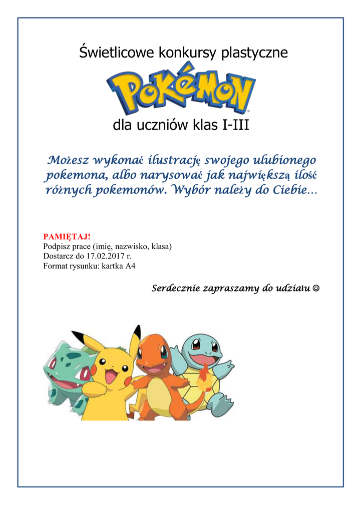 Świetlicowe konkursy plastyczne dla uczniów klas I-III Możesz wykonać ilustrację swojego ulubionego pokemona, albo narysować jak największą ilość różnych pokemonów. Wybór należy do Ciebie… PAMIĘTAJ! Podpisz prace (imię, nazwisko, klasa) Dostarcz do 17.02.2017 r. Format rysunku: kartka A4 Serdecznie zapraszamy do udziału