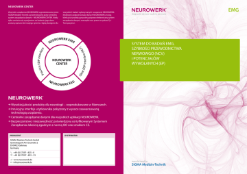 NEUROWERK CENTER Wszystkie urządzenia NEUROWERK wyprodukowane przez SIGMA Medizin-Technik są kontrolowane przez centralny system zarządzania danymi – NEUROWERK CENTER. Kiedy tylko umówisz się z pacjentem na badanie, jego dane zostaną wpisane do twojego systemu i będą dostępne dla wszystkich badań wykonywanych na aparacie NEUROWERK. Możliwość połączenia bazy danych NEUROWERK z twoją kliniką lub praktyką prywatną poprzez elektroniczny system zarządzania danymi, oszczędzi czas, przez co zyskasz Ty i Twoi pacjenci. 7) L EDP interface (H NEUROWERK CENTER SYSTEM DO BADAŃ EMG, SZYBKOŚCI PRZEWODNICTWA NERWOWGO (NCV) i POTENCJAŁÓW WYWOŁANYCH (EP) Cli nic ice EDP interfa t c ce Pra WERK EM UR O G E N diagnostic devices made in germany NE UROW RK EEG E k Wysokiej jakości produkty dla neurologii – wyprodukowane w Niemczech. k Intuicyjny interfejs użytkownika połączony z wysoce zaawansowaną technologią urządzenia. k Centralne zarządzanie danymi dla wszystkich aplikacji NEUROWERK. k Bezpieczeństwo i niezawodność potwierdzona certyfikowanym Systemem Zarządzania Jakością zgodnym z normą ISO oraz znakiem CE. PRODUCENT DYSTRYBUTOR SIGMA Medizin-Technik GmbH Gewerbepark Am Gruendel 2 D-09423 Gelenau Germany 3 +49 (0) 37297 – 825 – 0 5 +49 (0) 37297 – 825 – 23 U www.neurowerk.de u [email protected] Brand and Communication Design by Branding Healthcare ® manufactured by SIGMA Medizin-Technik EMG NEUROWERK EMG System EMG NEUROWERK zapewnia pełną gamę badań niezbędnych w codziennej diagnostyce zaburzeń neurologicznych. Pozwala on na tworzenie własnych protokołów pomiarowych, otwierając praktycznie nieograniczone możliwości znajdowania optymalnej metody badania dla konkretnego przypadku. Główne atuty systemu to prosta, intuicyjna obsługa oraz z wysoka wydajność. System jest wyposażony we wzmacniacz z przetwornikiem analogowo-cyfrowym o wysokiej SOFTWARE rozdzielczości, który pozwala na rejestrowanie wszystkich potrzebnych sygnałów elektrofizjologicznych. SIGMA Medizin-Technik stworzyła kompletny system do badań EMG/NCV/EP, który sprawia, że codzienna diagnostyka staje się prosta i wydajna. Możemy zapewnić, że praca na aparatach NEUROWERK przyczyni się również do dużych oszczędności czasu i pieniędzy. OGÓLNE DANE k Skonfigurowane i łatwo programowalne badania. k Ciągła kontrola surowych danych. k Wysokiej klasy wzmacniacz i 24-bitowy przetwornik analogowo-cyfrowy. k Automatyczne ustawienia znacznika i kalkulacja takich aspektów jak: latencja, amplituda, spadek amplitudy. k Nagrywanie z podwójną podstawą czasu. k Atlas z rysunkami rozmieszczenia elektrod. k Dzielenie ekranu dla łatwego porównania wyników z lewej i prawej kończyny. k Łatwo programowalne tabele wyników i raportu. Opcja: przenośny NEUROWERK EMG z walizką. x DANE TECHNICZNE Wzmacniacz k Kanały: 2 lub 4 k Zintegrowany test impedancji elektrod k CMRR: > 110 dB, Szum: < 1μV k Wejściowa impedancja: > 110 MOhm k Dolny limit częstotliwości: 0,07 ... 500 Hz k Górny limit częstotliwości: 30 Hz ... 20 kHz k Filtr sieciowy 50/60 Hz BADANIA NERWÓW MODELE NCV – szybkość przewodnictwa nerwowego k 2 lub 4 kanałowe. k ruchowa, czuciowa, badanie krótkich segmentów (inching) test męczliwości (test miasteniczny), fala F, odruchy (odruch H, OOR). SEP – somatosensoryczne potencjały wywołane k Zdefiniowane programy do badania nerwów: pośrodkowego, piszczelowego i trójdzielnego. k Monitorowanie śródoperacyjne.* k Jako system EMG/NCV/SEP. k Jako system EMG/NCV/SEP/AEP/VEP. k Jako rozszerzenie AEP/VEP dla EEG NEUROWERK. k Z komputerem lub notebookiem. k Jako system przenośny w walizce. k Czułość: 0,1 μV ... 10 mV/DIV Uśredniacz k Przetwornik analogowo-cyfrowy: 24 bity. k Częstotliwość próbkowania: 50kHz/Kanał. k Czas analizy: 0,01 ... 10 s. k Tłumienie artefaktów: włączone/wyłączone, możliwość definiowania poziomu wytłumiania artefaktu. k Liczba możliwych rejestracji wyników: 1...10000 Stymulator wzrokowy AEP – słuchowe potencjały wywołane k 17“ monitor i gogle. k Krótko-, średnio- i długolatencyjne potencjały k Rodzaj stymulacji: szachownica - może być wyświetlana na pełnym ekranie, w prawej, w lewej, górnej, dolnej oraz wybranej przez użytkownika części ekranu, okulary LED* z stymulacją oka prawego, lewego lub obu. k Liczba pól szachownicy: 4, 8, 16, 32, 64, 128. k Punkt ufiksowania wzroku: centralny lub w jakimkolwiek podanym miejscu na monitorze. wywołane pnia mózgu.* k Łatwe określenie bodźców progowych. k Automatyczne badanie. VEP – wzrokowe potencjały wywołane k Szachownica o różnych rozmiarach. MEP – ruchowe potencjały wywołane (Motor EP) Stymulator elektryczny k Możliwość podłączenia różnych stymulatorów magnetycznych. k Tryb stymulacji: impuls stymulujący pojedynczy, podwójny, seria impulsów. k Fala F do mierzenia latencji centralnej odpowiedzi ruchowej. k Zdefiniowane programy dla kończyn górnych i dolnych. k Stymulator: prąd stały. EMG k Natężenie prądu: 0 ... 100 mA k Czas trwania impulsu: 0,05 ... 1 ms k Spontaniczne, spoczynkowe i maksymalny wysiłek. k Ilościowa analiza EMG dla jednostek motorycznych.* Stymulator akustyczny k Analiza współczulna: zwroty/amplituda.* k Typ stymulacji: klik, długi impuls tonalny, szum. k Analiza EMG podczas stymulacji nerwu. k Tryb stymulacji pojedynczym sygnałem: kondensacja, rozrzedzenie, naprzemienna, losowa. k Czas trwania impulsu: 0,1; 0,2 ms (pojedynczy sygnał). k Ciśnienie akustyczne: 0 ... 100 dB nHL k EMG pojedynczego włókna.* k Makro EMG.* ANS k Współczulna odpowiedź skóry (SSR). k Zmienność rytmu serca (HRV). * opcja Opcja: stacjonarny aparat NEUROWERK EMG na konsoli. h Wyjście stymulatora: strona prawa, lewa, obydwie strony. Pomocne wskazówki dla Twojej codziennej pracy – atlas anatomiczny do właściwego rozmieszczenia elektrod. k Możliwość podłączenia dwóch stymulatorów zewnętrzn