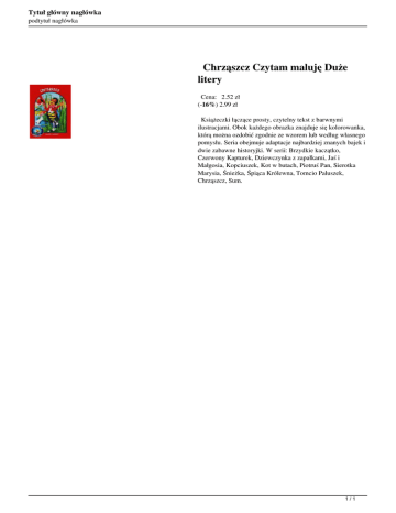 Tytuł główny nagłówka podtytuł nagłówka Chrząszcz Czytam maluję Duże litery Cena: 2.52 zł (-16%) 2.99 zł Książeczki łączące prosty, czytelny tekst z barwnymi ilustracjami. Obok każdego obrazka znajduje się kolorowanka, którą można ozdobić zgodnie ze wzorem lub według własnego pomysłu. Seria obejmuje adaptacje najbardziej znanych bajek i dwie zabawne historyjki. W serii: Brzydkie kaczątko, Czerwony Kapturek, Dziewczynka z zapałkami, Jaś i Małgosia, Kopciuszek, Kot w butach, Piotruś Pan, Sierotka Marysia, Śnieżka, Śpiąca Królewna, Tomcio Paluszek, Chrząszcz, Sum. 1/1 Powered by TCPDF (www.tcpdf.org)