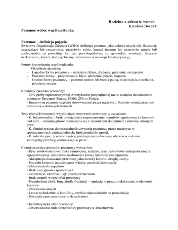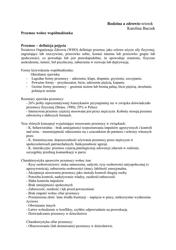 Rodzina a zdrowie-wtorek Karolina Buczek Przemoc wobec współmałżonka Przemoc – definicja pojęcia Światowa Organizacja Zdrowia (WHO) definiuje przemoc jako celowe użycie siły fizycznej, zagrażające lub rzeczywiste, przeciwko sobie, komuś innemu lub przeciwko grupie lub społeczności, co powoduje lub jest prawdopodobne, że spowoduje zranienie, fizyczne uszkodzenie, śmierć, ból psychiczny, zaburzenia w rozwoju lub deprywację. Formy krzywdzenia współmałżonka: Określanie zjawiska: - Łagodne formy przemocy – uderzenie, klaps, drapanie, gryzienie, szczypanie. - Poważne formy – przyduszanie, bicie, uderzenie pięścią, kopanie. - Groźne formy przemocy – grożenie nożem lub bronią palną, bicie pięścią, strzelanie, pchnięcie nożem Rozmiary zjawiska przemocy: - 26% próby reprezentatywnej Amerykanów przynajmniej raz w związku doświadczało przemocy fizycznej (Straus, 1980); 29% w Polsce. - Intensywna przemoc częściej stosowana jest przez mężczyzn. Kobiety stosują przemoc odwetową o słabszych formach. Tezy różnych koncepcji wyjaśniające stosowanie przemocy w związkach: - K. behawioralna: - brak umiejętności rozpoznawania impulsów agresywnych i kontroli nad nimi, - nieumiejętność odnoszenia się z szacunkiem do partnera i ochrony własnych praw. - K. feministyczna: dopuszczalność używania przemocy przez mężczyzn w społeczeństwach patriarchalnych; funkcjonalność agresji. - K. interakcyjne: przemoc częścią patologicznej sekwencji zdarzeń w rodzinie; szczególny przebieg komunikacji w parze. Charakterystyka sprawców przemocy wobec żon: - Rysy osobowościowe: niska samoocena, sadyzm, rysy osobowości antyspołecznej (z agresywnością), zaburzenia osobowości (inne), labilność emocjonalna. - Akceptacja stosowania przemocy jako metody kontroli drugiej osoby. - Potrzeba kontroli, nadużywanie władzy, zazdrość/zaborczość - Słaba kontrola impulsów - Brak umiejętności społecznych - Zaborczość, zazdrość i lęk przed porzuceniem - Brak empatii wobec ofiar przemocy - Przeniesiona złość. Inne źródła frustracji – napięcia w pracy, niekorzystne wydarzenia życiowe - Obwinianie innych - Łatwe wchodzenie w konflikty, szybkie odpowiadanie na prowokację - Doświadczanie przemocy w dzieciństwie Charakterystyka ofiar przemocy: - Obserwowanie (lub doznawanie) przemocy w dzieciństwie. - Silna zależność między wykształceniem małżonków, pozycją ekonomiczną i dystrybucją władzy a przemocą w małżeństwie. Najwięcej przemocy doznają kobiety, które mają niskie wykształcenie, brak dochodów lub niskie, mąż ma więcej władzy niż one, mąż osobą dominującą w związku. Charakterystyka ofiar – dlaczego zostają ze sprawcami przemocy: - Niska samoocena. - Duża zależność emocjonalna od partnera i często finansowa. Tendencja do podporządkowywania się. - Bierne sposoby radzenia sobie ze stresem – unikanie, wycofywanie się, pogłębiająca się wyuczona bezradność – brak kontroli nad własnym życiem. - Przypisywanie sobie winy i odpowiedzialności za akty przemocy męża; obrona sprawców, zniekształcone atrybucje. - Nierealistyczna nadzieja, że partner zmieni się. - Izolacja społeczna. Bibliografia: Dutton. D. (2001). Przemoc w rodzinie. Grupa Wydawnicza Bertelsmann Media. Herman J. L. (1998). Przemoc. Uraz psychiczny i powrót do równowagi. Gdańsk: GWP http://rapidshare.com/files/15714767/TPSU.rar.html „Takiego pięknego syna urodziłam”