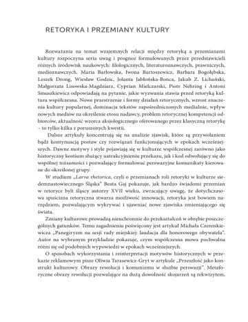 RETORYKA I PRZEMIANY KULTURY Rozważania na temat wzajemnych relacji między retoryką a przemianami kultury rozpoczyna seria uwag i prognoz formułowanych przez przedstawicieli różnych środowisk naukowych: filologicznych, literaturoznawczych, prawniczych, medioznawczych. Maria Barłowska, Iwona Bartoszewicz, Barbara Bogołębska, Leszek Drong, Wiesław Godzic, Jolanta Jabłońska-Bonca, Jakub Z. Lichański, Małgorzata Lisowska-Magdziarz, Cyprian Mielczarski, Piotr Nehring i Antoni Smuszkiewicz odpowiadają na pytanie, jakie wyzwania stawia przed retoryką kultura współczesna. Nowe przestrzenie i formy działań retorycznych, wzrost znaczenia kultury popularnej, dominacja tekstów zapośredniczonych medialnie, wpływ nowych mediów na określenie etosu nadawcy, problem retorycznej kompetencji odbiorców, aktualność wzorca aksjologicznego oferowanego przez klasyczną retorykę – to tylko kilka z poruszonych kwestii. Dalsze artykuły koncentrują się na analizie zjawisk, które są przywołaniem bądź kontynuacją postaw czy rozwiązań funkcjonujących w epokach wcześniejszych. Dawne motywy i style pojawiają się w kulturze współczesnej zarówno jako historyczny kostium służący uatrakcyjnieniu przekazu, jak i kod odwołujący się do wspólnej tożsamości i pozwalający formułować perswazyjne komunikaty kierowane do określonej grupy. W studium „Larva rhetorica, czyli o przemianach roli retoryki w kulturze siedemnastowiecznego Śląska” Beata Gaj pokazuje, jak bardzo świadomi przemian w retoryce byli śląscy autorzy XVII wieku, zwracający uwagę, że dotychczasowa spuścizna retoryczna stwarza możliwość innowacji, retoryka jest bowiem narzędziem, pozwalającym wykrywać i ujawniać nowe zjawiska zmieniającego się świata. Zmiany kulturowe prowadzą nieuchronnie do przekształceń w obrębie poszczególnych gatunków. Temu zagadnieniu poświęcony jest artykuł Michała Czerenkiewicza „Panegiryzm na sesji rady miejskiej: laudacja dla honorowego obywatela”. Autor na wybranym przykładzie pokazuje, czym współczesna mowa pochwalna różni się od podobnych wypowiedzi w epokach wcześniejszych. O sposobach wykorzystania i reinterpretacji motywów historycznych w przekazie reklamowym pisze Oliwia Tarasewicz-Gryt w artykule „Przeszłość jako konstrukt kulturowy. Obrazy rewolucji i komunizmu w służbie perswazji”. Metaforyczne obrazy rewolucji pozwalające na dużą dowolność skojarzeń są rekwizytem, po który chętnie sięgają autorzy reklam. Nieco inny cel instrumentalnego wykorzystania przeszłości we współczesnej kulturze popularnej pokazuje Elżbieta Pawlak-Hejno w tekście „Kryminalny powrót do przeszłości – zabiegi retoryczne w retroopowieściach Marcina Wrońskiego”. Opis dwudziestolecia międzywojennego okazuje się z jednej strony atrakcyjnym dla czytelników tłem literackim, z drugiej strony zaś jest narzędziem służącym autorowi do budowania swojej wiarygodności. Marcin Styszyński w szkicu „Współczesne wykorzystanie tradycyjnej symboliki w kulturze arabskiej” opisuje wybrane przykłady symboli wyrosłych w kulturze arabskiej, pokazując ich żywotność w takich sytuacjach retorycznych jak polemika polityczna czy oferta handlowa. W artykule “Monstrum horrendum, informe, ingens, cui lumen ademptum…? Retoryka jako wyzwanie rzucone literaturoznawstwu. Szkic warsztatowy” Bartłomiej Starnawski podejmuje namysł nad wzajemnymi relacjami miedzy retoryką a rozwojem literatury, dowodząc, że u podstaw tworzenia tekstów literackich znajduje się akt retoryczny. Jedną z form wypowiedzi retorycznych budzących dziś wiele emocji i kontrowersji są debaty wyborcze. Agnieszka Budzyńska-Daca w tekście „Debaty konkursowe i telewizyjne debaty przedwyborcze – problemy dispositio w dwóch realizacjach gatunkowych” przedstawia uwarunkowania związane z przyjętym formatem i uporządkowaniem argumentacji, które decydują o ocenie i efektach konkretnych debat. Wartością retoryki zawsze była uniwersalność jej zasad. Ich efektywność ukazuje się wyraźnie w momentach zmian, kiedy skuteczność uzależniona jest od szybkości podejmowanych wyborów. Najtrafniejsze zaś bywają te, które wynikają z wnikliwej analizy rzeczywistości. Jakub Z. Lichański redaktor naczelny Agnieszka Kampka redaktor tomu