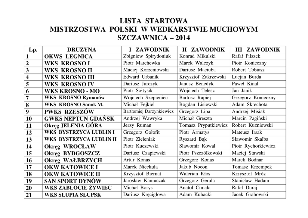LISTA STARTOWA MISTRZOSTWA POLSKI W WEDKARSTWIE MUCHOWYM SZCZAWNICA – 2014 Lp. 1 2 3 4 5 6 7 8 9 10 11 12 13 14 15 16 17 18 19 20 21 DRUZYNA OKWS LEGNICA WKS KROSNO I WKS KROSNO II WKS KROSNO III WKS KROSNO IV WKS KROSNO - MO WKS KROSNO Rymanów WKS KROSNO Sanok M. PWKS RZESZÓW GWKS NEPTUN GDA SK Okr g JELENIA GÓRA WKS BYSTRZYCA LUBLIN I WKS BYSTRZYCA LUBLIN II Okr g WROCŁAW Okr g BYDGOSZCZ Okr g WAŁBRZYCH OKW KATOWICE I OKW KATOWICE II SAN SPORT DYNÓW WKS ZABŁOCIE YWIEC WKS SŁUPIA SŁUPSK I ZAWODNIK Zbigniew Spirydoniuk Piotr Marchewka Maciej Korzeniowski Edward Urbanik Dariusz Jurczyk Piotr Sołtysik Wojciech Szepieniec Michał Fejkiel Bartłomiej Dar ynkiewicz Andrzej Wawryka Jerzy Ruman Grzegorz Gołofit Piotr Zieleniak Piotr Kuczewski Dariusz Czapiewski Artur Konas Marek Nieckuła Krzysztof Biernat Jarosław Kaniuczak Michał Borys Dariusz Kr cigłowa II ZAWODNIK Konrad Mikulski Marek Walczyk Dariusz Maciuba Krzysztof Zakrzewski Janusz Benedyk Wojciech Telesz Bartosz Rapiej Bogdan Lisiewski Grzegorz Lipa Michał Greszta Tomasz Pryputkiewicz Piotr Armatys Ryszard B k Sławomir Kowal Piotr Pszczółkowski Grzegorz Konas Jakub Noco Walerian Kłos Grzegorz Gerula Anatol Cimała Adam Kubacki III ZAWODNIK Rafał Pilszek Piotr Konieczny Robert Tobiasz Lucjan Burda Paweł Kinal Jan Janik Grzegorz Konieczny Adam Skrechota Andrzej Misiak Marcin Pagi ski Robert Ku niewski Mateusz Irsak Sławomir Skałba Piotr Rychorkiewicz Maciej Stawski Marek Bodnar Tomasz Krzempek Krzysztof Mróz Stanisław Hadam Rafał Duraj Jacek Grabowski 22 23 24 25 26 27 28 29 30 31 32 33 34 35 36 37 38 39 40 41 42 43 44 45 46 47 WKS DUNAJEC I WKS DUNAJEC II WKS DUNAJEC III WKS DUNAJEC V WKS DUNAJEC NT 16 WKS DUNAJEC CADDIS WKS DUNAJEC Z 1 WKS DUNAJEC Mszanka WKS DUNAJEC Limanowa WKS DUNAJEC - MO WKS KRAKÓW Zwierzyniec Okr g PIOTRKÓW TRYB. WKS B.B. SKAWICA WKS B.B. SKOCZÓW WKS B.B. WADOWICE 1 WKS B.B. WADOWICE 2 Okr g PZW OPOLE 1 Okr g PZW OPOLE 2 Krzysztof Gryniewicz Józef Lach Maciej Tokarczyk Marek Kowalski Marian Mozdyniewicz Antoni Wn kowicz Janusz Gonciarczyk Marek Bomba Tadeusz Chudy Krzysztof Szymczak Maciej Rudzik Paweł Gajda Ryszard Baklarz Krystian Janik Krzysztof Ostruszka Andrzej Krzyszto Paweł Zaj c Dariusz Wojewódka SMKW SOŁA W GIERSKA G. Adam Jurasz Artur Tokarczyk Okr g MAZOWIECKI Piotr Leszczyk NADNOTECKI PIŁA Rami Mizer ŁÓDKA ŁÓD Zbigniew Zasadzki WKS KRAKÓW Stare M. WKS KRAKÓW Nowa Huta Krystian Biało WKS KRAKÓW My lenice Łukasz Ostafin Grzegorz Radecki WKS KRAKÓW Nowa Huta 2 Jakub Grafczy ski Józef Chraca Łukasz Wójcik Józef Wenit Eugeniusz Garbacz Andrzej Wn kowicz Jan Znaniec Piotr Kubik Andrzej Dudek Maciej Jankowski Marcin Kołodziej Robert Amró kiewicz Jarosław Dyduch Dariusz Rakowski Stanisław Guzdek Mirosław Pałka Piotr Sołtysik Adam Podgórny Andrzej Zawada Grzegorz Zaj c Jarosław Sienkiewicz Krzysztof Tłoczek Andrzej Zasadzki Marcin Pucułek Marcin Słomka Robert Kocioł Robert Zyzik Sławomir Brach Piotr Przybyłowicz Artur Szczygieł Maciej Paj k Adam Wn kowicz Tomasz Przeklasa Janusz Paleta Krystian cisłowicz Andrzej Łukaszczyk Piotr Gawlicki Arkadiusz Ci y ski Sylwester Sobaniak Kazimierz Szymala Mariusz Pindel Krzysztof Szewczyk Arkadiusz Mi ta Łukasz Lorenc Tomasz Waligóra Robert Mularczyk Tomasz Skoczyk Dariusz Czernielewski Zdzisław Opach Maciej Putniorz Mariusz Szlachetka Mieczysław Tylek 48 49 50 Okr g CZ STOCHOWA WKS BIG FISH SZCZECIN PKWM LIPIE POZNA Kamil Radosz Przemysław urowski Gerard Błaszczak Andrzej Tracz Andrzej Konwi ski Jarosław Nowak INDYWIDIDUALNIE SENIORZY Lp. 1 2 3 4 5 6 7 8 9 10 11 12 13 14 15 16 17 Klub / Okr g OKWS LEGNICA WKS KROSNO Okr g KIELCE Okr g JELENIA GÓRA Okr g WAŁBRZYCH OKW KATOWICE - MO OKW KATOWICE SAN SPORT DYNÓW WKS PILSKO WKS DUNAJEC Okr g TARNÓW WKS KRAKÓW Zwierzyniec WKS BIELSKO - BIAŁA WKS KRAKÓW WKS KRAKÓW Okr g PZW BIAŁYSTOK WKS PILSKO JELE NIA - MO Imi i Nazwisko Krzysztof Szuba - MO Jan Krokos Artur Kruzel Marek Ciemny Jan Adamów Henryk Wróbel Przemysław Paszko Paweł Łach Marek Łatanik Artur Tarasek Wiesław cibor Andrzej Kozieł Szymon Sta Piotr Buda Robert Stoszko Tomasz Skurski Piotr Szewczyk Bartosz Magnuszewski Łukasz Rycyk Marcin Zyffert INDYWIDIDUALNIE JUNIORZY Lp. 1 2 3 4 5 6 7 8 9 10 11 12 13 14 15 16 17 18 19 20 21 22 Klub / Okr g WKS KROSNO WKS KROSNO WKS KROSNO Okr g KIELCE GWKS NEPTUN GDA SK WKS BYSTRZYCA LUBLIN Okr g BYDGOSZCZ OKW KATOWICE OKW KATOWICE OKW KATOWICE SAN SPORT DYNÓW WKS DUNAJEC WKS DUNAJEC WKS DUNAJEC WKS BIELSKO - BIAŁA Okr g PZW OPOLE WKS KRAKÓW Okr g PZW BIAŁYSTOK Okr g CZ STOCHOWA Okr g CZ STOCHOWA WKS DUNAJEC PKWM LIPIE POZNA Imi i Nazwisko Szymon Konieczny Patryk Daniło Patryk Rycyk Wiktor Jugo Kacper Podwojski Kacper Rudzki Iwo Czapiewski Kamil Kapryan Kacper Kandziora Piotr Eliasz Amadeusz Łach Norbert Dzielski Bartek Zaj c Dawid Kowalski Dariusz Ordzowiały Mariusz Buczkowski Filip Kuras Karol Lisowski Dawid Witkowski Kamil Kielan Mikołaj Buoso Dawid Pisarczyk Klasyfikacja / IND Dru ynowa / IND Dru ynowa / IND Dru ynowa / IND IND IND IND IND Dru ynowa / IND Dru ynowa / IND Dru ynowa / IND IND Dru ynowa / IND Dru ynowa / IND Dru ynowa / IND IND IND IND IND IND IND IND IND