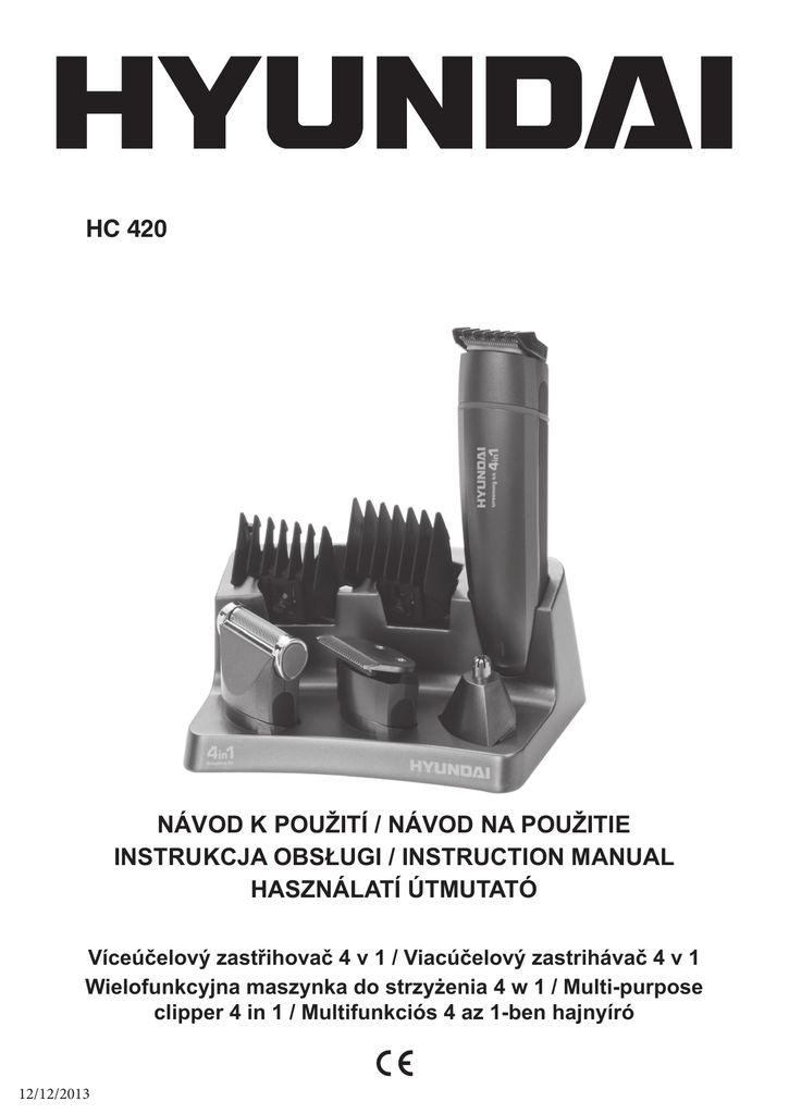 HC 420 NÁVOD K POUŽITÍ / NÁVOD NA POUŽITIE INSTRUKCJA OBSŁUGI / INSTRUCTION MANUAL HASZNÁLATÍ ÚTMUTATÓ Víceúčelový zastřihovač 4 v 1 / Viacúčelový zastrihávač 4 v 1 Wielofunkcyjna maszynka do strzyżenia 4 w 1 / Multi-purpose clipper 4 in 1 / Multifunkciós 4 az 1-ben hajnyíró 12/12/2013 Vážený zákazníku, děkujeme Vám za zakoupení našeho produktu. Před uvedením tohoto přístroje do provozu si velmi pozorně přečtěte návod k obsluze a tento návod spolu se záručním listem, pokladním dokladem a podle možností i s obalem a vnitřním obsahem obalu dobře uschovejte. Všeobecné bezpečnostní pokyny • Tento spotřebič mohou používat děti ve věku 8 let a starší a osoby se sníženými fyzickými, smyslovými či mentálními schopnostmi nebo nedostatkem zkušeností a znalostí, pokud jsou pod dozorem nebo byly poučeny o používání spotřebiče bezpečným způsobem a rozumí případným nebezpečím. Děti si se spotřebičem nesmějí hrát. Čištění a údržbu prováděnou uživatelem nesmějí provádět děti, pokud nejsou starší 8 let a pod dozorem. Děti mladší 8 let se musí držet mimo dosah spotřebiče a jeho přívodu. • Před výměnou příslušenství nebo přístupných části, které se při používání pohybují, před montáží a demontáží, před čištěním nebo údržbou, spotřebič vypněte a odpojte od el. sítě vytažením vidlice adaptéru z el. zásuvky! • Jestliže je napájecí přívod od adaptéru poškozen, musí být přívod nahrazen výrobcem, jeho servisním technikem nebo podobně kvalifikovanou osobou, aby se tak zabránilo vzniku nebezpečné situace. • Vždy odpojte spotřebič od adaptéru, pokud ho necháváte bez dozoru a před montáží, demontáží nebo čištěním. • Nikdy spotřebič nepoužívejte, pokud má poškozený napájecí přívod adaptéru nebo vidlici, pokud nepracuje správně, upadl na zem a poškodil se nebo spadl do vody. V takových případech zaneste spotřebič do odborného servisu k prověření jeho bezpečnosti a správné funkce. • Spotřebič je určen pouze pro použití v domácnostech a podobné účely! Není konstruován pro použití v kadeřnickém salónu nebo pro jiné komerční použití! • Chraňte jej před horkem, přímým slunečním zářením, vlhkostí (v žádném případě jej neponořujte do kapalin) a stykem s ostrými hranami. Nepoužívejte přístroj v případě, že máte vlhké ruce. Jestliže dojde k navlhčení nebo namočení přístroje, okamžitě vytáhněte zástrčku ze zásuvky. Vyvarujte se styku s vodou. • Přístroj nesmí zůstat v provozu bez dozoru. Jestliže musíte pracoviště opustit, vždy přístroj vypněte, resp. vytáhněte zástrčku ze zásuvky (vždy tahejte za zástrčku, nikdy ne za kabel). • Abyste ochránili děti před riziky spojenými s elektrickými přístroji, postarejte se o to, aby kabel nevisel dolů a děti na přístroj nedosáhly. • Pravidelně kontrolujte přístroj a přívodní kabel z hlediska poškození. Jestliže přístroj vykazuje nějakou závadu, neuvádějte jej do provozu. • Neopravujte přístroj vlastními silami, nýbrž vyhledejte autorizovaného opraváře. Abyste eliminovali rizika, nechejte poškozený přívodní kabel nahradit kabelem se stejnými hodnotami a to jen výrobcem, naším servisem pro zákazníky nebo jinou kvalifikovanou osobou. • Používejte jen originální příslušenství. • Respektujte, prosím, následující „Speciální bezpečnostní pokyny pro tento přístroj“. 2 / 36 CZ Speciální bezpečnostní pokyny pro tento přístroj • Nedotýkejte se zastřihovače, pokud spadl do vody. Neprodleně jej vypojte. • Nepoužívejte při koupání či sprchování. • Neumísťujte zastřihovač tam, kde by mohl spadnout či být shozen do vany či umyvadla. Nepokládejte či neupusťte do vody či jiné tekutiny. • Zastřihovač po použití vždy neprodleně vypojte z el. sítě, pokud jej nenabíjíte. • Pokud chcete zastřihovač vyhodit, vypojte jej a vyjměte nabíjecí baterii. Viz sekce Vyjmutí baterie. • VAROVÁNÍ! Abyste snížili riziko popálení, požáru, úrazu el. proudem či zranění osob: - Zastřihovač nikdy nepoužívejte, pokud má poničený kabel či zástrčku, pokud nefunguje správně, pokud spadl na zem či do vody. Zařízení zaneste do autorizovaného servisu k přezkoušení a opravě. - Zastřihovač, kabel či příslušenství držte dále od horkých povrchů. • Nikdy nestrkejte jakýkoliv předmět do otvorů. • Zastřihovač nepoužívejte, pokud je poničen střihač, střihací jednotka či holicí planžeta, mohlo by dojít ke zranění. • Vždy zapojte kabel nejdříve do zastřihovače, poté do el. zásuvky. Při vypojování vypněte vypínačem ON/OFF (dolů), pak teprve vypojte zástrčku ze zásuvky. • Abyste se vyhnuli případnému poničení kabelu, neomotávejte jej kolem zastřihovače. • Zastřihovač nikdy nevystavujte přímému slunci, ani jej neuchovávejte v teplotách nad 60°C. • Zastřihovač je určen pro stříhání pouze lidských vlasů. K jiným účelům jej nepoužívejte. • Zastřihovač, příslušenství a kabel vždy uchovávejte na suchém místě. Ujistěte se, že je z něj vypojen kabel. Popis ovládacích prvků 1 2 3 4 5 6 7 8 9 10 11 12 13 14 15 16 Jednotka zastřihovače Posunovací hlavní vypínač Kontrolka nabíjení Tlačítka pro uvolnění nástavce Zastřihovač kontur Holící strojek Zastřihovač vlasů Nástavec na zastřihování chloupků v nose, uších a na obočí Nástavec zastřihovače kontur (6 mm) Hřebenový nástavec na zastříhování vlasů 20 mm Hřebenový nástavec na zastříhování vlasů 12 mm Odkládací a nabíjecí stojan Adaptér nabíjení Čisticí kartáček Olej na mazání Hřeben 3 / 36 Nabíjení • Před prvním použitím či pokud jste zastřihovač dlo