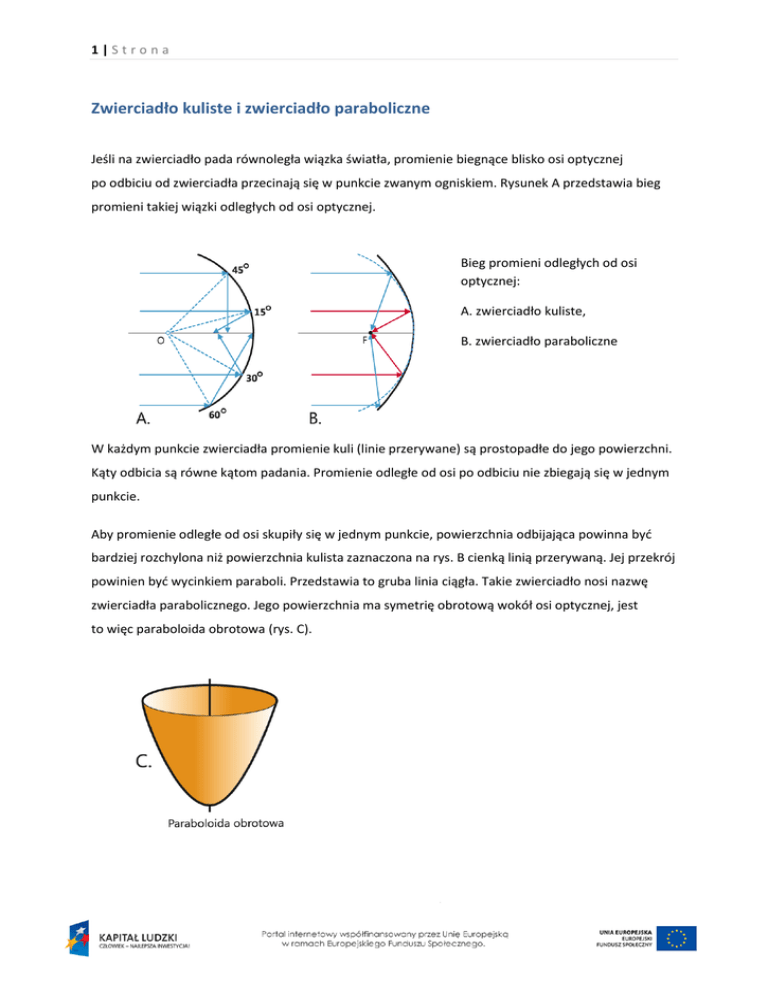 1|Strona Zwierciadło kuliste i zwierciadło paraboliczne Jeśli na zwierciadło pada równoległa wiązka światła, promienie biegnące blisko osi optycznej po odbiciu od zwierciadła przecinają się w punkcie zwanym ogniskiem. Rysunek A przedstawia bieg promieni takiej wiązki odległych od osi optycznej. Bieg promieni odległych od osi optycznej: A. zwierciadło kuliste, B. zwierciadło paraboliczne W każdym punkcie zwierciadła promienie kuli (linie przerywane) są prostopadłe do jego powierzchni. Kąty odbicia są równe kątom padania. Promienie odległe od osi po odbiciu nie zbiegają się w jednym punkcie. Aby promienie odległe od osi skupiły się w jednym punkcie, powierzchnia odbijająca powinna być bardziej rozchylona niż powierzchnia kulista zaznaczona na rys. B cienką linią przerywaną. Jej przekrój powinien być wycinkiem paraboli. Przedstawia to gruba linia ciągła. Takie zwierciadło nosi nazwę zwierciadła parabolicznego. Jego powierzchnia ma symetrię obrotową wokół osi optycznej, jest to więc paraboloida obrotowa (rys. C). 2|Strona Zwierciadła paraboliczne stosuje się m.in. do skupiania promieni wiązki świetlnej w celu skonstruowania tzw. kuchni słonecznej oraz w reflektorach pojazdów mechanicznych – wiązkę rozbieżną z żarówki zamienia się wówczas na wiązkę równoległą. Bieg promieni w reflektorze parabolicznym przedstawia rys. D.