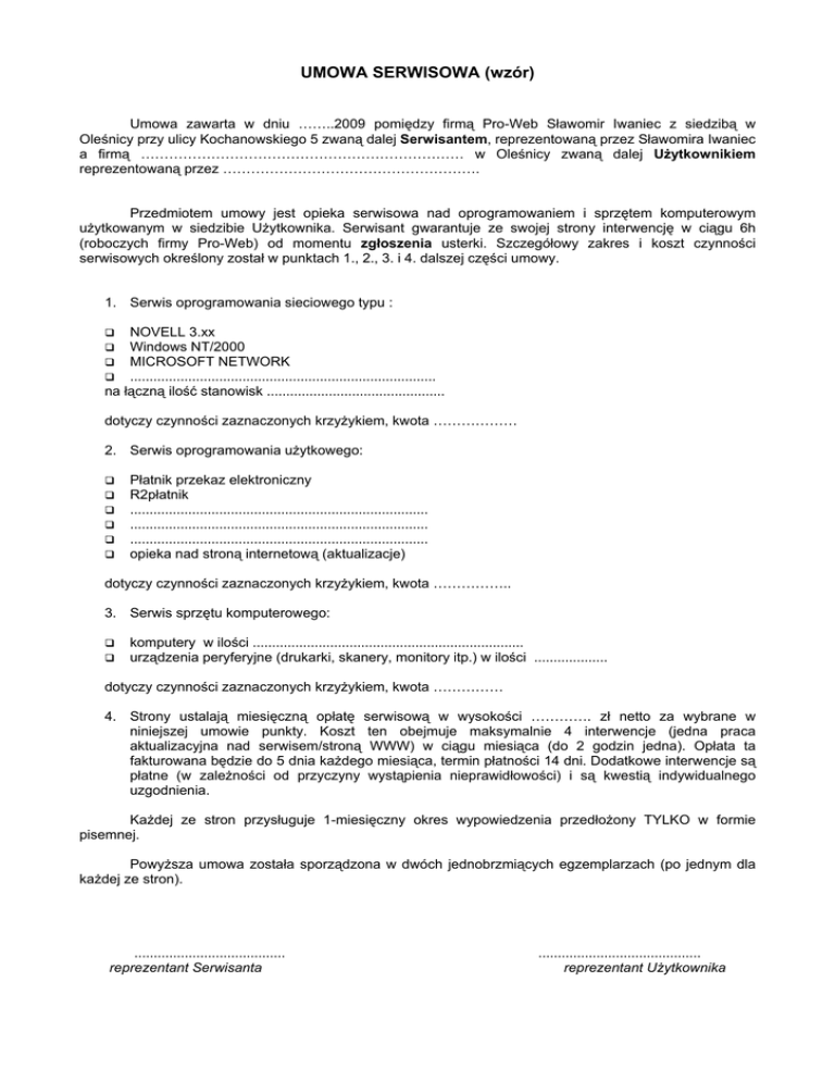 UMOWA SERWISOWA (wzór) Umowa zawarta w dniu ……..2009 pomiędzy firmą Pro-Web Sławomir Iwaniec z siedzibą w Oleśnicy przy ulicy Kochanowskiego 5 zwaną dalej Serwisantem, reprezentowaną przez Sławomira Iwaniec a firmą …………………………………………………………… w Oleśnicy zwaną dalej Użytkownikiem reprezentowaną przez ………………………………………………. Przedmiotem umowy jest opieka serwisowa nad oprogramowaniem i sprzętem komputerowym użytkowanym w siedzibie Użytkownika. Serwisant gwarantuje ze swojej strony interwencję w ciągu 6h (roboczych firmy Pro-Web) od momentu zgłoszenia usterki. Szczegółowy zakres i koszt czynności serwisowych określony został w punktach 1., 2., 3. i 4. dalszej części umowy. 1. Serwis oprogramowania sieciowego typu : NOVELL 3.xx Windows NT/2000 MICROSOFT NETWORK ............................................................................... na łączną ilość stanowisk .............................................. dotyczy czynności zaznaczonych krzyżykiem, kwota ……………… 2. Serwis oprogramowania użytkowego: Płatnik przekaz elektroniczny R2płatnik ............................................................................. ............................................................................. ............................................................................. opieka nad stroną internetową (aktualizacje) dotyczy czynności zaznaczonych krzyżykiem, kwota …………….. 3. Serwis sprzętu komputerowego: komputery w ilości ...................................................................... urządzenia peryferyjne (drukarki, skanery, monitory itp.) w ilości ................... dotyczy czynności zaznaczonych krzyżykiem, kwota …………… 4. Strony ustalają miesięczną opłatę serwisową w wysokości …………. zł netto za wybrane w niniejszej umowie punkty. Koszt ten obejmuje maksymalnie 4 interwencje (jedna praca aktualizacyjna nad serwisem/stroną WWW) w ciągu miesiąca (do 2 godzin jedna). Opłata ta fakturowana będzie do 5 dnia każdego miesiąca, termin płatności 14 dni. Dodatkowe interwencje są płatne (w zależności od przyczyny wystąpienia nieprawidłowości) i są kwestią indywidualnego uzgodnienia. Każdej ze stron przysługuje 1-miesięczny okres wypowiedzenia przedłożony TYLKO w formie pisemnej. Powyższa umowa została sporządzona w dwóch jednobrzmiących egzemplarzach (po jednym dla każdej ze stron). ....................................... reprezentant Serwisanta .......................................... reprezentant Użytkownika