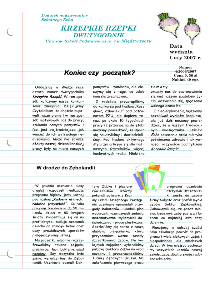 Dodatek nadzwyczajny Szkolnego Echa KRZEPKIE RZEPKI DWUTYGODNIK Uczniów Szkoły Podstawowej nr 4 w Międzyrzeczu Data wydania Luty 2007 r. Koniec czy początek? Oddajemy w Wasze ręce ostatni numer dwutygodnika Krzepkie Rzepki. W ten sposób kończymy nasze konkursowe zmagania. Dziękujemy Czytelnikom, że chętnie kupowali nasze pismo i w ten sposób motywowali nas do pracy, szukania nowych pomysłów i (co jest najtrudniejsze jak wiecie) do ich wytrwałego realizowania. Może nie zawsze efekty naszej dziennikarskiej pracy były na miarę naszych pomysłów i zamiarów, ale cieszymy się z tego, co udało nam się zrealizować. Z radością przystąpiliśmy do konkursu pod hasłem „Rusz głową, człowieku!” pod patronatem PZU, ale dopiero teraz, po około 10 tygodniach pracy (z przerwą na święta!), możemy powiedzieć, że sporo się nauczyliśmy i dowiedzieliśmy. Pod hasłem aktywnego stylu życia kryje się dla nas i naszych Czytelników więcej konkretnych treści. Niektóre Numer 4/2006/2007 Cena 0, 50 zł Nakład 40 egz. tematy zmusiły nas do zastanowienia się nad naszym sposobem życia, odżywiania się, spędzania wolnego czasu itp. Z niecierpliwością będziemy oczekiwać wyników konkursu, ale już dziś możemy powiedzieć, że w naszym tradycyjnym miesięczniku Szkolne Echo powstanie stała rubryka poświęcona zdrowiu i aktywności, oczywiście pod tytułem Krzepkie Rzepki. W drodze do Zębolandii W grudniu uczniowie klasy drugiej rozpoczęli realizację programu higieny jamy ustnej pod hasłem „Radosny uśmiech, radosna przyszłość”. Co roku program ten dociera do 50 milionów dzieci w 80 krajach świata. Koncentruje się on na profilaktyce, buduje szacunek dziecka do samego siebie oraz uczy prawidłowych sposobów pielęgnacji jamy ustnej. Na początku wspólnie rozszyfrowaliśmy trudne pojęcia: próchnica, fluor, bakterie, osad nazębny. Gdy wszystko było jasne, wyruszyliśmy do Zębolandii. Uczniowie poznali Dok- tora Ząbka i pięcioro rówieśników, którzy pokonali potwory z Krainy Osadu Nazębnego. Następnie uczniowie opowiadali przygody bohaterów, układali plan wydarzeń, rozwiązywali zadania matematyczne, wykonywali doświadczenia i prace plastyczne. Spotkaliśmy się także z naszą ulubiona pielęgniarką, która przypomniała ważne zasady szczotkowania zębów. Na kolejnych zajęciach wykonaliśmy pułapkę Doktora Ząbka na osad nazębny i przeprowadziliśmy Turniej Zębowych Drużyn. Na zakończenie pierwszego etapu programu uczniowie otrzymali szczoteczki, pastę do zębów firmy Colgate oraz grafik mycia zębów Doktor Ząbkowskiej. Zobowiązali się, że przez miesiąc będą myć zęby pastą z fluorem co najmniej dwa razy dziennie. Planujemy w dalszej części roku szkolnego powrót do programu i wiele ciekawych zajęć i niespodzianek dla młodszych dzieci. W tym miejscu zachęcamy wszystkich uczniów naszej szkoły, żeby dbali o swoje radosne uśmiechy. Str. 2 KRZEPKIE RZEPKI Czwartoklasiści po feriach reportaż Wyczekiwane przez wszystkich ferie przyszły i odeszły – wróciła szara szkolna rzeczywistość. Co na to uczniowie? Czy przyjemnie spędzili dwa tygodnie wolnego? Czy tylko siedzieli znudzeni przed telewizorem lub ekranem komputera? Ilona nas zapewnia, że często spacerowała z mamą i młodszym bratem nad jezioro, grała w różne zabawy, ona na tych feriach nie nudziła się, o tak, jej mama potrafi wymyślać ciekawe rzeczy, żeby się człowiek nie nudził. Patryk – mimo choroby, która go dopadła w czasie ferii – zapewnia nas, że również wykorzystał zimową aurę, żeby z tatą ulepić dużego bałwana. Twierdzi, że śniegowy olbrzym miał 4 metry wysokości, ale to już chyba jego fantazja; widać, że nikt z jego kolegów w to nie wierzy. Kiedy wreszcie spadł śnieg, Karol razem z bratem zjeżdżał na sankach z ogromnej górki (w Bobowicku podobno jest taka). Kiedy głos zabrał Adrian, dowiedziałyśmy się, że w czasie ferii – chociaż to wolne od szkoły - razem z kolegami pod opieką pani Dudy roze- grali pięć meczów w piłkę nożną. Reprezentowali nasza szkołę w turnieju imienia T. Mikuły. Czy są zadowoleni z rozgrywek? Raczej nie, bo byli przedostatni… Koledzy wykrzykują, że przecież frajda była, bo spotkali się z innymi drużynami, pograli, zdobyli doświadczenie; teraz wiedzą, że dobrze by było więcej trenować, jeśli chce się odnosić sukcesy. Za rok znowu spróbują i kto wie… No dobrze – mówimy ale czy nikt z Was nie był poza Międzyrzeczem, na przykład w górach? Zimą wszyscy wyjeżdżają w góry. Piotr szybko podnosi rękę, wyrywa się do mówienia. Tak, on pojechał na trzy dni do Szklarskiej Poręby. Daleka podróż, chyba z osiem godzin jechali, bo na drodze był śnieg i ślisko. Z radością w oczach opowiada nam teraz, jak jeździł na nartach, było po prostu super! Ale niektórzy narciarze, chociaż starsi od niego, zachowywali się nierozważnie, a pewien pan wypadł z krzesełka na wyciągu. Martyna też chce nam opowiedzieć o swoich feriach. Niestety nie pojechała w góry, bo nie było śniegu. Ale za to była kilka dni w Niemczech! Zwiedzała Berlin, była w fantastycznym ośrodku przyrody tropikalnej, gdzie mogła podziwiać niezwykłe rośliny, ich egzotyczne kształty i barwy. Ania też może się pochwalić swoją aktywnością w czasie ferii - była na basenie w Poznaniu i na łyżwach w Gorzowie. Magda cały tydzień spędziła w pięknym Krakowie! Później była u rodziny na wsi kieleckiej, były zabawy na świeżym powietrzu, zimowe szaleństwo i prawdziwy kulig. Kilka osób podnosi ręce, wszyscy naraz zaczynają przypominać różne kuligi, z traktorem, z końmi, a Karol kwituje te zachwyty krótkim stwierdzeniem:” Też zrobiliśmy kulig, ale jechało się po piachu…” Dzwonek na przerwę przerywa nasze spotkanie, ale też dyskusja rozgrzała jej uczestników i pewnie koledzy z klasy będą sobie mieli jeszcze do po