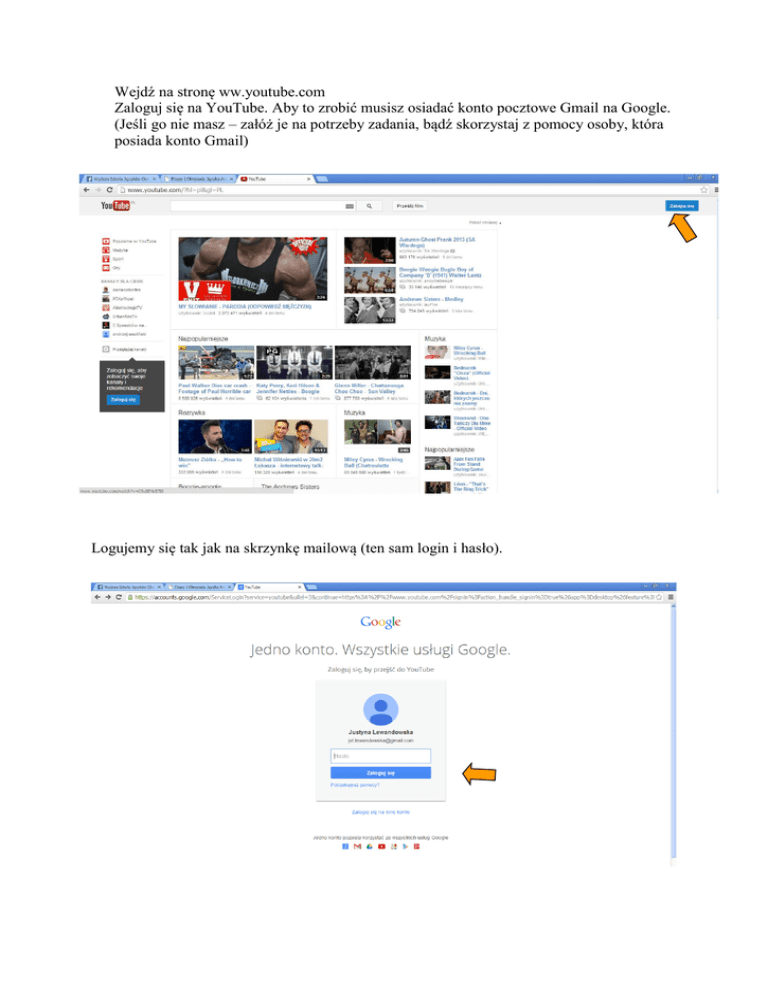 Wejdź na stronę ww.youtube.com Zaloguj się na YouTube. Aby to zrobić musisz osiadać konto pocztowe Gmail na Google. (Jeśli go nie masz – załóż je na potrzeby zadania, bądź skorzystaj z pomocy osoby, która posiada konto Gmail) Logujemy się tak jak na skrzynkę mailową (ten sam login i hasło). Po załogowaniu się znów widzimy stronę startową YouTube. Klikamy na „Prześlij film” Następnie klikamy na „Wybierz pliki do przesłania”. W tym miejscu znajduje się także ustawienie dotyczące statusu filmu: Publiczny, Niepubliczy lub Prywatny. Możesz wybrać dowolny z nich (w trzecim wypadku należy go udostępnić użytkownikowi: [email protected]). Klikając na „Wybierz pliki do przesłania” otwiera się nam okno wyszukiwania i wybierania pliku z dysku. Pamiętaj aby PLIK Z FILMEM NAZWAĆ: nazwisko ucznia- temat filmu. Wybieramy plik, w którym jest nasz film i klikamy na „Otwórz”. Film zacznie się załączać. Kiedy zostanie pomyślnie załączony i przesyłanie zostanie zakończone należy skopiować link do naszego filmu. Następnie skopiowany link należy zgłosić na stronie rejestracja.ojag.wsjo.pl/filmy w terminie od 02.03.2015 (od godziny 10:00) do 12.03.2015 r. (do godziny 10:00) Na końcu należy wylogować się z serwisu YouTube.