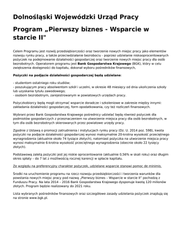 Dolnośląski Wojewódzki Urząd Pracy Program „Pierwszy biznes - Wsparcie w starcie II" Celem Programu jest rozwój przedsiębiorczości oraz tworzenie nowych miejsc pracy jako elementów rozwoju rynku pracy, a także przeciwdziałanie bezrobociu - poprzez udzielanie niskooprocentowanych pożyczek na podejmowanie działalności gospodarczej oraz tworzenie nowych miejsc pracy dla osób bezrobotnych. Operatorem programu jest Bank Gospodarstwa Krajowego (BGK), który w celu zwiększenia dostępności do kapitału, dokonał wyboru pośredników finansowych, Pożyczki na podjęcie działalności gospodarczej będą udzielane: - studentom ostatniego roku studiów; - poszukującym pracy absolwentom szkół i uczelni, w okresie 48 miesięcy od dnia ukończenia szkoły lub uzyskania tytułu zawodowego; - osobom bezrobotnym, zarejestrowanym w powiatowych urzędach pracy. Pożyczkobiorcy będą mogli otrzymać wsparcie doradcze i szkoleniowe w zakresie między innymi: zakładania działalności gospodarczej, form opodatkowania, czy też rozliczeń finansowych. Wybrani przez Bank Gospodarstwa Krajowego pośrednicy udzielać będą również pożyczek dla podmiotów gospodarczych z przeznaczeniem na utworzenie miejsca pracy dla osób bezrobotnych, w tym dla osób bezrobotnych skierowanych przez powiatowe urzędy pracy. Zgodnie z Ustawą o promocji zatrudnienia i instytucjach rynku pracy (Dz. U. 2014 poz. 598), kwota pożyczki na podjęcie działalności gospodarczej wynosi maksymalnie 20-krotna wysokość przeciętnego wynagrodzenia (aktualnie około 74 tysiące złotych), natomiast pożyczka na utworzenie miejsca pracy wynosi maksymalnie 6-krotna wysokość przeciętnego wynagrodzenia (obecnie około 22 tysięcy złotych). Podstawową zaletą pożyczki jest jej niskie oprocentowanie (aktualnie 0,56% w skali roku) oraz długim okres spłaty – do 7 lat z możliwością rocznej karencji w spłacie kapitału. Ze względu na preferencyjny charakter pożyczek, udzielane wsparcie stanowi pomoc de minimis. Środki na uruchomienie programu na rzecz rozwoju przedsiębiorczości i tworzenia warunków dla powstania nowych miejsc pracy pod nazwą „Pierwszy biznes – Wsparcie w starcie II” pochodzą z Funduszu Pracy. Na lata 2014 – 2016 Bank Gospodarstwa Krajowego dysponuje kwotą 120 milionów złotych. Program będzie realizowany do 2021 roku. Lista wybranych pośredników finansowych oraz szczegółowe zasady udzielania pożyczek znajdują się na stronie www.bgk.pl.