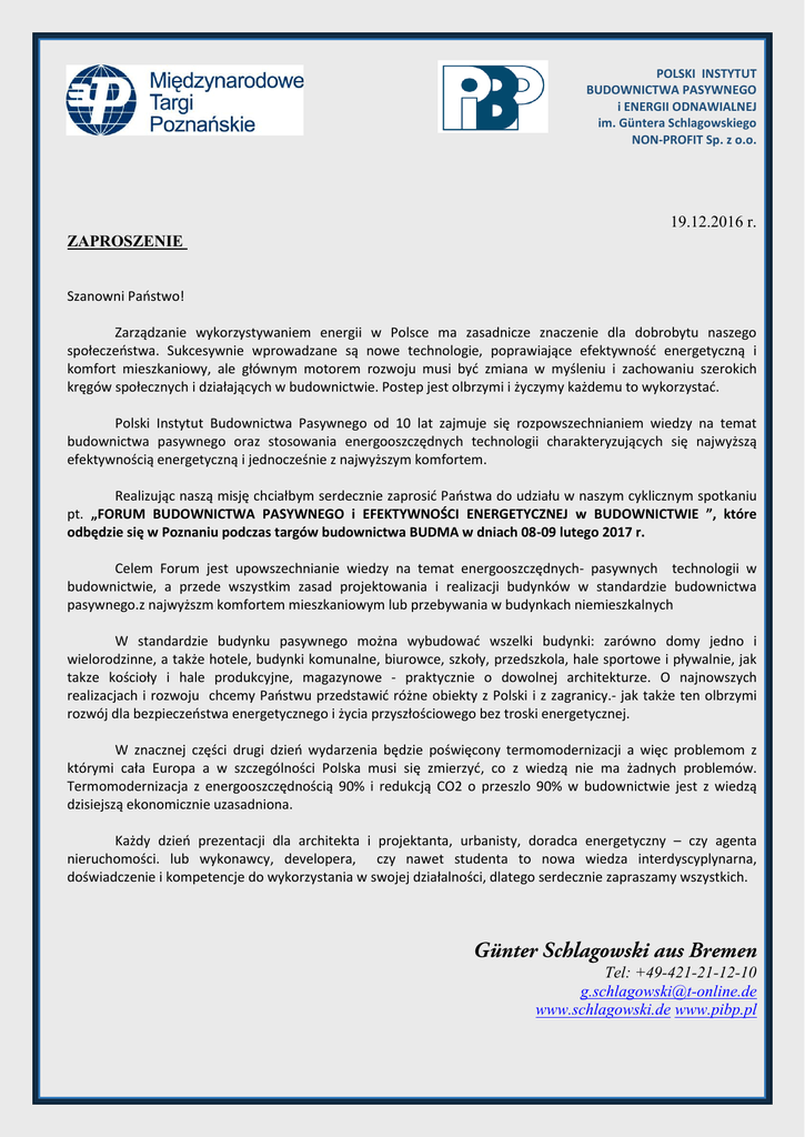 POLSKI INSTYTUT BUDOWNICTWA PASYWNEGO i ENERGII ODNAWIALNEJ im. Güntera Schlagowskiego NON-PROFIT Sp. z o.o. 19.12.2016 r. ZAPROSZENIE Szanowni Państwo! Zarządzanie wykorzystywaniem energii w Polsce ma zasadnicze znaczenie dla dobrobytu naszego społeczeństwa. Sukcesywnie wprowadzane są nowe technologie, poprawiające efektywność energetyczną i komfort mieszkaniowy, ale głównym motorem rozwoju musi być zmiana w myśleniu i zachowaniu szerokich kręgów społecznych i działających w budownictwie. Postep jest olbrzymi i życzymy każdemu to wykorzystać. Polski Instytut Budownictwa Pasywnego od 10 lat zajmuje się rozpowszechnianiem wiedzy na temat budownictwa pasywnego oraz stosowania energooszczędnych technologii charakteryzujących się najwyższą efektywnością energetyczną i jednocześnie z najwyższym komfortem. Realizując naszą misję chciałbym serdecznie zaprosić Państwa do udziału w naszym cyklicznym spotkaniu pt. „FORUM BUDOWNICTWA PASYWNEGO i EFEKTYWNOŚCI ENERGETYCZNEJ w BUDOWNICTWIE ”, które odbędzie się w Poznaniu podczas targów budownictwa BUDMA w dniach 08-09 lutego 2017 r. Celem Forum jest upowszechnianie wiedzy na temat energooszczędnych- pasywnych technologii w budownictwie, a przede wszystkim zasad projektowania i realizacji budynków w standardzie budownictwa pasywnego.z najwyższm komfortem mieszkaniowym lub przebywania w budynkach niemieszkalnych W standardzie budynku pasywnego można wybudować wszelki budynki: zarówno domy jedno i wielorodzinne, a także hotele, budynki komunalne, biurowce, szkoły, przedszkola, hale sportowe i pływalnie, jak takze kościoły i hale produkcyjne, magazynowe - praktycznie o dowolnej architekturze. O najnowszych realizacjach i rozwoju chcemy Państwu przedstawić różne obiekty z Polski i z zagranicy.- jak także ten olbrzymi rozwój dla bezpieczeństwa energetycznego i życia przyszłościowego bez troski energetycznej. W znacznej części drugi dzień wydarzenia będzie poświęcony termomodernizacji a więc problemom z którymi cała Europa a w szczególności Polska musi się zmierzyć, co z wiedzą nie ma żadnych problemów. Termomodernizacja z energooszczędnością 90% i redukcją CO2 o przeszlo 90% w budownictwie jest z wiedzą dzisiejszą ekonomicznie uzasadniona. Każdy dzień prezentacji dla architekta i projektanta, urbanisty, doradca energetyczny – czy agenta nieruchomości. lub wykonawcy, developera, czy nawet studenta to nowa wiedza interdyscyplynarna, doświadczenie i kompetencje do wykorzystania w swojej działalności, dlatego serdecznie zapraszamy wszystkich. Tel: +49-421-21-12-10 [email protected] www.schlagowski.de www.pibp.pl