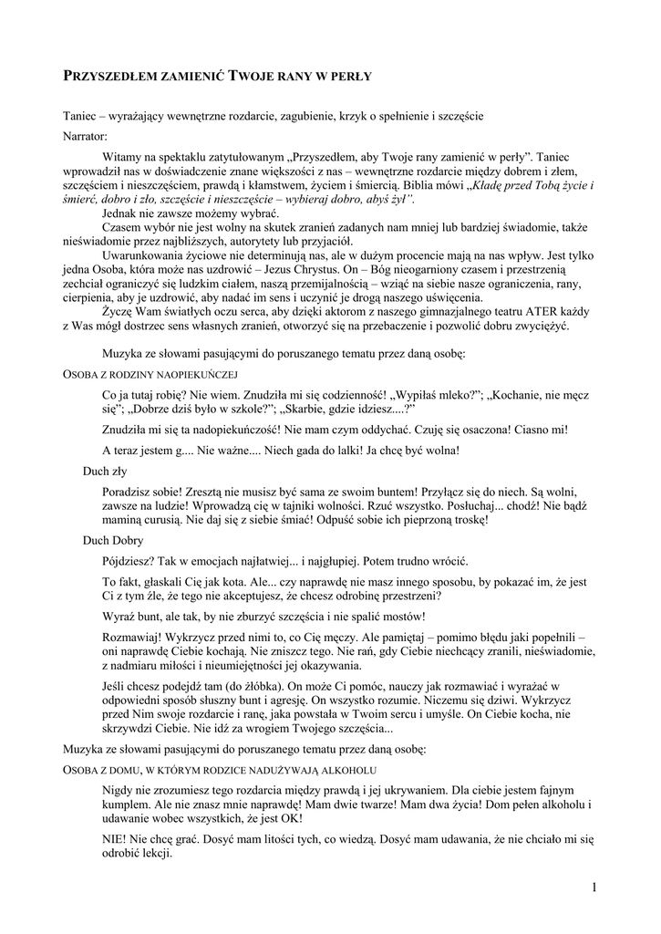 PRZYSZEDŁEM ZAMIENIĆ TWOJE RANY W PERŁY Taniec – wyrażający wewnętrzne rozdarcie, zagubienie, krzyk o spełnienie i szczęście Narrator: Witamy na spektaklu zatytułowanym „Przyszedłem, aby Twoje rany zamienić w perły”. Taniec wprowadził nas w doświadczenie znane większości z nas – wewnętrzne rozdarcie między dobrem i złem, szczęściem i nieszczęściem, prawdą i kłamstwem, życiem i śmiercią. Biblia mówi „Kładę przed Tobą życie i śmierć, dobro i zło, szczęście i nieszczęście – wybieraj dobro, abyś żył”. Jednak nie zawsze możemy wybrać. Czasem wybór nie jest wolny na skutek zranień zadanych nam mniej lub bardziej świadomie, także nieświadomie przez najbliższych, autorytety lub przyjaciół. Uwarunkowania życiowe nie determinują nas, ale w dużym procencie mają na nas wpływ. Jest tylko jedna Osoba, która może nas uzdrowić – Jezus Chrystus. On – Bóg nieogarniony czasem i przestrzenią zechciał ograniczyć się ludzkim ciałem, naszą przemijalnością – wziąć na siebie nasze ograniczenia, rany, cierpienia, aby je uzdrowić, aby nadać im sens i uczynić je drogą naszego uświęcenia. Życzę Wam światłych oczu serca, aby dzięki aktorom z naszego gimnazjalnego teatru ATER każdy z Was mógł dostrzec sens własnych zranień, otworzyć się na przebaczenie i pozwolić dobru zwyciężyć. Muzyka ze słowami pasującymi do poruszanego tematu przez daną osobę: OSOBA Z RODZINY NAOPIEKUŃCZEJ Co ja tutaj robię? Nie wiem. Znudziła mi się codzienność! „Wypiłaś mleko?”; „Kochanie, nie męcz się”; „Dobrze dziś było w szkole?”; „Skarbie, gdzie idziesz....?” Znudziła mi się ta nadopiekuńczość! Nie mam czym oddychać. Czuję się osaczona! Ciasno mi! A teraz jestem g.... Nie ważne.... Niech gada do lalki! Ja chcę być wolna! Duch zły Poradzisz sobie! Zresztą nie musisz być sama ze swoim buntem! Przyłącz się do niech. Są wolni, zawsze na ludzie! Wprowadzą cię w tajniki wolności. Rzuć wszystko. Posłuchaj... chodź! Nie bądź maminą curusią. Nie daj się z siebie śmiać! Odpuść sobie ich pieprzoną troskę! Duch Dobry Pójdziesz? Tak w emocjach najłatwiej... i najgłupiej. Potem trudno wrócić. To fakt, głaskali Cię jak kota. Ale... czy naprawdę nie masz innego sposobu, by pokazać im, że jest Ci z tym źle, że tego nie akceptujesz, że chcesz odrobinę przestrzeni? Wyraź bunt, ale tak, by nie zburzyć szczęścia i nie spalić mostów! Rozmawiaj! Wykrzycz przed nimi to, co Cię męczy. Ale pamiętaj – pomimo błędu jaki popełnili – oni naprawdę Ciebie kochają. Nie zniszcz tego. Nie rań, gdy Ciebie niechcący zranili, nieświadomie, z nadmiaru miłości i nieumiejętności jej okazywania. Jeśli chcesz podejdź tam (do żłóbka). On może Ci pomóc, nauczy jak rozmawiać i wyrażać w odpowiedni sposób słuszny bunt i agresję. On wszystko rozumie. Niczemu się dziwi. Wykrzycz przed Nim swoje rozdarcie i ranę, jaka powstała w Twoim sercu i umyśle. On Ciebie kocha, nie skrzywdzi Ciebie. Nie idź za wrogiem Twojego szczęścia... Muzyka ze słowami pasującymi do poruszanego tematu przez daną osobę: OSOBA Z DOMU, W KTÓRYM RODZICE NADUŻYWAJĄ ALKOHOLU Nigdy nie zrozumiesz tego rozdarcia między prawdą i jej ukrywaniem. Dla ciebie jestem fajnym kumplem. Ale nie znasz mnie naprawdę! Mam dwie twarze! Mam dwa życia! Dom pełen alkoholu i udawanie wobec wszystkich, że jest OK! NIE! Nie chcę grać. Dosyć mam litości tych, co wiedzą. Dosyć mam udawania, że nie chciało mi się odrobić lekcji. 1 Ja nie mam gdzie ich odrobić!!! Nie mam kiedy!!! Nie mam jak!!! Uciekam z miejsca mojego piekła i śnię o prawdziwym domu, bezpiecznym, przytulnym, przyjaznym! Nauczyciele narzekają...., że jestem butny, że nieuk, że przeszkadzam na lekcjach! Ja nie chcę, ale czasem nie mieszczę już w sobie tej goryczy. Chce ją wykrzyczeć!!! Gdy wracam do domu...., jest piekło. Uciekam!!! Duch zły II Śnij!!! Złudzenia!!! Marzenia.....! Nigdy twój koszmar się nie skończy. To twoja wina, że oni piją. To przez ciebie. Nauczyciele też mają rację. Jesteś nikim dla nich. Weź życie w swoje ręce. Ucieknij z domu! Zbuntuj się w szkole! Zacznij tak samo jak rodzice, jak ich kumple, jak niektórzy twoi koledzy. Nie ma co się ukrywać. Zacznij jak oni, to zapomnisz o swoim bólu. Zemścij się na tych, którzy na ciebie krzyczą, zemścij się na tych, co stworzyli twoje piekło. Utop swoje nieszczęście. Chodź pomogę ci... Duch Dobry II Nie słuchaj tych myśli. To nie twoja wina. Nie rób nikomu na złość. Pomyśl, przecież wtedy sam siebie jeszcze bardziej skrzywdzisz.... piją..., bo są poranieni... od dzieciństwa, jak ty.... Możesz im pomóc się zmienić. Chodź, zobacz – (wskazuje na żłóbek) ON po to się narodził. Powiedz JEZUSOWI o swoim bólu. ON Cię umocni, wypełni wiarą i nadzieją. Nie bój się! Odrzuć myśli, które pchają Cię w większe poniżenie i zło, którego potem nie cofniesz. Muzyka ze słowami pasującymi do poruszanego tematu przez daną osobę OSOBA WYKORZYSTANA SEKSUALNIE Wszyscy mówią...: „jaka grzeczna ułożona dziewczynka”... ale inni, kiedy indziej: „jaka przewrażliwiona”...; inni: „cicha”....; jeszcze innym razem słyszę: „jaka wybuchowa, krnąbrna!” A ja jestem jak wulkan gotowa do wybuchu...! tej krzywdy nie da się wymazać z pamięci! Zniszczył moje zaufanie. Odebrał poczucie bezpieczeństwa. Czuję się jak śmieć..., jak zero... Ale nikt o tym nie wie. Tajemnica okryta milczeniem.... Duch zły To twoja wina! Twoja! Jesteś winna...!....! milczysz..., nie mówisz nikomu..., bo nikt nie uwierzy! Tak! Nikt ci nie uwierzy! Osoba Boże! Duch zły: Bóg!? Gdzie był wtedy!? Nie obchodziłaś Go! Jest nieczuły i głuchy na twoje wołanie. Gniewa się na ciebie. Brzydzi się tobą! Osoba Boże! Duch Dobry Nie bój się. To nie jest prawda. On Ciebie kocha. Wtedy też był, chronił 