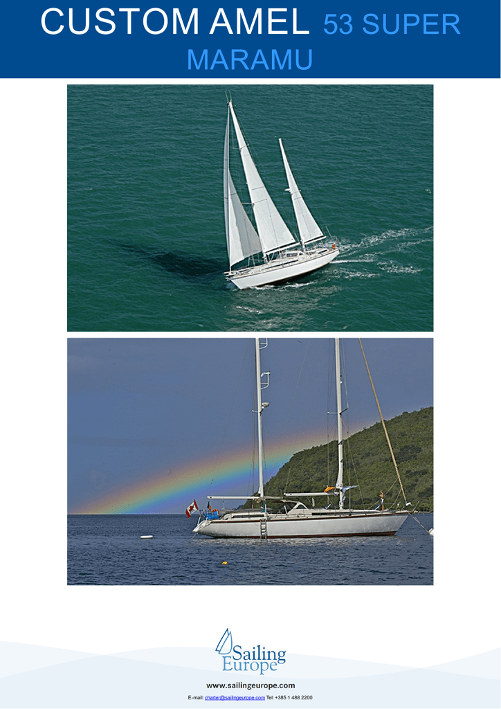 CUSTOM AMEL MARAMU E-mail: [email protected] Tel: +385 1 488 2200 53 SUPER CUSTOM AMEL MARAMU E-mail: [email protected] Tel: +385 1 488 2200 53 SUPER CUSTOM AMEL 53 SUPER MARAMU Tehnical data Tutaj znajdziesz podstawowe informacje na temat naszych łodzi typu Custom Amel 53 Super Maramu. Inne specyficzne parametry łodzi, jak typ ŻĄGLI i wyposażenie są zmienne w zależności od typu łodzi. Z tego powodu radzimy szukać konkretnej łodzi Custom Amel 53 Super Maramu w naszym katalogu, zgodnie z waszymi upodobaniami oraz miejscami, które planujecie odwiedzić. kabin Składane łóżko dodatkowe Długość Szerokość pokładu Zanurzenie Pojemność wodna Pojemność silnika Silnik Toalety 2+2 4 16,15 m 4,60 m 2,01 m 1000,00 l 600,00 l 100 HP 2 Szczegóły wyglądu zewnętrznego łodzi, jej wyposażenia wewnątrz i układu kabin mogą w niektórych przypadkach różnić się od szczegółów przedstawionych na fotografiach. E-mail: [email protected] Tel: +385 1 488 2200