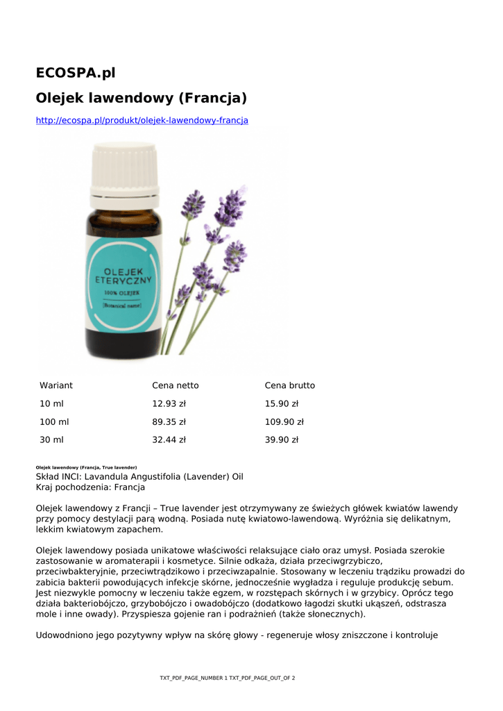 ECOSPA.pl Olejek lawendowy (Francja) http://ecospa.pl/produkt/olejek-lawendowy-francja Wariant Cena netto Cena brutto 10 ml 12.93 zł 15.90 zł 100 ml 89.35 zł 109.90 zł 30 ml 32.44 zł 39.90 zł Olejek lawendowy (Francja, True lavender) Skład INCI: Lavandula Angustifolia (Lavender) Oil Kraj pochodzenia: Francja Olejek lawendowy z Francji – True lavender jest otrzymywany ze świeżych główek kwiatów lawendy przy pomocy destylacji parą wodną. Posiada nutę kwiatowo-lawendową. Wyróżnia się delikatnym, lekkim kwiatowym zapachem. Olejek lawendowy posiada unikatowe właściwości relaksujące ciało oraz umysł. Posiada szerokie zastosowanie w aromaterapii i kosmetyce. Silnie odkaża, działa przeciwgrzybiczo, przeciwbakteryjnie, przeciwtrądzikowo i przeciwzapalnie. Stosowany w leczeniu trądziku prowadzi do zabicia bakterii powodujących infekcje skórne, jednocześnie wygładza i reguluje produkcję sebum. Jest niezwykle pomocny w leczeniu także egzem, w rozstępach skórnych i w grzybicy. Oprócz tego działa bakteriobójczo, grzybobójczo i owadobójczo (dodatkowo łagodzi skutki ukąszeń, odstrasza mole i inne owady). Przyspiesza gojenie ran i podrażnień (także słonecznych). Udowodniono jego pozytywny wpływ na skórę głowy - regeneruje włosy zniszczone i kontroluje TXT_PDF_PAGE_NUMBER 1 TXT_PDF_PAGE_OUT_OF 2 wydzielanie łoju. Masaże z olejkiem lawendowym są pomocne w reumatyzmie, osłabieniu, czy obrzękach kończyn. Zastosowanie: Może być stosowany do masażu i kąpieli. Warto użyć go w kąpieli aromaterapeutycznej, która zadziała odprężająco, do masażu ciała, ale także do masażu głowy w okolicach skroni. Jako dodatek do toników, kremów i innych kosmetyków. Szczególnie polecany do pielęgnacji skóry wrażliwej i podrażnionej. Wykazuje działanie antyseptyczne, reguluje wydzielanie serum i pomocny w leczeniu drobnych ran. Polecany także do moczenia stóp, zimnego kompresu (na czoło lub kark), często dodawany do olejów bazowych. Może być używany do mieszanki olejków eterycznych, a także jako dodatek do płynu do płukania. Dobrze się komponuje z olejkiem: Cytrynowym, cyprysowym, z drzewa herbacianego, z rozmarynowym, cydrowym, eukaliptusowym, z grejpfrutowym i miętowym. TXT_PDF_PAGE_NUMBER 2 TXT_PDF_PAGE_OUT_OF 2