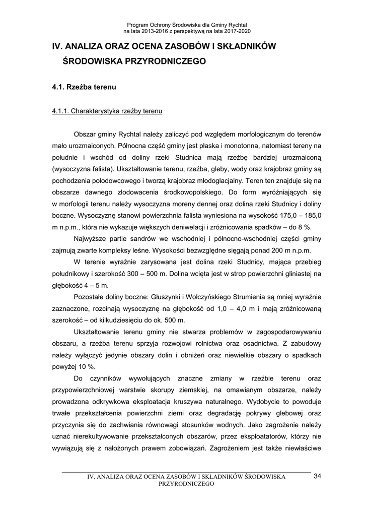 Program Ochrony Środowiska dla Gminy Rychtal na lata 2013-2016 z perspektywą na lata 2017-2020 IV. ANALIZA ORAZ OCENA ZASOBÓW I SKŁADNIKÓW ŚRODOWISKA PRZYRODNICZEGO 4.1. Rzeźba terenu 4.1.1. Charakterystyka rzeźby terenu Obszar gminy Rychtal należy zaliczyć pod względem morfologicznym do terenów mało urozmaiconych. Północna część gminy jest płaska i monotonna, natomiast tereny na południe i wschód od doliny rzeki Studnica mają rzeźbę bardziej urozmaiconą (wysoczyzna falista). Ukształtowanie terenu, rzeźba, gleby, wody oraz krajobraz gminy są pochodzenia polodowcowego i tworzą krajobraz młodoglacjalny. Teren ten znajduje się na obszarze dawnego zlodowacenia środkowopolskiego. Do form wyróżniających się w morfologii terenu należy wysoczyzna moreny dennej oraz dolina rzeki Studnicy i doliny boczne. Wysoczyznę stanowi powierzchnia falista wyniesiona na wysokość 175,0 – 185,0 m n.p.m., która nie wykazuje większych deniwelacji i zróżnicowania spadków – do 8 %. Najwyższe partie sandrów we wschodniej i północno-wschodniej części gminy zajmują zwarte kompleksy leśne. Wysokości bezwzględne sięgają ponad 200 m n.p.m. W terenie wyraźnie zarysowana jest dolina rzeki Studnicy, mająca przebieg południkowy i szerokość 300 – 500 m. Dolina wcięta jest w strop powierzchni gliniastej na głębokość 4 – 5 m. Pozostałe doliny boczne: Głuszynki i Wołczyńskiego Strumienia są mniej wyraźnie zaznaczone, rozcinają wysoczyznę na głębokość od 1,0 – 4,0 m i mają zróżnicowaną szerokość – od kilkudziesięciu do ok. 500 m. Ukształtowanie terenu gminy nie stwarza problemów w zagospodarowywaniu obszaru, a rzeźba terenu sprzyja rozwojowi rolnictwa oraz osadnictwa. Z zabudowy należy wyłączyć jedynie obszary dolin i obniżeń oraz niewielkie obszary o spadkach powyżej 10 %. Do czynników wywołujących znaczne zmiany w rzeźbie terenu oraz przypowierzchniowej warstwie skorupy ziemskiej, na omawianym obszarze, należy prowadzona odkrywkowa eksploatacja kruszywa naturalnego. Wydobycie to powoduje trwałe przekształcenia powierzchni ziemi oraz degradację pokrywy glebowej oraz przyczynia się do zachwiania równowagi stosunków wodnych. Jako zagrożenie należy uznać nierekultywowanie przekształconych obszarów, przez eksploatatorów, którzy nie wywiązują się z nałożonych prawem zobowiązań. Zagrożeniem jest także niewłaściwe IV. ANALIZA ORAZ OCENA ZASOBÓW I SKŁADNIKÓW ŚRODOWISKA PRZYRODNICZEGO 34 Program Ochrony Środowiska dla Gminy Rychtal na lata 2013-2016 z perspektywą na lata 2017-2020 rekultywowanie zdegradowanych terenów. Dlatego prace rekultywacyjne prowadzone powinny być pod stałym nadzorem odpowiednich służb. 4.1.2. Przekształcenia rzeźby terenu i przypowierzchniowej warstwy skorupy ziemskiej Na terenie gminy Rychtal do działalności przeobrażających teren, należy przede wszystkim intensywne użytkowanie rolnicze oraz punktowa lokalna eksploatacja piasków. Użytkowanie rolnicze niesie jednak mniejsze zagrożenie, niż eksploatacja surowców kopalnych. Łatwiejsza do realizacji jest również rekultywacja terenów rolniczych, gdzie najczęściej stosowaną metodą jest zalesianie słabych gruntów. Eksploatacja piasków drobnoziarnistych oraz surowców ilastych ceramiki budowlanej prowadzona jest na potrzeby lokalne gminy. Każda eksploatacja powoduje znaczne zmiany w przypowierzchniowej warstwie skorupy ziemskiej, między innymi w postaci znacznych obszarów wyłączonych z użytkowania (grunty zdewastowane i zdegradowane), hałd oraz wyrobisk. Na terenie gminy grunty zdewastowane, na których zakończono działalność przemysłową zajmują powierzchnię 4,69 ha. Są to grunty, które całkowicie utraciły wartości użytkowe i wymagają przeprowadzenia rekultywacji. Wyrobiska poeksploatacyjne na terenie gminy zajmują powierzchnię ok. 1,0 ha i są zagospodarowane jako stawy rybne. W ostatnim czasie nasila się również zjawisko nielegalnego wydobycia kopalin pospolitych, co stanowi zagrożenie dla środowiska, naruszając zasady ochrony powierzchni ziemi, ochrony gatunków rolnych czy samych złóż kopalin. Prowadzone prace rekultywacyjne po zakończonej eksploatacji w niewielkim stopniu łagodzą przeobrażenia spowodowane wydobywaniem kopalin. Ważne jest także monitorowanie zaniechanych złóż, zwłaszcza tych, które w przeszłości były eksploatowane, a do czasu uchylenia decyzji zatwierdzających ich zasoby są z mocy prawa pod ochroną, bowiem często takie wyrobiska zamieniają się w “dzikie” składowiska odpadów. Z mocy prawa nie mogą one być w innym celu wykorzystane jak tylko do eksploatacji kopalin. Wyjątek stanowią zbiorniki wodne po eksploatacji kruszywa naturalnego zlokalizowane w dolinach rzek, ponieważ bez specjalnych zabiegów wykorzystywane są po kilkuletniej przerwie w eksploatacji jako wędkarskie akweny wodne. Pewne zagrożenie stwarza także rozwój terenów zurbanizowanych, a z nim rosnący udział powierzchni uszczelnionej i przekształconej. IV. ANALIZA ORAZ OCENA ZASOBÓW I SKŁADNIKÓW ŚRODOWISKA PRZYRODNICZEGO 35 Program Ochrony Środowiska dla Gminy Rychtal na lata 2013-2016 z perspektywą na lata 2017-2020 4.2. Budowa geologiczna 4.2.1. Uwarunkowania ogólne Omawiany obszar pod względem geologicznym położony jest w obrębie jednostki geologiczno-strukturalnej zwanej Monokliną Przedsudecką. Na obszarze Monokliny głębokie podłoże zbudowane jest ze skał permsko – mezozoicznych: piaskowców i iłów jury dolnej (liasu), mułowców jury środkowej (doggeru) oraz wapieni i margli jury górnej (malmu), które zalegają niezgodnie na pofałdowanych utworach paleozoicznych. Bezpośrednio na utworach mezozoicznych zdeponowana została seria osadów trzeciorzędowych oligocenu i neogenu (miocenu i pliocenu), o łącznej miąższości dochodzącej do 200 m. Były one akumulowane w rozległym (obejmującym Polskę środkową i półno