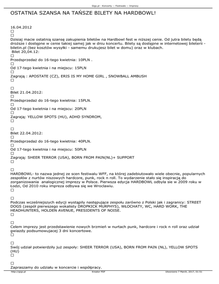 Gigs.pl - Koncerty :: Festiwale :: Imprezy OSTATNIA SZANSA NA TAŃSZE BILETY NA HARDBOWL! 16.04.2012 Dzisiaj macie ostatnią szansę zakupienia biletów na Hardbowl fest w niższej cenie. Od jutra bilety będą droższe i dostępne w cenie takiej samej jak w dniu koncertu. Bilety są dostępne w internetowej bileterii biletin.pl (bez kosztów wysyłki - samemu drukujesz bilet w domu) oraz w klubach. Bilet 20,04.12: Przedsprzedaż do 16-tego kwietnia: 10PLN . Od 17-tego kwietnia i na miejscu: 15PLN Zagrają : APOSTATE (CZ), ERIS IS MY HOME GIRL , SNOWBALL AMBUSH Bilet 21.04.2012: Przedsprzedaż do 16-tego kwietnia: 15PLN. Od 17-tego kwietnia i na miejscu: 20PLN Zagrają: YELLOW SPOTS (HU), ADHD SYNDROM, Bilet 22.04.2012: Przedsprzedaż do 16-tego kwietnia: 40PLN. Od 17-tego kwietnia i na miejscu: 50PLN Zagrają: SHEER TERROR (USA), BORN FROM PAIN(NL)+ SUPPORT HARDBOWL- to nazwa jednej ze scen festiwalu WFF, na której zadebiutowało wiele obecnie, popularnych zespołów z nurtów niszowych hardcore, punk, rock n roll. To wydarzenie stało się inspiracją do zorganizowania analogicznej imprezy w Polsce. Pierwsza edycja HARDBOWL odbyla sie w 2009 roku w Łodzi, Od 2010 roku impreza odbywa się we Wroclawiu. Podczas wcześniejszych edycji wystąpily następujące zespołu zarówno z Polski jak i zagranicy: STREET DOGS (zespół pierwszego wokalisty DROPKICK MURPHYS), WŁOCHATY, WC, HARD WORK, THE HEADHUNTERS, HOLDEN AVENUE, PRESIDENTS OF NOISE. Celem imprezy jest przedstawienie nowych brzmień w nurtach punk, hardcore i rock n roll oraz udział gwiazdy podsumowujacej 3 dni koncertowe. Swój udział potwierdziły już zespoły: SHEER TERROR (USA), BORN FROM PAIN (NL), YELLOW SPOTS (HU) Zapraszamy do udziału w koncercie i współpracy. http://gigs.pl Kreator PDF Utworzono 7 March, 2017, 01:51 Gigs.pl - Koncerty :: Festiwale :: Imprezy 20.04.2012 klub LIVERPPOL. Zagrają: APOSTATE (CZ), ERIS MY HOME GIRL, SNOWBALL AMBUSH 21.04.2012 klub Łykend. Zagrają: YELLOW SPOTS (HU) , ADHD SYNDROM 22.04.2012 klub Alibi, Zagrają: SHEER TERROR (USA), BORN FROM PAIN (NL) + SUPPORT CENY BILETÓW: Bilet 20,04.12: Przedsprzedaż do 16-tego kwietnia: 10PLN . Od 17-tego kwietnia i na miejscu: 15PLN Zagrają : APOSTATE (CZ), ERIS IS MY HOME GIRL , SNOWBALL AMBUSH Bilet 21.04.2012: Przedsprzedaż do 16-tego kwietnia: 15PLN. Od 17-tego kwietnia i na miejscu: 20PLN Zagrają: YELLOW SPOTS (HU), ADHD SYNDROM, Bilet 22.04.2012: Przedsprzedaż do 16-tego kwietnia: 40PLN. Od 17-tego kwietnia i na miejscu: 50PLN Zagrają: SHEER TERROR (USA), BORN FROM PAIN(NL)+ SUPPORT Bilet 3 dniowy (KARNET): Przedsprzedaż do 16-tego kwietnia: 65PLN. Od 17-tego kwietnia i na miejscu: 80PLN ADHD SYNDROM, BORN FROM PAIN, ERIS IS MY HOME GIRL , SNOWBALL AMUSH, SHEER TERROR, YELLOW SPOTS i inni. DODATKOWO PIERWSZE 200 OSÓB, KTÓRE KUPIA KARNETY OTRZYMAJĄ PRZY WEJSCIU GRATIS OFFICIALNY PLAKAT A1 „SICK OF IT ALL” ORAZ „ BORN FROM PAIN” Pelne info wkrótce na stronie: www.artriva.pl http://gigs.pl Kreator PDF Utworzono 7 March, 2017, 01:51 Gigs.pl - Koncerty :: Festiwale :: Imprezy Każdy bilet elektroniczny będzie na miejscu wymieniony na bilet kolekcjonerski. DOŁĄCZ DO NAS: https://www.facebook.com/events/291453434254664/?context=create http://www.lastfm.pl/festival/3221091+HARDBOWL+/attendance 20-22.04.2012 WROCŁAW, Szczegóły wkrótce na polskiej stronie: www.hardbowl.pl http://gigs.pl Kreator PDF Utworzono 7 March, 2017, 01:51