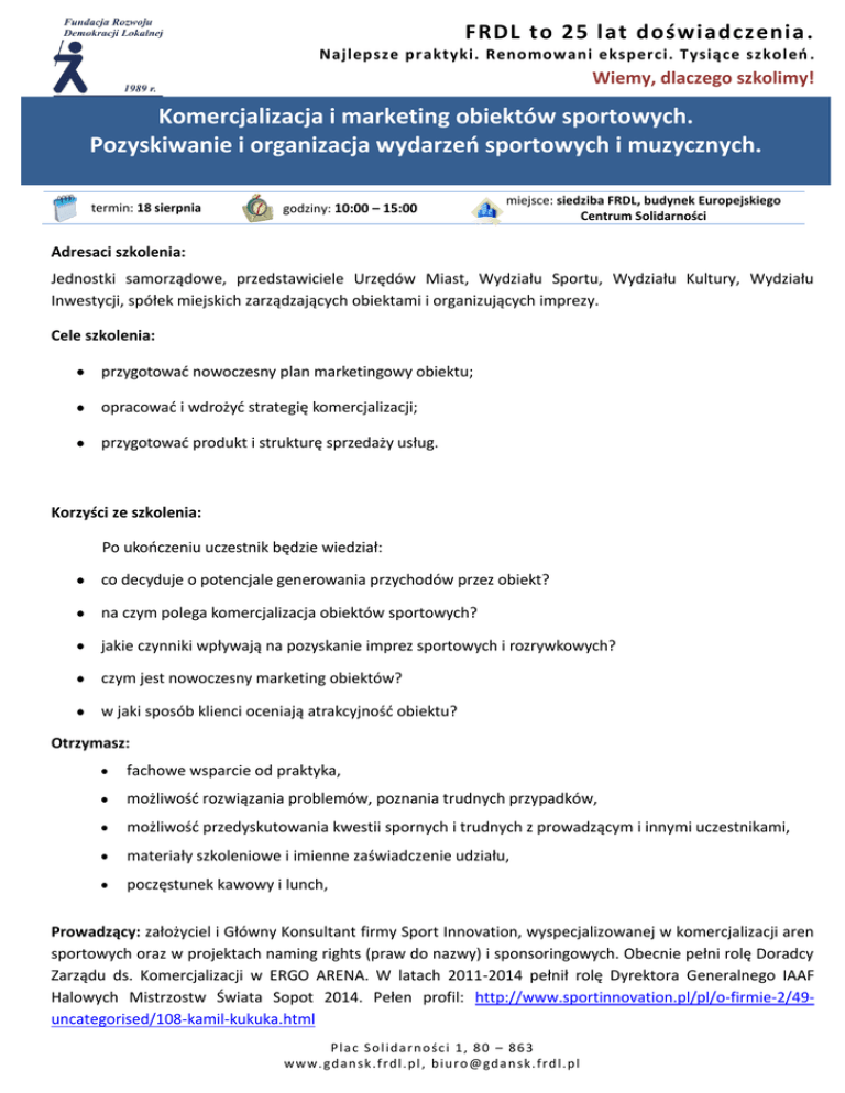 FRDL to 25 lat doświadczenia . Najlepsze praktyki. Renomowani eksperci. Tysiące szkoleo . Wiemy, dlaczego szkolimy! Komercjalizacja i marketing obiektów sportowych. Pozyskiwanie i organizacja wydarzeo sportowych i muzycznych. termin: 18 sierpnia godziny: 10:00 – 15:00 miejsce: siedziba FRDL, budynek Europejskiego Centrum Solidarności Adresaci szkolenia: Jednostki samorządowe, przedstawiciele Urzędów Miast, Wydziału Sportu, Wydziału Kultury, Wydziału Inwestycji, spółek miejskich zarządzających obiektami i organizujących imprezy. Cele szkolenia: przygotowad nowoczesny plan marketingowy obiektu; opracowad i wdrożyd strategię komercjalizacji; przygotowad produkt i strukturę sprzedaży usług. Korzyści ze szkolenia: Po ukooczeniu uczestnik będzie wiedział: co decyduje o potencjale generowania przychodów przez obiekt? na czym polega komercjalizacja obiektów sportowych? jakie czynniki wpływają na pozyskanie imprez sportowych i rozrywkowych? czym jest nowoczesny marketing obiektów? w jaki sposób klienci oceniają atrakcyjnośd obiektu? Otrzymasz: fachowe wsparcie od praktyka, możliwośd rozwiązania problemów, poznania trudnych przypadków, możliwośd przedyskutowania kwestii spornych i trudnych z prowadzącym i innymi uczestnikami, materiały szkoleniowe i imienne zaświadczenie udziału, poczęstunek kawowy i lunch, Prowadzący: założyciel i Główny Konsultant firmy Sport Innovation, wyspecjalizowanej w komercjalizacji aren sportowych oraz w projektach naming rights (praw do nazwy) i sponsoringowych. Obecnie pełni rolę Doradcy Zarządu ds. Komercjalizacji w ERGO ARENA. W latach 2011-2014 pełnił rolę Dyrektora Generalnego IAAF Halowych Mistrzostw Świata Sopot 2014. Pełen profil: http://www.sportinnovation.pl/pl/o-firmie-2/49uncategorised/108-kamil-kukuka.html Pla c S ol id ar n o śc i 1, 8 0 – 86 3 w w w. gd an sk .f rd l .p l , b iu ro @gd a n sk. frd l.p l Natalia Walas 58 77 24 213, 500 112 543, [email protected] Zapytaj o szkolenie PROGRAM: Strategia komercjalizacji i dywersyfikacji źródeł przychodów. Pozyskanie eventów – bidding. Sponsoring - naming rights i partnerstwa branżowe. Usługi VIP i hospitality. Sprzedaż i dystrybucja biletów. Catering i merchandising – sprzedaż masowa. Marka i wizerunek. Efektywne kampanie reklamowe obiektu. Komunikacja i Public Relations - codzienne relacje z mediami. Nowe media i technologie w marketingu obiektów. Mierzenie efektów. WYŚLIJ ZGŁOSZENIE DO: 11.08.15, 15:00 FORMULARZ ZGŁOSZENIOWY: [email protected] 58 550 32 39 Komercjalizacja i marketing obiektów sportowych: 18 sierpieo 2015 Nazwa Instytucji/Firmy (dane do FV): Adres: NIP: Telefon: Faks: 1. Imię, nazwisko , stanowisko e-mail Imię, nazwisko , stanowisko e-mail 2. Zgłoszenie w terminie do 5 sierpnia 2015 r. Dla kolejnej osoby zgłoszonej z tej samej instytucji Cena netto: 423,60 zł TAK / NIE 360 zł TAK / NIE 14 dni 10% rabatu Udział w szkoleniu jest finansowane przynajmniej w 70 % ze środków publicznych Należnośd należy zapłacid przelewem po szkoleniu po otrzymaniu faktury VAT TAK / NIE TAK / NIE Zgodnie z Ust. o Ochronie Danych Osobowych z dnia 29.08.1997 r. wyrażam zgodę na przetwarzanie moich danych osobowych dla potrzeb działalności szkoleniowej FRDL Brak pisemnej rezygnacji ze szkolenia na 5 dni przed terminem będzie równoznaczny z obciążeniem Paostwa 50 % kosztów ogólnych. Data: Podpis: Uwaga! Braku kontaktu ze strony FRDL minimum 2 dni przed terminem szkolenia może oznaczad, że karta zgłoszeniowa nie dotarła. W takim przypadku prosimy o kontakt telefoniczny lub mailowy: 58 772 42 13, [email protected]