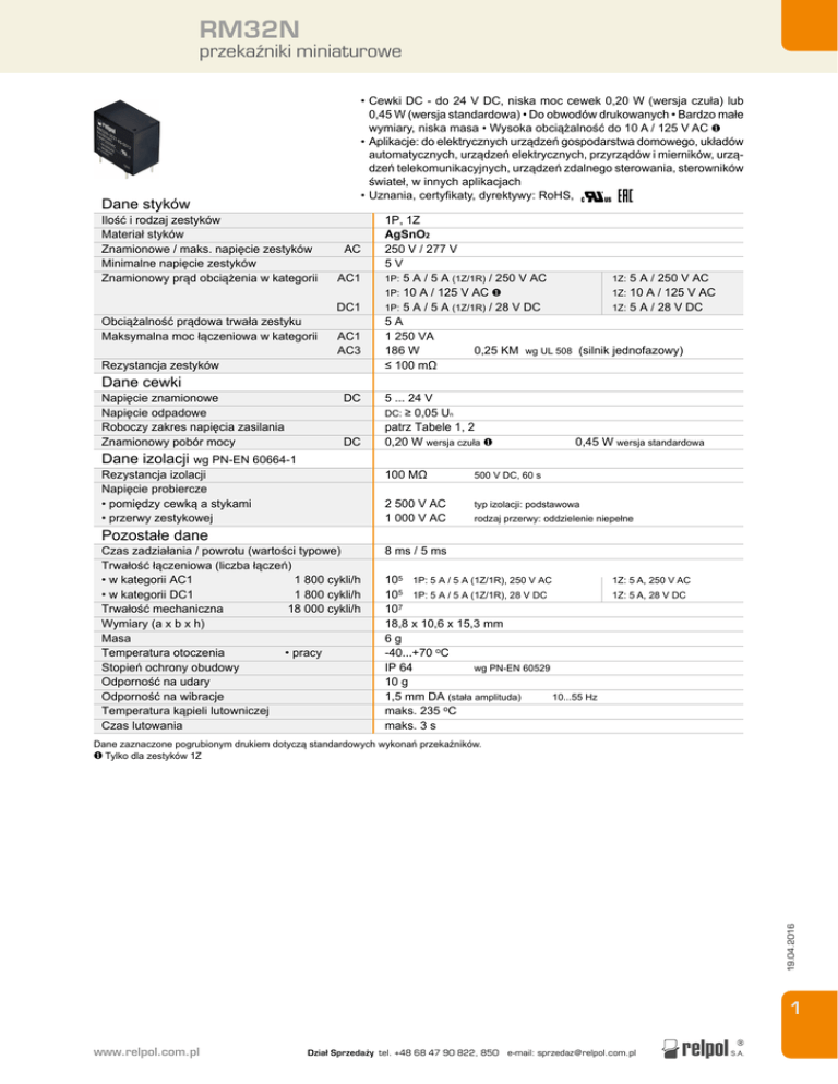 RM32N przekaźniki miniaturowe •Cewki DC - do 24 V DC, niska moc cewek 0,20 W (wersja czuła) lub 0,45 W (wersja standardowa) • Do obwodów drukowanych • Bardzo małe wymiary, niska masa • Wysoka obciążalność do 10 A / 125 V AC ❶ •Aplikacje: do elektrycznych urządzeń gospodarstwa domowego, układów automatycznych, urządzeń elektrycznych, przyrządów i mierników, urządzeń telekomunikacyjnych, urządzeń zdalnego sterowania, sterowników świateł, w innych aplikacjach •Uznania, certyfikaty, dyrektywy: RoHS, Dane styków Ilość i rodzaj zestyków Materiał styków Znamionowe / maks. napięcie zestyków Minimalne napięcie zestyków Znamionowy prąd obciążenia w kategorii Obciążalność prądowa trwała zestyku Maksymalna moc łączeniowa w kategorii Rezystancja zestyków Dane cewki Napięcie znamionowe Napięcie odpadowe Roboczy zakres napięcia zasilania Znamionowy pobór mocy Dane izolacji wg PN-EN 60664-1 AC AC1 DC1 AC1 AC3 DC DC Rezystancja izolacji Napięcie probiercze • pomiędzy cewką a stykami • przerwy zestykowej Pozostałe dane Czas zadziałania / powrotu (wartości typowe) Trwałość łączeniowa (liczba łączeń) • w kategorii AC1 1 800 cykli/h • w kategorii DC1 1 800 cykli/h Trwałość mechaniczna 18 000 cykli/h Wymiary (a x b x h) Masa Temperatura otoczenia • pracy Stopień ochrony obudowy Odporność na udary Odporność na wibracje Temperatura kąpieli lutowniczej Czas lutowania 1P, 1Z AgSnO2 250 V / 277 V 5V 1P: 5 A / 5 A (1Z/1R) / 250 V AC 1Z: 5 A / 250 V AC 1P: 10 A / 125 V AC ❶ 1Z: 10 A / 125 V AC 1P: 5 A / 5 A (1Z/1R) / 28 V DC 1Z: 5 A / 28 V DC 5A 1 250 VA 186 W 0,25 KM wg UL 508 (silnik jednofazowy) ≤ 100 mΩ 5 ... 24 V DC: ≥ 0,05 Un patrz Tabele 1, 2 0,20 W wersja czuła ❶ 0,45 W wersja standardowa 100 MΩ 500 V DC, 60 s 2 500 V AC 1 000 V AC typ izolacji: podstawowa rodzaj przerwy: oddzielenie niepełne 8 ms / 5 ms 105 1P: 5 A / 5 A (1Z/1R), 250 V AC 1Z: 5 A, 250 V AC 105 1P: 5 A / 5 A (1Z/1R), 28 V DC 1Z: 5 A, 28 V DC 107 18,8 x 10,6 x 15,3 mm 6g -40...+70 oC IP 64 wg PN-EN 60529 10 g 1,5 mm DA (stała amplituda) 10...55 Hz maks. 235 oC maks. 3 s 19.04.2016 Dane zaznaczone pogrubionym drukiem dotyczą standardowych wykonań przekaźników. ❶ Tylko dla zestyków 1Z 1 www.relpol.com.pl Dzia³ Sprzeda¿y tel. +48 68 47 90 822, 850 • e-mail: [email protected] RM32N przekaźniki miniaturowe Wymiary Schematy połączeń (widok od strony wyprowadzeń) 18,8 10,6 11 0,4 15,3 A1 3,8 A2 0,3 0,8 1,7 14 12 1P - przełączny 7,62 A1 11 1P - przełączny A2 14 1Z - zwierny 1Z - zwierny 12,7 2,54 Rozstaw otworów montażowych (widok od strony lutowania) 1Z - zwierny 2,54 2,54 2,54 5 × Ø 1,3 7,62 12,7 7,62 11,2 1,5 2,54 4 × Ø 1,3 2,54 2,54 1P - przełączny Montaż ŚRODKI OSTROŻNOŚCI: 1. Należy upewnić się, że parametry produktu opisane w jego specyfikacji zapewniają margines bezpieczeństwa dla prawidłowej pracy urządzenia lub systemu oraz bezwzględnie unikać użytkowania, które przekracza parametry produktu. 2. Nigdy nie dotykać części urządzenia produktu znajdującego się pod napięciem. 3. Należy upewnić się, że produkt podłączony jest prawidłowo. Nieprawidłowe podłączenie może spowodować złe działanie, nadmierne przegrzewanie oraz ryzyko powstania ognia. 4. Jeśli istnieje ryzyko, że wadliwa praca produktu mogłaby spowodować dotkliwe straty materialne lub zagrażać zdrowiu i życiu ludzi lub zwierząt, należy konstruować urządzenia lub systemy tak, aby wyposażone były w podwójny system bezpieczeństwa, gwarantujący niezawodną pracę. 19.04.2016 Przekaźniki RM32N przeznaczone są do bezpośredniego lutowania w obwodach drukowanych. 2 www.relpol.com.pl Dzia³ Sprzeda¿y tel. +48 68 47 90 822, 850 • e-mail: [email protected] RM32N przekaźniki miniaturowe Dane cewki - wykonanie napięciowe, zasilanie prądem stałym, wersja czuła Kod cewki ❶ Napięcie znamionowe V DC Rezystancja cewki przy 20 °C Ω Tolerancja rezystancji Tabela 1 Roboczy zakres napięcia zasilania V DC min. (przy 20 °C) maks. (przy 20 °C) S005 5 125 ± 10% 3,75 6,5 S009 9 405 ± 10% 6,75 11,7 S012 12 720 ± 10% 9,00 15,6 S018 18 1 620 ± 10% 13,50 23,4 S024 24 2 880 ± 10% 18,00 31,2 ❶ Tylko dla zestyków 1Z Dane cewki - wykonanie napięciowe, zasilanie prądem stałym, wersja standardowa Kod cewki Napięcie znamionowe V DC Rezystancja cewki przy 20 °C Ω Tolerancja rezystancji Tabela 2 Roboczy zakres napięcia zasilania V DC min. (przy 20 °C) maks. (przy 20 °C) 1005 5 56 ± 10% 3,75 6,5 1009 9 180 ± 10% 6,75 11,7 1012 12 320 ± 10% 9,00 15,6 1018 18 720 ± 10% 13,50 23,4 1024 24 1 280 ± 10% 18,00 31,2 Oznaczenia kodowe do zamówień Stopień ochrony obudowy Typ Materiał styków R M 3 2 N — Ilość i rodzaj zestyków Sposób podłączenia — Kod cewki — Materiał styków 30 - AgSnO2 Ilość i rodzaj zestyków 11 - 1P (przełączny) 21 - 1Z (zwierny) patrz Tabele 1, 2 str. 3 Stopień ochrony obudowy 8 - w obudowie, wykonanie IP 64 Sposób podłączenia 5 - do obwodów drukowanych RM32N-3021-85-S018 RM32N-3011-85-1024 przekaźnik RM32N, do obwodów drukowanych, jeden zestyk zwierny, materiał styków AgSnO2, napięcie cewki czułej 18 V DC, w obudowie IP 64 przekaźnik RM32N, do obwodów drukowanych, jeden zestyk przełączny, materiał styków AgSnO2, napięcie cewki standardowej 24 V DC, w obudowie IP 64 19.04.2016 Przykłady kodowania: 3 www.relpol.com.pl Dzia³ Sprzeda¿y tel. +48 68 47 90 822, 850 • e-mail: [email protected]