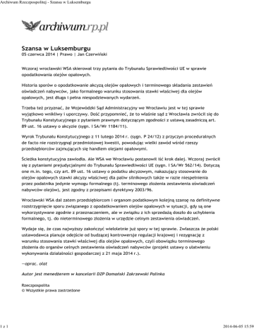 Archiwum Rzeczpospolitej - Szansa w Luksemburgu 1z1 Szansa w Luksemburgu 05 czerwca 2014 | Prawo | Jan Czerwiński Wczoraj wrocławski WSA skierował trzy pytania do Trybunału Sprawiedliwości UE w sprawie opodatkowania olejów opałowych. Historia sporów o opodatkowanie akcyzą olejów opałowych i terminowego składania zestawień oświadczeń nabywców, jako formalnego warunku stosowania stawki właściwej dla olejów opałowych, jest długa i pełna niespodziewanych wydarzeń. Trzeba też przyznać, że Wojewódzki Sąd Administracyjny we Wrocławiu jest w tej sprawie wyjątkowo wnikliwy i uporczywy. Dość przypomnieć, że to właśnie sąd z Wrocławia zwrócił się do Trybunału Konstytucyjnego z pytaniem prawnym dotyczącym zgodności z ustawą zasadniczą art. 89 ust. 16 ustawy o akcyzie (sygn. I SA/Wr 1184/11). Wyrok Trybunału Konstytucyjnego z 11 lutego 2014 r. (sygn. P 24/12) z przyczyn proceduralnych de facto nie rozstrzygnął przedmiotowej kwestii, powodując wielki zawód wśród rzeszy przedsiębiorców zajmujących się handlem olejami opałowymi. Ścieżka konstytucyjna zawiodła. Ale WSA we Wrocławiu postanowił iść krok dalej. Wczoraj zwrócił się z pytaniami prejudycjalnymi do Trybunału Sprawiedliwości UE (sygn. I SA/Wr 562/14). Dotyczą one m.in. tego, czy art. 89 ust. 16 ustawy o podatku akcyzowym, nakazujący stosowanie do olejów opałowych stawki akcyzy właściwej dla paliw silnikowych także w razie niespełnienia przez podatnika jedynie wymogu formalnego (tj. terminowego złożenia zestawienia oświadczeń nabywców olejów), jest zgodny z przepisami dyrektywy 2003/96. Wrocławski WSA dał zatem przedsiębiorcom i organom podatkowym kolejną szansę na definitywne rozstrzygnięcie sporu związanego z opodatkowaniem olejów opałowych w sytuacji, gdy są one wykorzystywane zgodnie z przeznaczeniem, ale w związku z ich sprzedażą doszło do uchybienia formalnego, tj. do nieterminowego złożenia w urzędzie celnym zestawienia oświadczeń. Wydaje się, że czas najwyższy zakończyć wieloletnie już spory w tej sprawie. Zwłaszcza że polski ustawodawca planuje odejście od budzącej kontrowersje regulacji krajowej i rezygnację z warunku stosowania stawki właściwej dla olejów opałowych, czyli obowiązku terminowego złożenia do organów celnych zestawienia oświadczeń nabywców (projekt ustawy o ułatwieniu wykonywania działalności gospodarczej z 21 maja 2014 r.). —oprac. olat Autor jest menedżerem w kancelarii DZP Domański Zakrzewski Palinka Rzeczpospolita © Wszystkie prawa zastrzeżone 2014-06-05 15:59