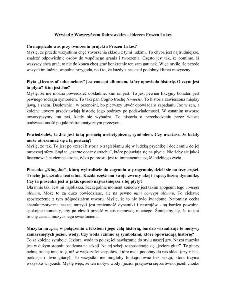Wywiad z Wawrzyńcem Dąbrowskim – liderem Frozen Lakes Co napędzało was przy tworzeniu projektu Frozen Lakes? Myślę, że przede wszystkim chęć stworzenia składu z tymi ludźmi. To chyba jest najtrudniejsze, znaleźć odpowiednie osoby do wspólnego grania i tworzenia. Często jest tak, że pomimo, iż wszyscy chcą grać, to nie do końca chcą grać konkretnie ten sam gatunek. Więc myślę, że przede wszystkim ludzie, wspólna przygoda, no i to, że każdy z nas czuł podobny klimat muzyczny. Płyta „Oceans of subconcious” jest concept albumem, który opowiada historię. O czym jest ta płyta? Kim jest Joe? Myślę, że nie można powiedzieć dokładnie, kim on jest. To jest pewien fikcyjny bohater, jest pewnego rodzaju symbolem. To taki pan Cogito trochę (śmiech). To historia zawieszona między jawą, a snem. Dosłownie i w przenośni, bo pierwszy utwór opowiada o zapadaniu Joe w sen, a kolejne utwory przedstawiają historię jego podróży po podświadomości. W ostatnim utworze towarzyszymy mu zaś, kiedy się wybudza. To historia o przechodzeniu przez własną podświadomość po jakimś traumatycznym przeżyciu. Powiedziałeś, że Joe jest taką postacią archetypiczną, symbolem. Czy uważasz, że każdy może utożsamiać się z tą postacią? Myślę, że tak. To jest po części historia o zagłębianiu się w ludzką psychikę i docieraniu do jej mrocznej sfery. Stąd te „czarne oceany strachu”, które pojawiają się na płycie. Nie żeby się jakoś fascynować tą ciemną stroną, tylko po prostu jest to immanentna część ludzkiego życia. Piosenka „King Joe”, którą wybraliście do zagrania w programie, dzieli się na trzy części. Trochę jak sztuka teatralna. Każda część ma swoje zwroty akcji i specyficzną dynamikę. Czy ta piosenka jest w jakiś sposób najważniejsza z tej płyty? Dla mnie tak. Jest mi najbliższa. Szczególnie moment końcowy jest takim apogeum tego concept albumu. Może to za dużo powiedziane, ale na pewno mini concept albumu. To ciekawe spostrzeżenie z tym trójpodziałem utworu. Myślę, że to nie było świadome. Natomiast cechą charakterystyczną naszej muzyki jest zmienność dynamiki i nastrojów - są bardzo powolne, spokojne momenty, aby po chwili przejść w coś naprawdę mocnego. Śmiejemy się, że to jest trochę zasada muzycznego światłocienia. Muzyka na epce, w połączeniu z tekstem i jego całą historią, bardzo wizualizuje te motywy zamarzniętych jezior, wody. Czy woda i zimno są symbolami, które opowiadają historię? To są kolejne symbole. Jeziora, woda to po części nawiązanie do stylu naszej gry. Nasza muzyka jest w dużym stopniu osadzona na sekcji. Na tej sekcji rozpościerają się „jeziora gitar”. Te gitary pełnią trochę inną rolę, niż w większości zespołów, które mają podobny do nas skład (czyli: bas, perkusja i dwie gitary). To wszystko nie mogłoby funkcjonować bez sekcji, która trzyma wszystko w ryzach. Myślę więc, że ten motyw wody i jezior przejawia się zarówno, jeżeli chodzi o odniesienia do samej muzyki, jak i do ogólnego klimatu, który jest dosyć surowy, mroźny i przez ten mróz, może w pewien sposób “szlachetny”. Czy wykorzystywaliście jakieś inspiracje z zakresu psychologii? Jak według ciebie człowiek radzi sobie ze stratą bliskiej osoby? Czy przechodzi przez psychologiczne fazy jak np. wyparcie, gniew, depresja? Ciekawe i głębokie pytanie! (śmiech) Jeżeli chodzi o te inspiracje psychologiczne, to myślę, że tam jest sporo Junga i motywów bardzo baśniowych. Przez tą konwencję baśniowości było możliwe użycie środków stylistycznych, które pewnie poza tą konwencją byłyby banalne. Używanie tych motywów mogłyby być bardzo kiepskie, gdyby nie osadzenie fabuły w konwencji z pogranicza snu i jawy. Natomiast czy to jest taki dokładny psychologiczny opis... Chyba nie. Nikt z nas w zespole nie czuje się uprawomocniony i nie ma takiej wiedzy, żeby to opisywać w ten sposób - jest to bardziej wizja artystyczna. Czy uważasz, że podświadomość jest naszym sprzymierzeńcem czy wrogiem? Czasami potrafi pomóc odpowiedzieć na ważne pytania, a czasami poważnie dokopać i wpędzić w depresję. Ja myślę, że jest i tak, i tak. Nie można powiedzieć, żeby podświadomość była ani dobra, ani zła. To jest trochę tak, jak Baruch Spinoza mówił o substancjach chemicznych, że one mogą być czasami lekarstwem, a w innym przypadku mogą być trucizną - nie wiadomo więc czy są dobre czy złe. Myślę, że tak samo jest z podświadomością. Czasami może ona nam pomagać, może działać stymulująco, czasami rozwijająco, a czasami destrukcyjnie. Czy i dlaczego muzyka jest dobrym medium do opowiadania historii? Ja nie wiem, czy ona jest dobrym medium (śmiech). Ja i chłopaki robimy to po prostu od dłuższego czasu i myślę, że muzyka oraz ogólnie sztuka jest językiem komunikacji. Wydaje mi się, że udało nam się uchwycić na płycie to, co chcieliśmy tam zawrzeć. Gdybyśmy teraz mieli to zwerbalizować, to pewnie by nam się nie udało. Dlatego użyliśmy do tego celu muzyki. Przy pisaniu tekstów inspirowałeś się filmami takimi jak „Zakochany bez pamięci” i „Źródło”. Czy uważasz, że historia z płyty ma potencjał, żeby ją zekranizować lub stworzyć fabularyzowany teledysk? Myślę, że ona może być dobrym zaczynem do filmu, ale trzeba by ją bardzo solidnie rozbudować. Też nie jest tak do końca tak, że ja się inspirowałem tymi filmami, bardziej wydaje mi się, że tam się pojawia podobna przestrzeń emocjonalna. Taka, gdzie nie ma jasno określonego czasu ani miejsca akcji. Nasz bohater podróżuje przez podświadomość i krainy, które po części symbolizują jego różne odczucia i przemyślenia, ale gdybyśmy mieli jasno wyznaczyć czas i miejsce akcji, to byśmy go nie znaleźli, podobnie jak w „Źródle” Aronofsky’ego. Tam akcja rozgrywa się w trz