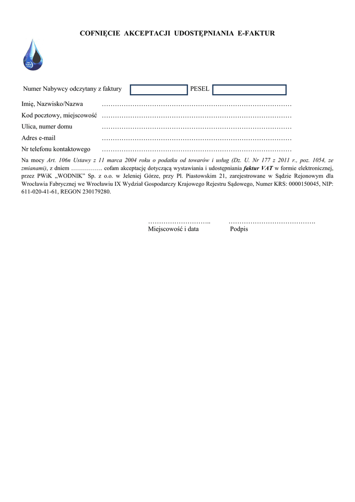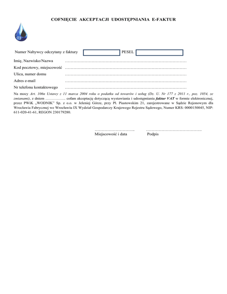 COFNIĘCIE AKCEPTACJI UDOSTĘPNIANIA E-FAKTUR Numer Nabywcy odczytany z faktury Imię, Nazwisko/Nazwa PESEL …………………………………………………………………………… Kod pocztowy, miejscowość …………………………………………………………………………… Ulica, numer domu …………………………………………………………………………… Adres e-mail …………………………………………………………………………… Nr telefonu kontaktowego …………………………………………………………………………… Na mocy Art. 106n Ustawy z 11 marca 2004 roku o podatku od towarów i usług (Dz. U. Nr 177 z 2011 r., poz. 1054, ze zmianami), z dniem ……………. cofam akceptację dotyczącą wystawiania i udostępniania faktur VAT w formie elektronicznej, przez PWiK „WODNIK” Sp. z o.o. w Jeleniej Górze, przy Pl. Piastowskim 21, zarejestrowane w Sądzie Rejonowym dla Wrocławia Fabrycznej we Wrocławiu IX Wydział Gospodarczy Krajowego Rejestru Sądowego, Numer KRS: 0000150045, NIP: 611-020-41-61, REGON 230179280. ……………………….. Miejscowość i data …………………………………. Podpis