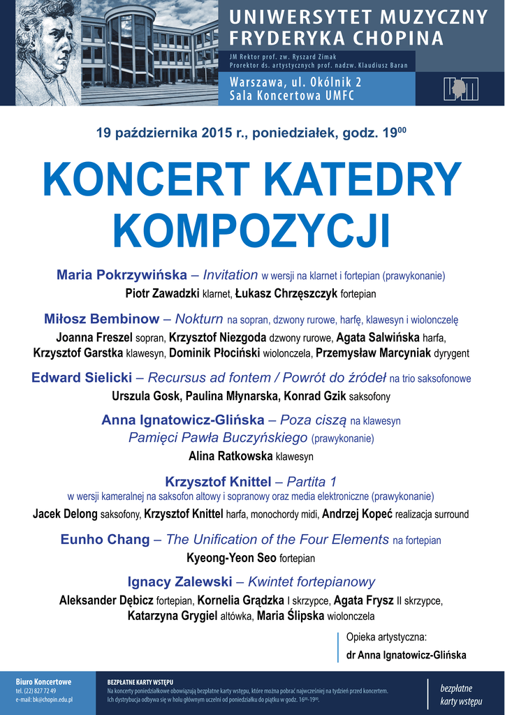 UNIWERSY TET MUZYCZNY FRYDERYKA CHOPINA JM Rektor prof. zw. Ryszard Zimak Prorektor ds. ar tystycznych prof. nadzw. Klaudiusz Baran Wa r s z awa , u l. O kó l n i k 2 S a l a Ko n c e r towa U M F C 19 października 2015 r., poniedziałek, godz. 19 00 KONCERT KATEDRY KOMPOZYCJI Maria Pokrzywińska – Invitation w wersji na klarnet i fortepian (prawykonanie) Piotr Zawadzki klarnet, Łukasz Chrzęszczyk fortepian Miłosz Bembinow – Nokturn na sopran, dzwony rurowe, harfę, klawesyn i wiolonczelę Joanna Freszel sopran, Krzysztof Niezgoda dzwony rurowe, Agata Salwińska harfa, Krzysztof Garstka klawesyn, Dominik Płociński wiolonczela, Przemysław Marcyniak dyrygent Edward Sielicki – Recursus ad fontem / Powrót do źródeł na trio saksofonowe Urszula Gosk, Paulina Młynarska, Konrad Gzik saksofony Anna Ignatowicz-Glińska – Poza ciszą na klawesyn Pamięci Pawła Buczyńskiego (prawykonanie) Alina Ratkowska klawesyn Krzysztof Knittel – Partita 1 w wersji kameralnej na saksofon altowy i sopranowy oraz media elektroniczne (prawykonanie) Jacek Delong saksofony, Krzysztof Knittel harfa, monochordy midi, Andrzej Kopeć realizacja surround Eunho Chang – The Unification of the Four Elements na fortepian Kyeong-Yeon Seo fortepian Ignacy Zalewski – Kwintet fortepianowy Aleksander Dębicz fortepian, Kornelia Grądzka I skrzypce, Agata Frysz II skrzypce, Katarzyna Grygiel altówka, Maria Ślipska wiolonczela Opieka artystyczna: dr Anna Ignatowicz-Glińska Biuro Koncertowe tel. (22) 827 72 49 e-mail: [email protected] BEZPŁATNE KARTY WSTĘPU Na koncerty poniedziałkowe obowiązują bezpłatne karty wstępu, które można pobrać najwcześniej na tydzień przed koncertem. Ich dystrybucja odbywa się w holu głównym uczelni od poniedziałku do piątku w godz. 1600-1900. bezpłatne karty wstępu