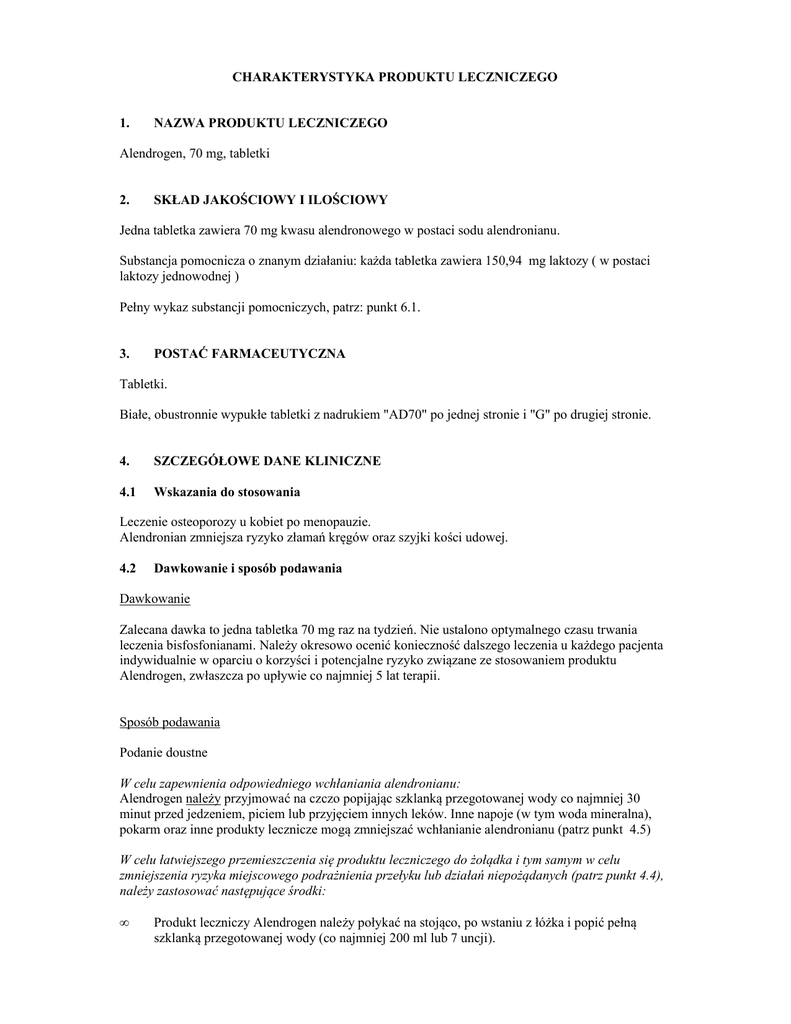 CHARAKTERYSTYKA PRODUKTU LECZNICZEGO 1. NAZWA PRODUKTU LECZNICZEGO Alendrogen, 70 mg, tabletki 2. SKŁAD JAKOŚCIOWY I ILOŚCIOWY Jedna tabletka zawiera 70 mg kwasu alendronowego w postaci sodu alendronianu. Substancja pomocnicza o znanym działaniu: każda tabletka zawiera 150,94 mg laktozy ( w postaci laktozy jednowodnej ) Pełny wykaz substancji pomocniczych, patrz: punkt 6.1. 3. POSTAĆ FARMACEUTYCZNA Tabletki. Białe, obustronnie wypukłe tabletki z nadrukiem "AD70" po jednej stronie i "G" po drugiej stronie. 4. SZCZEGÓŁOWE DANE KLINICZNE 4.1 Wskazania do stosowania Leczenie osteoporozy u kobiet po menopauzie. Alendronian zmniejsza ryzyko złamań kręgów oraz szyjki kości udowej. 4.2 Dawkowanie i sposób podawania Dawkowanie Zalecana dawka to jedna tabletka 70 mg raz na tydzień. Nie ustalono optymalnego czasu trwania leczenia bisfosfonianami. Należy okresowo ocenić konieczność dalszego leczenia u każdego pacjenta indywidualnie w oparciu o korzyści i potencjalne ryzyko związane ze stosowaniem produktu Alendrogen, zwłaszcza po upływie co najmniej 5 lat terapii. Sposób podawania Podanie doustne W celu zapewnienia odpowiedniego wchłaniania alendronianu: Alendrogen należy przyjmować na czczo popijając szklanką przegotowanej wody co najmniej 30 minut przed jedzeniem, piciem lub przyjęciem innych leków. Inne napoje (w tym woda mineralna), pokarm oraz inne produkty lecznicze mogą zmniejszać wchłanianie alendronianu (patrz punkt 4.5) W celu łatwiejszego przemieszczenia się produktu leczniczego do żołądka i tym samym w celu zmniejszenia ryzyka miejscowego podrażnienia przełyku lub działań niepożądanych (patrz punkt 4.4), należy zastosować następujące środki: • Produkt leczniczy Alendrogen należy połykać na stojąco, po wstaniu z łóżka i popić pełną szklanką przegotowanej wody (co najmniej 200 ml lub 7 uncji). • • • • Produkt leczniczy Alendrogen należy połykać w całości. Nie należy żuć ani rozpuszczać tabletek w jamie ustnej, z powodu ryzyka wystąpienia owrzodzeń błony śluzowej jamy ustnej lub gardła. Pacjenci nie mogą kłaść się aż do spożycia pierwszego posiłku w ciągu dnia, który można spożyć w co najmniej pół godziny po połknięciu tabletki. Pacjenci nie mogą kłaść się przez 30 minut po przyjęciu tabletki. Produktu leczniczego Alendrogen nie należy przyjmować przed położeniem się spać oraz przed wstaniem z łóżka. W przypadku nieodpowiedniej diety pacjenci powinni przyjmować preparaty wapnia i witaminy D (patrz punkt 4.4). Osoby w podeszłym wieku: W badaniach klinicznych nie wykazano różnic związanych z wiekiem i dlatego też nie ma konieczności zmniejszenia dawki u osób w podeszłym wieku. Pacjenci z zaburzeniami czynności nerek Zmiana dawkowania nie jest konieczna u pacjentów, u których wskaźnik przesączania kłębuszkowego (ang. GFR) jest większy niż 35 ml/min. Alendronian nie jest zalecany u pacjentów z ciężkimi zaburzeniami czynności nerek, u których wartość GFR jest mniejsza niż 35 ml/min ze względu na brak odpowiednich badań klinicznych. Dzieci i młodzież Kwasu alendronowego (substancja czynna) nie należy stosować u dzieci w wieku poniżej 18 lat, ponieważ brak jest dostępnych danych dotyczących bezpieczeństwa i skuteczności stosowania w osteoporozie w dzieci (patrz także punkt 5.1). Nie prowadzono badań kwasu alendronowego w leczeniu osteoporozy wywołanej przez glikokortykosteroidy. 4.3 Przeciwwskazania - - Nieprawidłowości przełyku oraz inne czynniki opóźniające proces opróżniania przełyku np. zwężenie lub achalazja. Niezdolność zachowania pozycji stojącej lub siedzącej przez co najmniej 30 minut. Nadwrażliwość na substancję czynną lub na którąkolwiek substancję pomocniczą wymienioną w punkcie 6.1. Hipokalcemia. Patrz również punkt 4.4 4.4 Specjalne ostrzeżenia i środki ostrożności dotyczące stosowania - Alendronian może powodować miejscowe podrażnienie błony śluzowej górnego odcinka przewodu pokarmowego. Ze względu na możliwość nasilenia objawów podrażnienia błony śluzowej górnego odcinka przewodu pokarmowego, należy zachować ostrożność podczas stosowania produktu leczniczego u osób z czynnymi zaburzeniami dotyczącymi górnego odcinka przewodu pokarmowego takimi, jak: trudności w połykaniu, choroby przełyku, zapalenie błony śluzowej żołądka lub dwunastnicy, owrzodzenia lub u osób, u których ostatnio (w ciągu ostatniego roku) wystąpiły ciężkie choroby układu pokarmowego takie, jak wrzód trawienny, czynne krwawienie z przewodu pokarmowego, zabieg chirurgiczny w obrębie górnego odcinka przewodu pokarmowego inny niż plastyka odźwiernika (patrz punkt 4.3). U pacjentów z rozpoznanym przełykiem Barretta, lekarz przepisujący receptę powinien rozważyć korzyści i potencjalne ryzyko stosowania alendronianu u każdego pacjenta z osobna. Opisano działania niepożądane u pacjentów leczonych alendronianem takie jak zapalenie przełyku, owrzodzenia i nadżerki przełyku, w rzadkich przypadkach prowadzące do zwężenia przełyku. Dlatego też, lekarz musi zwracać uwagę na wszelkie objawy podmiotowe i przedmiotowe, które mogą świadczyć o wystąpieniu działań niepożądanych w obrębie przełyku. Pacjentów należy pouczyć o konieczności przerwania leczenia alendronianem i skonsultowania się ze swoim lekarzem w przypadku pojawienia się objawów podrażnienia przełyku takich jak utrudnienie połykania, ból podczas połykania, ból zamostkowy, pojawienie się lub nasilenie zgagi. Należy przypuszczać, że ryzyko ciężkich działań niepożądanych dotyczących przełyku wydaje się większe u pacjentów przyjmujących alendronian niezgodnie z zaleceniami i (lub) kontynuujących przyjmowanie produktu leczniczego pomimo wystąpienia objawów wskazujących na podrażnienie przełyku. Bardzo ważne jest, aby pacjent otrzymał i całkowicie zrozumiał informacje dot