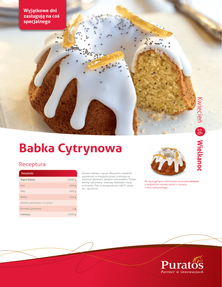 Wyjątkowe dni zasługują na coś specjalnego Receptura Składniki Tegral Babka 1000 g Jaja 450 g Olej 400 g Woda 150 g Skórka cytrynowa z 2 cytryn Aromat cytrynowy Lukrecja 2g 1000 g Zetrzeć skórkę z cytryn. Wszystkie składniki wymieszać w maszynie przez 4 minuty na średnich obrotach, płaskim mieszadłem. Dodać skórkę cytrynową i esencję. Nakładać masę w foremki. Piec w temperaturze 180°C około 35 - 40 minut. Kwiecień 16 Wielkanoc Babka Cytrynowa Po wystygnięciu dekorować pomadą Lukrecja z dodatkiem otartej skórki z cytryny i soku cytrynowego.