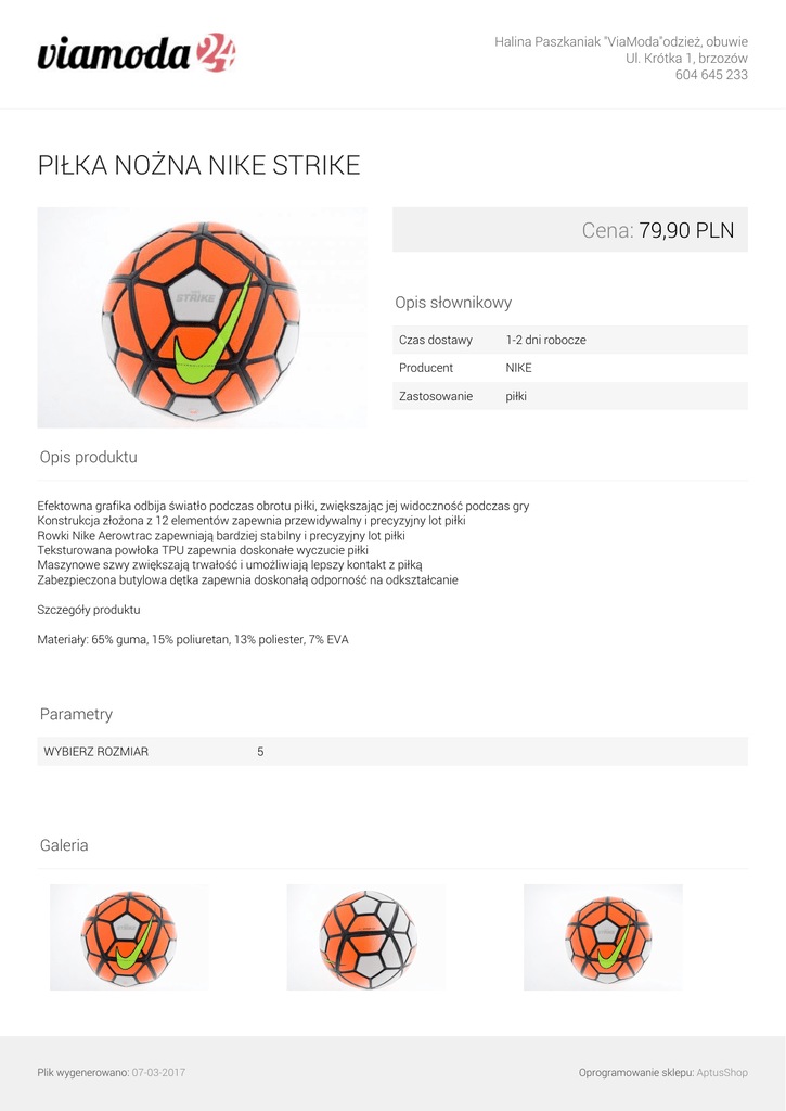Halina Paszkaniak "ViaModa"odzież, obuwie Ul. Krótka 1, brzozów 604 645 233 PIŁKA NOŻNA NIKE STRIKE Cena: 79,90 PLN Opis słownikowy Czas dostawy 1-2 dni robocze Producent NIKE Zastosowanie piłki Opis produktu Efektowna grafika odbija światło podczas obrotu piłki, zwiększając jej widoczność podczas gry Konstrukcja złożona z 12 elementów zapewnia przewidywalny i precyzyjny lot piłki Rowki Nike Aerowtrac zapewniają bardziej stabilny i precyzyjny lot piłki Teksturowana powłoka TPU zapewnia doskonałe wyczucie piłki Maszynowe szwy zwiększają trwałość i umożliwiają lepszy kontakt z piłką Zabezpieczona butylowa dętka zapewnia doskonałą odporność na odkształcanie Szczegóły produktu Materiały: 65% guma, 15% poliuretan, 13% poliester, 7% EVA Parametry WYBIERZ ROZMIAR 5 Galeria Plik wygenerowano: 07-03-2017 Oprogramowanie sklepu: AptusShop Halina Paszkaniak "ViaModa"odzież, obuwie Ul. Krótka 1, brzozów 604 645 233 Plik wygenerowano: 07-03-2017 Powered by TCPDF (www.tcpdf.org) Oprogramowanie sklepu: AptusShop