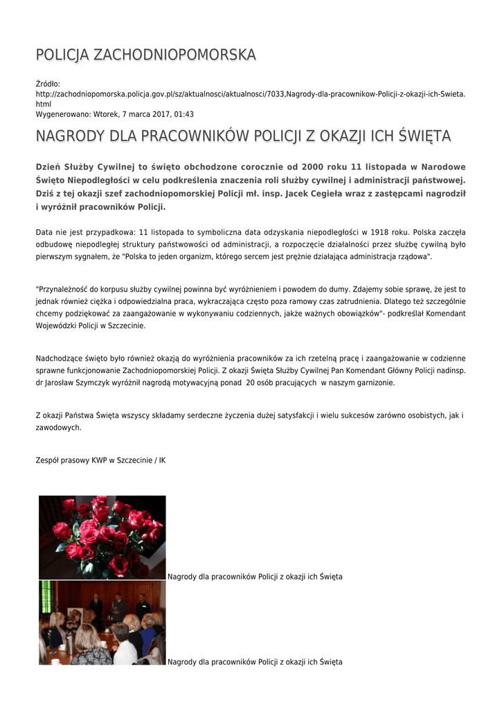 POLICJA ZACHODNIOPOMORSKA Źródło: http://zachodniopomorska.policja.gov.pl/sz/aktualnosci/aktualnosci/7033,Nagrody-dla-pracownikow-Policji-z-okazji-ich-Swieta. html Wygenerowano: Wtorek, 7 marca 2017, 01:43 NAGRODY DLA PRACOWNIKÓW POLICJI Z OKAZJI ICH ŚWIĘTA Dzień Służby Cywilnej to święto obchodzone corocznie od 2000 roku 11 listopada w Narodowe Święto Niepodległości w celu podkreślenia znaczenia roli służby cywilnej i administracji państwowej. Dziś z tej okazji szef zachodniopomorskiej Policji mł. insp. Jacek Cegieła wraz z zastępcami nagrodził i wyróżnił pracowników Policji. Data nie jest przypadkowa: 11 listopada to symboliczna data odzyskania niepodległości w 1918 roku. Polska zaczęła odbudowę niepodległej struktury państwowości od administracji, a rozpoczęcie działalności przez służbę cywilną było pierwszym sygnałem, że "Polska to jeden organizm, którego sercem jest prężnie działająca administracja rządowa". "Przynależność do korpusu służby cywilnej powinna być wyróżnieniem i powodem do dumy. Zdajemy sobie sprawę, że jest to jednak również ciężka i odpowiedzialna praca, wykraczająca często poza ramowy czas zatrudnienia. Dlatego też szczególnie chcemy podziękować za zaangażowanie w wykonywaniu codziennych, jakże ważnych obowiązków"- podkreślał Komendant Wojewódzki Policji w Szczecinie. Nadchodzące święto było również okazją do wyróżnienia pracowników za ich rzetelną pracę i zaangażowanie w codzienne sprawne funkcjonowanie Zachodniopomorskiej Policji. Z okazji Święta Służby Cywilnej Pan Komendant Główny Policji nadinsp. dr Jarosław Szymczyk wyróżnił nagrodą motywacyjną ponad 20 osób pracujących w naszym garnizonie. Z okazji Państwa Święta wszyscy składamy serdeczne życzenia dużej satysfakcji i wielu sukcesów zarówno osobistych, jak i zawodowych. Zespół prasowy KWP w Szczecinie / IK Nagrody dla pracowników Policji z okazji ich Święta Nagrody dla pracowników Policji z okazji ich Święta Nagrody dla pracowników Policji z okazji ich Święta Nagrody dla pracowników Policji z okazji ich Święta Nagrody dla pracowników Policji z okazji ich Święta Nagrody dla pracowników Policji z okazji ich Święta Nagrody dla pracowników Policji z okazji ich Święta Nagrody dla pracowników Policji z okazji ich Święta Nagrody dla pracowników Policji z okazji ich Święta Nagrody dla pracowników Policji z okazji ich Święta Nagrody dla pracowników Policji z okazji ich Święta Nagrody dla pracowników Policji z okazji ich Święta Nagrody dla pracowników Policji z okazji ich Święta Nagrody dla pracowników Policji z okazji ich Święta Nagrody dla pracowników Policji z okazji ich Święta Ocena: 2.6/5 (5) Tweetnij