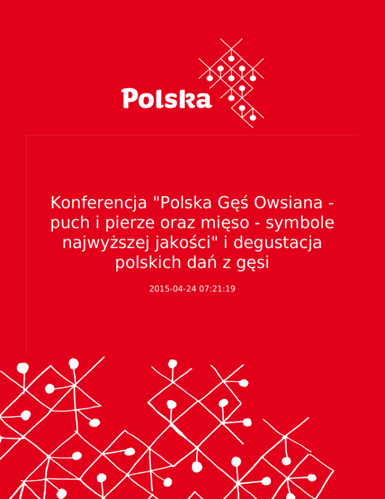 Konferencja "Polska Gęś Owsiana puch i pierze oraz mięso - symbole najwyższej jakości" i degustacja polskich dań z gęsi 2015-04-24 07:21:19 2 Konferencja "Polska Gęś Owsiana -puch i pierze oraz mięso - symbole najwyższej jakości" i degustacja polskich dań z gęsi autorstwa polskiego kucharza podczas przyjęcia W dniu 21 kwietnia w Ambasadzie RP w Tokio odbyła się zorganizowana przez WPHI Tokio oraz KRD Konferencja pt. "Polska Gęś Owsiana - puch i pierze oraz mięso - symbole najwyższej jakości" i degustacja polskich dań z gęsi autorstwa polskiego kucharza podczas przyjęcia. Zarówno w części prezentacyjnej, jak i degustacyjnej, konferencję zaszczyciło obecnością 100 japońskich gości z branży pierzarskiej oraz mięsnej. Konferencja okazała się ogromnym sukcesem, za co serdecznie dziękujemy polskim znakomitym uczestnikom (Prelegentom oraz Kucharzowi), a także japońskim gościom z branży! 3