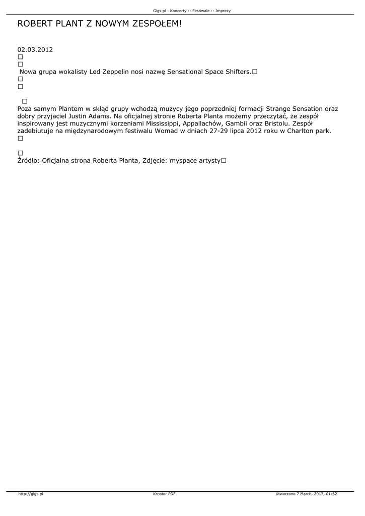 Gigs.pl - Koncerty :: Festiwale :: Imprezy ROBERT PLANT Z NOWYM ZESPOŁEM! 02.03.2012 Nowa grupa wokalisty Led Zeppelin nosi nazwę Sensational Space Shifters. Poza samym Plantem w skłąd grupy wchodzą muzycy jego poprzedniej formacji Strange Sensation oraz dobry przyjaciel Justin Adams. Na oficjalnej stronie Roberta Planta możemy przeczytać, że zespół inspirowany jest muzycznymi korzeniami Mississippi, Appallachów, Gambii oraz Bristolu. Zespół zadebiutuje na międzynarodowym festiwalu Womad w dniach 27-29 lipca 2012 roku w Charlton park. Źródło: Oficjalna strona Roberta Planta, Zdjęcie: myspace artysty http://gigs.pl Kreator PDF Utworzono 7 March, 2017, 01:52