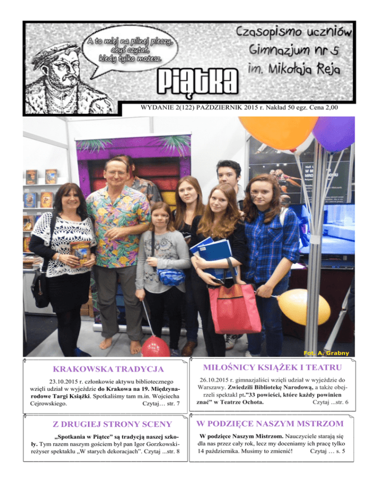 Nowy miesiąc i… nowe wydanie naszej gazetki. W tym miesiącu dowiecie się, co działo się w ostatnim czasie w Piątce, co robiliśmy na 19. Międzynarodowych Targach Książek i jak przebiegły Otrzęsiny Pierwszoklasistów. W dziale Oko w oko z… możecie przeczytać rozmowę z Panią Wicedyrektor Urszulą Bartnik, opisaliśmy też wrażenia ze Spotkania w Piątce z p. Igorem Gorzkowskim– reżyserem spektaklu „W starych dekoracjach”, w którym teżWYDANIE uczestniczyliśmy . Zapoznacie się z recenzją filmu pt. 2(122) r. Nakład 50 egz. Cena 2,00 Gazetka szkolna Gimnazjum nr 5 im.PAŹDZIERNIK Mikołaja Reja2015 w Częstochowie Fot. A. Grabny KRAKOWSKA TRADYCJA 23.10.2015 r. członkowie aktywu bibliotecznego wzięli udział w wyjeździe do Krakowa na 19. Międzynarodowe Targi Książki. Spotkaliśmy tam m.in. Wojciecha Cejrowskiego. Czytaj… str. 7 Z DRUGIEJ STRONY SCENY „Spotkania w Piątce” są tradycją naszej szkoły. Tym razem naszym gościem był pan Igor Gorzkowskireżyser spektaklu „W starych dekoracjach”. Czytaj ...str. 8 MIŁOŚNICY KSIĄŻEK I TEATRU 26.10.2015 r. gimnazjaliści wzięli udział w wyjeździe do Warszawy. Zwiedzili Bibliotekę Narodową, a także obejrzeli spektakl pt.”33 powieści, które każdy powinien znać” w Teatrze Ochota. Czytaj ...str. 6 W PODZIĘCE NASZYM MSTRZOM W podzięce Naszym Mistrzom. Nauczyciele starają się dla nas przez cały rok, lecz my doceniamy ich pracę tylko 14 października. Musimy to zmienić! Czytaj … s. 5 Otrząśnij się! U nas zawsze coś się dzieje Nowy miesiąc i… nowe wydanie naszej gazetki. W tym miesiącu dowiecie się, co działo się w ostatnim czasie w Piątce, co robiliśmy na 19. Międzynarodowych Targach Książek i jak przebiegły Otrzęsiny Pierwszoklasistów. W dziale Oko w oko z… możecie przeczytać rozmowę z Panią Urszulą Bartnik, opisaliśmy też wrażenia ze Spotkania w Piątce z Panem Igorem Gorzkowskim– reżyserem spektaklu „W starych dekoracjach”, w którym też uczestniczyliśmy. Zapoznacie się z recenzją filmu pt. „Mały lalkarz”, który w OKF-ie oglądali uczniowie klas pierwszych. Przeczytacie felieton o naszych szkolnych Mistrzach, ubawicie się czytając kawały w naszym dziale Śmiech to zdrowie oraz przeczytacie sprawozdanie z konkursu „Poetyckie Krajobrazy”. Tyle ciekawych artykułów, że aż chce się czytać! Bardzo serdecznie zachęcam do zapoznania się z naszą szkolną gazetką. Na końcu, jak zawsze, Bilet zwolnienia :) Redaktor naczelna Aleksandra Cupriak Wszystko o bibliotece Podczas XII Regionalnego Forum Bibliotekarzy w sali Sesyjnej Urzędu Miasta Częstochowy odbyło się podsumowanie IX edycji Powiatowego Konkursu na Prezentację Multimedialną „Wszystko o bibliotece”. Uczennice klasy III a Aleksandra Cupriak i Kamila Mościńska pod kierunkiem nauczyciela – bibliotekarza mgr Aliny Grabnej przygotowały prezentację i zajęły zaszczytne III miejsce. Serdecznie gratulujemy! Podczas konferencji Pani Alina Grabna wygłosiła również referat na temat: „Biblioteka miejscem rozwijania pasji i zainteresowań czytelniczych uczniów promując działania podejmowane w naszym gimnazjum”. Aleksandra Cupriak, kl. III a Fot. A. Grabna Piątka 2(122) październik 2015 r. s. 2 Nasi Pierwszoklasiści mogą poszczycić się, że są już pełnoprawnymi uczniami Gimnazjum nr 5 im. Mikołaja Reja. 07 października 2015r. w naszej szkole odbyły się Otrzęsiny klas pierwszych. W sali gimnastycznej na czwartej godzinie lekcyjnej pojawili się wszyscy Pierwszoklasiści wraz ze swoimi wychowawcami. Czekały tam na nich nie lada trudne zadania. Klasa, która zdobyła najwięcej punktów w nagrodę otrzymała tablety do celów edukacyjnych. Uczniów oceniało jury w składzie: opiekun Samorządu Uczniowskiego mgr Ewa Chądzyńska, pani pedagog mgr Dagmara Zyngier i zastępca Przewodniczącej Samorządu Cezary Kołodziejek. Otrzęsiny uroczyście otworzyła Pani Dyrektor Danuta Caban, która życzyła wszystkim udanej zabawy. Imprezę prowadziła przewodnicząca Samorządu Uczniowskiego Aleksandra Cupriak. Konkurencjami z jakimi musieli zmierzyć się Pierwszoklasiści było: wykonanie mundurka gimnazjalisty, quiz wiedzy o naszym gimnazjum, przeprowadzenie wywiadu ze swoim wychowawcą, przygotowanie Gimburgera - gimnazjalnej kanapki, pokaz wykonanych mundurków, przedstawienie narysowanych karykatur swoich wychowawców i prezentacja klasy. Następnie pierwszoklasiści złożyli uroczystą przysięgę i stali się pełnoprawnymi członkami naszego gimnazjum. Zaraz potem jury podliczyło punkty, które przyznawało klasom w poszczególnych konkurencjach. Okazało się, że najwięcej punktów uzyskała klasa 1b. II miejsce zdobyła klasa 1a, III miejsce zajęła klasa I c. Na koniec uczniowie zrobili sobie pamiątkowe zdjęcie wraz z wychowawcą trzymając w ustach plasterek cytryny. Pierwszoklasiści otrzymali też certyfikaty potwierFot. J. Baryła dzające przyjęcie ich do „Szkolnej Braci Uczniowskiej Gimnazjum nr 5 im. Mikołaja Reja w Częstochowie”. Przewodnicząca Samorządu Uczniowskiego Aleksandra Cupriak Fot. J. Baryła Dzisiejszą rozmowę przeprowadzę z panią mgr Urszulą Bartnik nauczycielem matematyki oraz fizyki Gimnazjum nr 5 im. Mikołaja Reja. Fot. A. Grabna - „Nauczycielem jest ten, kto potrafi z trudnych rzeczy uczynić łatwe” powiedział R. W. Emerson. Była Pani wicedyrektorem Gimnazjum nr 5 im. M. Reja, nauczycielem matematyki i fizyki. Czy właśnie dlatego została Pani nauczycielem, żeby pomagać młodzieży odkrywać i poszerzać swoją wiedzę dotyczącą nauk ścisłych? - Jestem nie tylko nauczycielem fizyki, bo pierwsze moje wykształcenie to magister fizyki, ale także matematyki, informatyki. Moje ścisłe wykształcenie rzeczywiście może wskazywać na chęć krzewienia wśród dzieci i młodzieży nauk ścisłych, ale jako zupełnie młoda osoba kierowałam się raczej względami pedagogicznymi. Chc