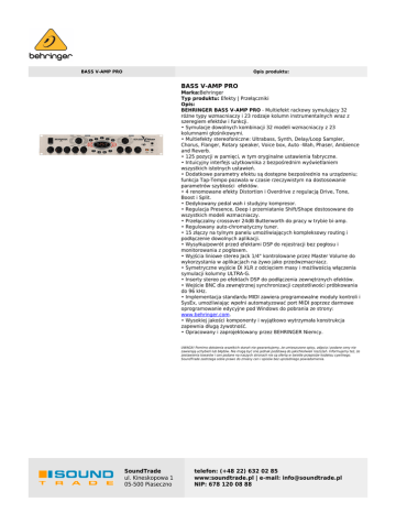 BASS V-AMP PRO Opis produktu: BASS V-AMP PRO Marka:Behringer Typ produktu: Efekty | Przełączniki Opis: BEHRINGER BASS V-AMP PRO - Multiefekt rackowy symulujący 32 różne typy wzmacniaczy i 23 rodzaje kolumn instrumentalnych wraz z szeregiem efektów i funkcji. • Symulacje dowolnych kombinacji 32 modeli wzmacniaczy z 23 kolumnami głośnikowymi. • Multiefekty stereofoniczne: Ultrabass, Synth, Delay/Loop Sampler, Chorus, Flanger, Rotary speaker, Voice box, Auto -Wah, Phaser, Ambience and Reverb. • 125 pozycji w pamięci, w tym oryginalne ustawienia fabryczne. • Intuicyjny interfejs użytkownika z bezpośrednim wyświetlaniem wszystkich istotnych ustawień. • Dodatkowe parametry efektu są dostępne bezpośrednio na urządzeniu; funkcja Tap-Tempo pozwala w czasie rzeczywistym na dostosowanie parametrów szybkości efektów. • 4 renomowane efekty Distortion i Overdrive z regulacją Drive, Tone, Boost i Split. • Dedykowany pedal wah i studyjny kompresor. • Regulacja Presence, Deep i przemiatanie Shift/Shape dostosowane do wszystkich modeli wzmacniaczy. • Przełączalny crossover 24dB Butterworth do pracy w trybie bi-amp. • Regulowany auto-chromatyczny tuner. • 15 złączy na tylnym panelu umożliwiających kompleksowy routing i podłączenie dowolnych aplikacji. • Wysyłka/powrót przed efektami DSP do rejestracji bez pogłosu i monitorowania z pogłosem. • Wyjścia liniowe stereo Jack 1/4" kontrolowane przez Master Volume do wykorzystania w aplikacjach na żywo jako przedwzmacniacz. • Symetryczne wyjście DI XLR z odcięciem masy i możliwością włączenia symulacji kolumny ULTRA-G. • Inserty stereo po efektach DSP do podłączenia zewnętrznych efektów. • Wejście BNC dla zewnętrznej synchronizacji częstotliwości próbkowania do 96 kHz. • Implementacja standardu MIDI zawiera programowalne moduły kontroli i SysEx, umożliwiając wpełni automatyzować port MIDI poprzez darmowe oprogramowanie edycyjne pod Windows do pobrania ze strony: www.behringer.com. • Wysokiej jakości komponenty i wyjątkowo wytrzymała konstrukcja zapewnia długą żywotność. • Opracowany i zaprojektowany przez BEHRINGER Niemcy. UWAGA! Pomimo dołożenia wszelkich starań nie gwarantujemy, że umieszczone opisy, zdjęcia i podane ceny nie zawierają uchybień lub błędów. Nie mogą być one jednak podstawą do jakichkolwiek roszczeń. Informujemy też, że zestawienia towarów i cen podane na naszych stronach nie są ofertą w świetle przepisów kodeksu cywilnego. SoundTrade zastrzega sobie prawo do zmiany cen i opisów bez uprzedniego powiadomienia. SoundTrade ul. Kineskopowa 1 05-500 Piaseczno telefon: (+48 22) 632 02 85 www:soundtrade.pl | e-mail: [email protected] NIP: 678 120 08 88