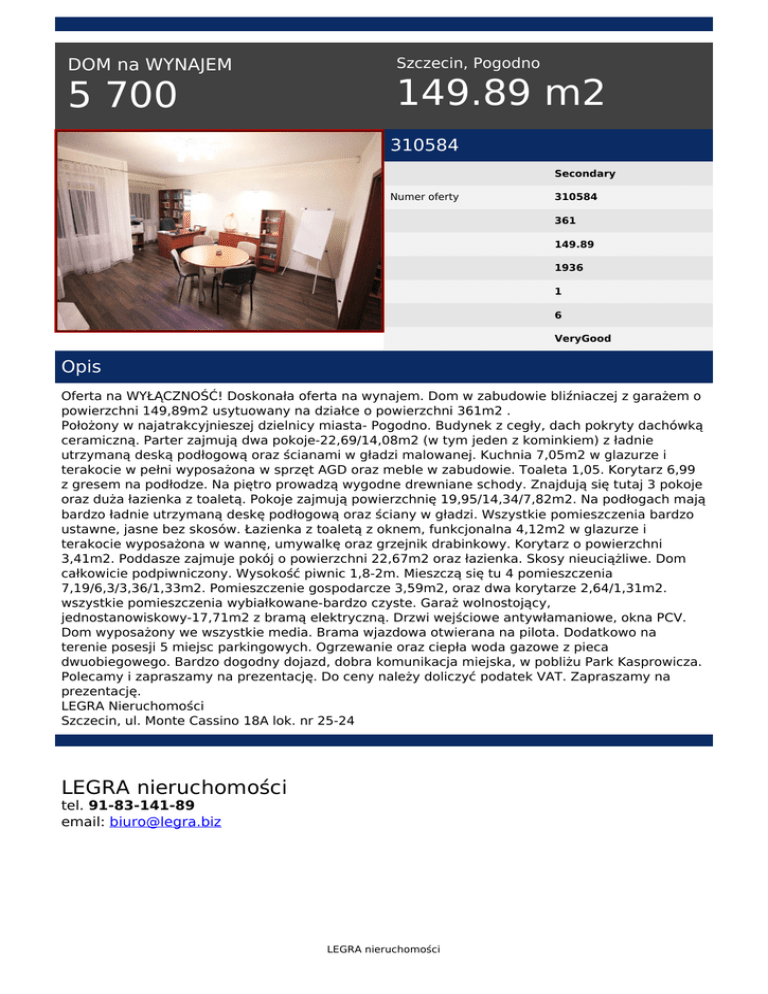 DOM na WYNAJEM 5 700 Szczecin, Pogodno 149.89 m2 310584 Secondary Numer oferty 310584 361 149.89 1936 1 6 VeryGood Opis Oferta na WYŁĄCZNOŚĆ! Doskonała oferta na wynajem. Dom w zabudowie bliźniaczej z garażem o powierzchni 149,89m2 usytuowany na działce o powierzchni 361m2 . Położony w najatrakcyjnieszej dzielnicy miasta- Pogodno. Budynek z cegły, dach pokryty dachówką ceramiczną. Parter zajmują dwa pokoje-22,69/14,08m2 (w tym jeden z kominkiem) z ładnie utrzymaną deską podłogową oraz ścianami w gładzi malowanej. Kuchnia 7,05m2 w glazurze i terakocie w pełni wyposażona w sprzęt AGD oraz meble w zabudowie. Toaleta 1,05. Korytarz 6,99 z gresem na podłodze. Na piętro prowadzą wygodne drewniane schody. Znajdują się tutaj 3 pokoje oraz duża łazienka z toaletą. Pokoje zajmują powierzchnię 19,95/14,34/7,82m2. Na podłogach mają bardzo ładnie utrzymaną deskę podłogową oraz ściany w gładzi. Wszystkie pomieszczenia bardzo ustawne, jasne bez skosów. Łazienka z toaletą z oknem, funkcjonalna 4,12m2 w glazurze i terakocie wyposażona w wannę, umywalkę oraz grzejnik drabinkowy. Korytarz o powierzchni 3,41m2. Poddasze zajmuje pokój o powierzchni 22,67m2 oraz łazienka. Skosy nieuciążliwe. Dom całkowicie podpiwniczony. Wysokość piwnic 1,8-2m. Mieszczą się tu 4 pomieszczenia 7,19/6,3/3,36/1,33m2. Pomieszczenie gospodarcze 3,59m2, oraz dwa korytarze 2,64/1,31m2. wszystkie pomieszczenia wybiałkowane-bardzo czyste. Garaż wolnostojący, jednostanowiskowy-17,71m2 z bramą elektryczną. Drzwi wejściowe antywłamaniowe, okna PCV. Dom wyposażony we wszystkie media. Brama wjazdowa otwierana na pilota. Dodatkowo na terenie posesji 5 miejsc parkingowych. Ogrzewanie oraz ciepła woda gazowe z pieca dwuobiegowego. Bardzo dogodny dojazd, dobra komunikacja miejska, w pobliżu Park Kasprowicza. Polecamy i zapraszamy na prezentację. Do ceny należy doliczyć podatek VAT. Zapraszamy na prezentację. LEGRA Nieruchomości Szczecin, ul. Monte Cassino 18A lok. nr 25-24 LEGRA nieruchomości tel. 91-83-141-89 email: [email protected] LEGRA nieruchomości Powered by TCPDF (www.tcpdf.org)