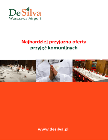 Najbardziej przyjazna oferta przyjęć komunijnych www.desilva.pl Szanowni Państwo! Dziękujemy za zainteresowanie hotelem DeSilva Warszawa Airport. Nasza restauracja jest doskonałym miejscem do organizacji przyjęcia komunijnego. Część restauracyjna położona jest na parterze hotelu i ma bezpośrednie połączenie z lobby hotelu. W ramach pakietu zapewniamy: • rezerwację miejsc/stołów w sali restauracyjnej, • przygotowanie miejsc dla gości przy wspólnych stołach bankietowych, • eleganckie nakrycie stołów, • bogate menu: zakąski zimne, dania gorące, desery, świeże owoce, • napoje bezalkoholowe zimne i gorące podawane bez ograniczeń, • preferencyjne ceny pokoi dla Państwa gości. • Możliwość zamiany dania głównego na specjalne menu dla dzieci Na Państwa życzenie możemy pomóc w organizacji usług towarzyszących: • patery ciast z naszej cukierni w cenie 10 PLN od osoby, • dekoracje z żywych kwiatów w cenie 65 PLN za ikebanę, • pamiątkowe karty menu w cenie 5 PLN za sztukę. Koszt przyjęcia zależy od wybranego menu, przedstawionego poniżej. Cena zawiera podatek VAT. Gorąco polecamy Państwu organizację przyjęcia komunijnego w naszym hotelu i do złożenia nam wizyty. Jednocześnie prosimy o wcześniejsze telefoniczne ustalenie jej daty i godziny. Zapewniamy Państwu: • • • • • elegancką, klimatyzowaną salę bogate i smaczne menu profesjonalną obsługę komfortowy nocleg oraz bezpieczny parking Hotel Hotel Victor DeSilva Pruszków Warszawa by DeSilva Airport ul. Andrzeja Al. Krakowska 1a 266 05-800 02-210 Pruszków Warszawa Kontakt: Anna Dzielska tel.: +48 723-150-044 e-mail: [email protected] Aldona Dumała tel.: +48 695-200-201 e-mail: [email protected] Marta Lirczewska tel.: +48 723 440 150 E-mail: [email protected] tel.: tel.:+48 +48(22) (22)430-39-00 57-52-800 fax: fax:+48 +48(22) (22)430-39-01 57-52-801 e-mail: e-mail:[email protected] [email protected]||www.desilva.pl www.desilva.pl MENU KOMUNIJNE 1 Cena 140 PLN od osoby dzieci do lat 12 – 50 % zniżki Gorący obiad podawany przez kelnerów: Bulion z lanymi kluskami i paseczkami warzyw Kotlet schabowy podawany z młodą kapustą i gotowanymi ziemniakami Tort komunijny Zimne dania na półmiskach ustawionych na stole: Terina rybna z sosem Ravigot Pieczony schab nadziewany śliwkami, Roladki z drobiu i warzyw, Indyk z owocami , Deska serów z owocami i orzechami Pomidory z mozzarellą doprawiane świeżą bazylią Sałatka jarzynowa przygotowana w tradycyjny sposób Sałatka z szynki, żółtego sera , pomidorów, zielonej sałaty z sosem majonezowym Świeże ogórki i pomidory Marynaty: pieczarki, ogórki, papryka Sosy: koktajlowy, koperkowy, tatarski, chrzanowy, żurawinowy Pieczywo, masło Gorąca przekąska podawana przez kelnerów: Żurek z białą kiełbasą Napoje: Napoje bezalkoholowe zimne i gorące bez ograniczeń Hotel Hotel Victor DeSilva Pruszków Warszawa by DeSilva Airport ul. Andrzeja Al. Krakowska 1a 266 05-800 02-210 Pruszków Warszawa tel.: tel.:+48 +48(22) 22 57-52-800 430-39-00 fax: fax:+48 +48(22) (22)430-39-01 57-52-801 e-mail: e-mail:[email protected] [email protected]||www.desilva.pl www.desilva.pl MENU KOMUNIJNE 2 Cena 150 PLN od osoby dzieci do lat 12 – 50 % zniżki Gorący obiad podawany przez kelnerów : Krem ze szparagów Polędwiczki wieprzowe marynowane w ziołach z sosem tymiankowym podawane z kluseczkami gnocchi i świeżym szpinakiem z parmezanem Tort komunijny Zimne dania na półmiskach ustawionych na stole: Półmiski pieczonych mięs: karczek pieczony, schab pieczony, rostbef, szynka Schab po warszawsku, Delikatne teriny warzywne, Roladki z drobiu i warzyw Deska serów z owocami i orzechami Melon w szynce dojrzewającej Sałatka z kaczki i owocami Sałatka „Grecka” z sera Feta, pomidorów, ogórka, cebuli i czarnych oliwek Świeże ogórki i pomidory Marynaty: pieczarki, ogórki, papryka Sosy: koktajlowy, czosnkowy, tatarski, chrzanowy, żurawinowy Pieczywo, masło Gorąca przekąska podawana przez kelnerów: Ragout z indyka i warzyw Napoje: Napoje bezalkoholowe zimne i gorące bez ograniczeń Hotel Hotel Victor DeSilva Pruszków Warszawa by DeSilva Airport ul. Andrzeja Al. Krakowska 1a 266 05-800 02-210 Pruszków Warszawa tel.: tel.:+48 +48(22) 22 57-52-800 430-39-00 fax: fax:+48 +48(22) (22)430-39-01 57-52-801 e-mail: e-mail:[email protected] [email protected]||www.desilva.pl www.desilva.pl MENU KOMUNIJNE 3 Cena 160 PLN od osoby dzieci do lat 12 – 50 % zniżki Gorący obiad podawany przez kelnerów: Krem z zielonego groszku z chipsem z łososia Zapiekane kotleciki z kurczaka z szynką , mozzarellą i szałwią podawane z gotowanymi brokułami i pieczonymi ziemniakami Tort komunijny Zimne dania na półmiskach ustawionych na stole: Sandacz faszerowany Półmiski pieczonych mięs: pasztet, karczek pieczony, schab, szynka, rostbef Ruloniki z szynki nadziewane musem z brokułów, Galantyna z kurczaka w sosie tatarskim Deska serów z owocami i orzechami Faszerowane roladki z łososia Sałatka z wędzonego kurczaka, sałaty lodowej i kukurydzy z sosem majonezowym Sałatka nicejska Świeże ogórki i pomidory Marynaty: pieczarki, ogórki, papryka Sosy: koktajlowy, czosnkowy, tatarski, chrzanowy, żurawinowy Pieczywo, masło Gorąca przekąska podawana przez kelnerów: Wołowina po Burgundzku Napoje: Napoje bezalkoholowe zimne i gorące bez ograniczeń Hotel Hotel Victor DeSilva Pruszków Warszawa by DeSilva Airport ul. Andrzeja Al. Krakowska 1a 266 05-800 02-210 Pruszków Warszawa tel.: tel.:+48 +48(22) (22)430-39-00 75-52-800 fax: fax:+48 +48(22) (22)430-39-01 57-52-801 e-mail: e-mail:[email protected] [email protected]||www.desilva.pl www.desilva.pl MENU KOMUNIJNE 4 Cena 170 PLN od osoby dzieci do lat 12 – 50 % zniżki Gorący obiad podawany przez kelnerów: Krem drobiowy kaczka pieczona z jabłkiem ziemniaki pieczone Tort komunijny Zimne dania na półmiskach ustawionych na stole: Łosoś marynowany Polędwiczki wiep