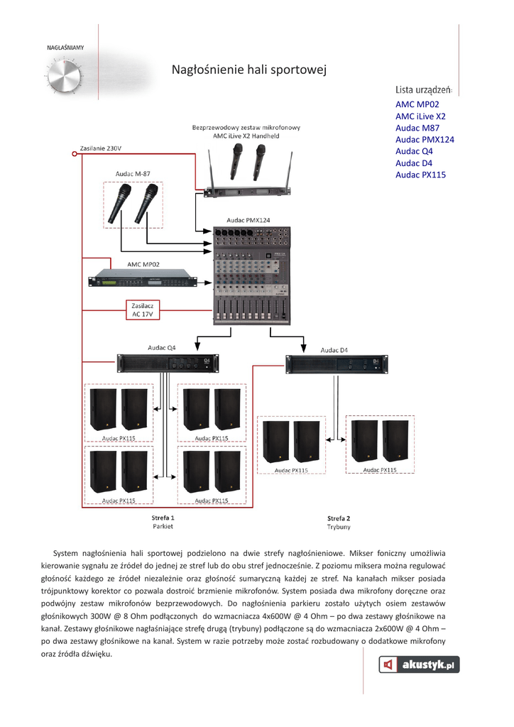 Nagłośnienie hali sportowej AMC MP02 AMC iLive X2 Audac M87 Audac PMX124 Audac Q4 Audac D4 Audac PX115 System nagłośnienia hali sportowej podzielono na dwie strefy nagłośnieniowe. Mikser foniczny umożliwia kierowanie sygnału ze źródeł do jednej ze stref lub do obu stref jednocześnie. Z poziomu miksera można regulować głośność każdego ze źródeł niezależnie oraz głośność sumaryczną każdej ze stref. Na kanałach mikser posiada trójpunktowy korektor co pozwala dostroić brzmienie mikrofonów. System posiada dwa mikrofony doręczne oraz podwójny zestaw mikrofonów bezprzewodowych. Do nagłośnienia parkieru zostało użytych osiem zestawów głośnikowych 300W @ 8 Ohm podłączonych do wzmacniacza 4x600W @ 4 Ohm – po dwa zestawy głośnikowe na kanał. Zestawy głośnikowe nagłaśniające strefę drugą (trybuny) podłączone są do wzmacniacza 2x600W @ 4 Ohm – po dwa zestawy głośnikowe na kanał. System w razie potrzeby może zostać rozbudowany o dodatkowe mikrofony oraz źródła dźwięku.