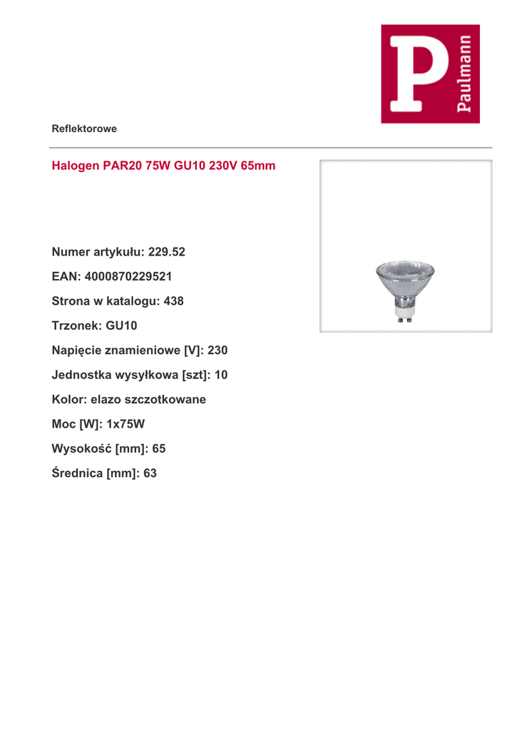 Reflektorowe Halogen PAR20 75W GU10 230V 65mm Numer artykułu: 229.52 EAN: 4000870229521 Strona w katalogu: 438 Trzonek: GU10 Napięcie znamieniowe [V]: 230 Jednostka wysyłkowa [szt]: 10 Kolor: elazo szczotkowane Moc [W]: 1x75W Wysokość [mm]: 65 Średnica [mm]: 63