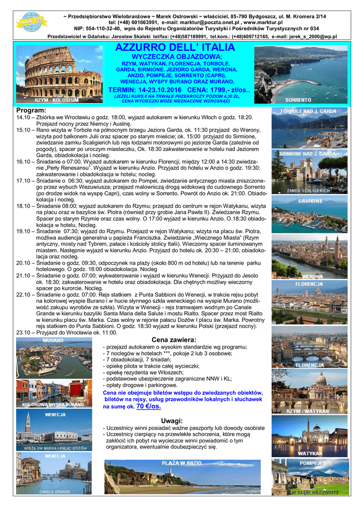 ~ Przedsiębiorstwo Wielobranżowe ~ Marek Ostrowski ~ właściciel, 85-790 Bydgoszcz, ul. M. Kromera 2/14 tel: (+48) 601663991, e-mail: [email protected] , www.marktur.pl NIP: 554-110-32-40, wpis do Rejestru Organizatorów Turystyki i Pośredników Turystycznych nr 034 Przedstawiciel w Gdańsku: Jarosław Skalski tel/fax: (+48)587189991, tel.kom.: (+48)609712165, e-mail: [email protected] AZZURRO DELL’ ITALIA WYCZECZKA OBJAZDOWA: RZYM, WATYKAN, FLORENCJA, TORBOLE, GARDA, SIRMIONE, JEZIORO GARDA, WERONA, ANZIO, POMPEJE, SORRENTO (CAPRI), WENECJA, WYSPY BURANO ORAZ MURANO, TERMIN: 14-23.10.2016 CENA: 1799,- zł/os.. (JEŻELI KURS € NA TRWAŁE PRZEKROCZY POZIOM 4,30 ZŁ, CENA WYCIECZKI MOŻE NIEZNACZNIE WZROSNĄĆ) \ Program: 14.10 – Zbiórka we Wrocławiu o godz. 18:00, wyjazd autokarem w kierunku Włoch o godz. 18:20. Przejazd nocny przez Niemcy i Austrię. 15.10 – Rano wizyta w Torbole na północnym brzegu Jeziora Garda, ok. 11:30 przyjazd do Werony, wizyta pod balkonem Julii oraz spacer po starym mieście; ok. 15:00 przyjazd do Sirmione, zwiedzanie zamku Scaligierich lub rejs łodziami motorowymi po jeziorze Garda (zależnie od pogody), spacer po uroczym miasteczku, Ok. 18:30 zakwaterowanie w hotelu nad Jeziorem Garda, obiadokolacja i nocleg. 16.10 – Śniadanie o 07:00. Wyjazd autokarem w kierunku Florencji, między 12:00 a 14:30 zwiedzanie „Perły Renesansu”. Wyjazd w kierunku Anzio. Przyjazd do hotelu w Anzio o godz. 19:30; zakwaterowanie i obiadokolacja w hotelu; nocleg. 17.10 – Śniadanie o 06:30; wyjazd autokarem do Pompei, zwiedzanie antycznego miasta zniszczonego przez wybuch Wezuwiusza; przejazd malowniczą drogą widokową do cudownego Sorrento (po drodze widok na wyspę Capri), czas wolny w Sorrento. Powrót do Anzio ok. 21:00. Obiadokolacja i nocleg. 18.10 – Śniadanie 08:00; wyjazd autokarem do Rzymu; przejazd do centrum w rejon Watykanu, wizyta na placu oraz w bazylice św. Piotra (również przy grobie Jana Pawła II). Zwiedzanie Rzymu. Spacer po starym Rzymie oraz czas wolny. O 17:00 wyjazd w kierunku Anzio. O.18:30 obiadokolacja w hotelu, Nocleg. 19.10 – Śniadanie 07:30; wyjazd do Rzymu. Przejazd w rejon Watykanu; wizyta na placu św. Piotra, możliwa audiencja generalna u papieża Franciszka. Zwiedzanie „Wiecznego Miasta” (Rzym antyczny, mosty nad Tybrem, pałace i kościoły stolicy Italii). Wieczorny spacer iluminowanym miastem. Następnie wyjazd w kierunku Anzio. Przyjazd do hotelu ok. 20:30 – 21:00, obiadokolacja oraz nocleg. 20.10 – Śniadanie o godz. 09:30, odpoczynek na plaży (około 800 m od hotelu) lub na terenie parku hotelowego. O godz. 18:00 obiadokolacja. Nocleg 21.10 – Śniadanie o godz. 07:00; wykwaterowanie i wyjazd w kierunku Wenecji. Przyjazd do Jesolo ok. 18:30; zakwaterowanie w hotelu oraz obiadokolacja. Dla chętnych możliwy wieczorny spacer po kurorcie. Nocleg. 22.10 – Śniadanie o godz. 07:00. Rejs statkiem z Punta Sabbioni do Wenecji, w trakcie rejsu pobyt na kolorowej wyspie Burano i w hucie słynnego szkła weneckiego na wyspie Murano (możliwość zakupu wyrobów ze szkła). Wizyta w Wenecji - rejs tramwajem wodnym po Canale Grande w kierunku bazyliki Santa Maria della Salute i mostu Rialto. Spacer przez most Rialto w kierunku placu św. Marka. Czas wolny w rejonie pałacu Dożów I placu św. Marka. Powrotny rejs statkiem do Punta Sabbioni. O godz. 18:30 wyjazd w kierunku Polski (przejazd nocny). 23.10 – Przyjazd do Wrocławia ok. 11:00. Cena zawiera: - przejazd autokarem o wysokim standardzie wg programu; - 7 noclegów w hotelach ***, pokoje 2 lub 3 osobowe; - 7 obiadokolacji, 7 śniadań; - opiekę pilota w trakcie całej wycieczki; - opiekę rezydenta we Włoszech; - podstawowe ubezpieczenie zagraniczne NNW i KL; - opłaty drogowe i parkingowe. Cena nie obejmuje biletów wstępu do zwiedzanych obiektów, biletów na rejsy, usług przewodników lokalnych i słuchawek na sumę ok. 70 €/os. Uwagi: - Uczestnicy winni posiadać ważne paszporty lub dowody osobiste - Uczestnicy cierpiący na przewlekłe schorzenia, które mogą zakłócić ich pobyt na wycieczce winni powiadomić o tym organizatora, ewentualnie doubezpieczyć się.