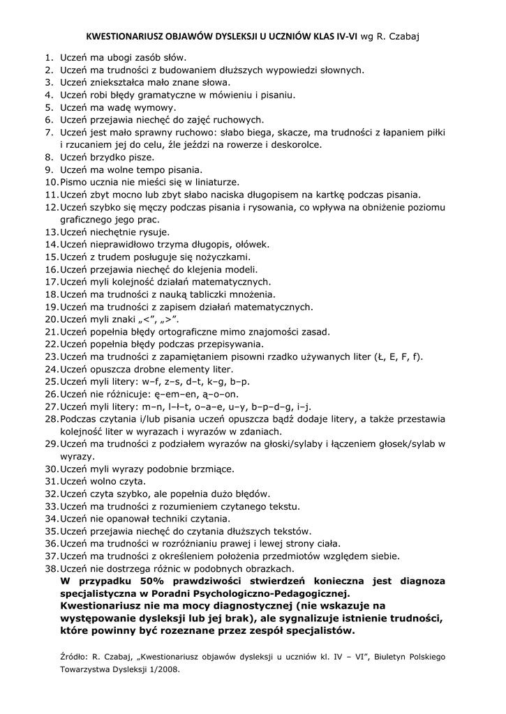 KWESTIONARIUSZ OBJAWÓW DYSLEKSJI U UCZNIÓW KLAS IV-VI wg R. Czabaj 1. 2. 3. 4. 5. 6. 7. Uczeń ma ubogi zasób słów. Uczeń ma trudności z budowaniem dłuższych wypowiedzi słownych. Uczeń zniekształca mało znane słowa. Uczeń robi błędy gramatyczne w mówieniu i pisaniu. Uczeń ma wadę wymowy. Uczeń przejawia niechęć do zajęć ruchowych. Uczeń jest mało sprawny ruchowo: słabo biega, skacze, ma trudności z łapaniem piłki i rzucaniem jej do celu, źle jeździ na rowerze i deskorolce. 8. Uczeń brzydko pisze. 9. Uczeń ma wolne tempo pisania. 10. Pismo ucznia nie mieści się w liniaturze. 11. Uczeń zbyt mocno lub zbyt słabo naciska długopisem na kartkę podczas pisania. 12. Uczeń szybko się męczy podczas pisania i rysowania, co wpływa na obniżenie poziomu graficznego jego prac. 13. Uczeń niechętnie rysuje. 14. Uczeń nieprawidłowo trzyma długopis, ołówek. 15. Uczeń z trudem posługuje się nożyczkami. 16. Uczeń przejawia niechęć do klejenia modeli. 17. Uczeń myli kolejność działań matematycznych. 18. Uczeń ma trudności z nauką tabliczki mnożenia. 19. Uczeń ma trudności z zapisem działań matematycznych. 20. Uczeń myli znaki „<”, „>”. 21. Uczeń popełnia błędy ortograficzne mimo znajomości zasad. 22. Uczeń popełnia błędy podczas przepisywania. 23. Uczeń ma trudności z zapamiętaniem pisowni rzadko używanych liter (Ł, E, F, f). 24. Uczeń opuszcza drobne elementy liter. 25. Uczeń myli litery: w–f, z–s, d–t, k–g, b–p. 26. Uczeń nie różnicuje: ę–em–en, ą–o–on. 27. Uczeń myli litery: m–n, l–ł–t, o–a–e, u–y, b–p–d–g, i–j. 28. Podczas czytania i/lub pisania uczeń opuszcza bądź dodaje litery, a także przestawia kolejność liter w wyrazach i wyrazów w zdaniach. 29. Uczeń ma trudności z podziałem wyrazów na głoski/sylaby i łączeniem głosek/sylab w wyrazy. 30. Uczeń myli wyrazy podobnie brzmiące. 31. Uczeń wolno czyta. 32. Uczeń czyta szybko, ale popełnia dużo błędów. 33. Uczeń ma trudności z rozumieniem czytanego tekstu. 34. Uczeń nie opanował techniki czytania. 35. Uczeń przejawia niechęć do czytania dłuższych tekstów. 36. Uczeń ma trudności w rozróżnianiu prawej i lewej strony ciała. 37. Uczeń ma trudności z określeniem położenia przedmiotów względem siebie. 38. Uczeń nie dostrzega różnic w podobnych obrazkach. W przypadku 50% prawdziwości stwierdzeń konieczna jest diagnoza specjalistyczna w Poradni Psychologiczno-Pedagogicznej. Kwestionariusz nie ma mocy diagnostycznej (nie wskazuje na występowanie dysleksji lub jej brak), ale sygnalizuje istnienie trudności, które powinny być rozeznane przez zespół specjalistów. Źródło: R. Czabaj, „Kwestionariusz objawów dysleksji u uczniów kl. IV – VI”, Biuletyn Polskiego Towarzystwa Dysleksji 1/2008.