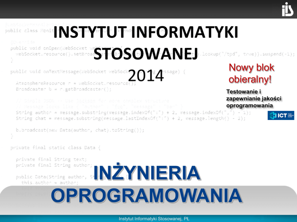 INSTYTUT INFORMATYKI STOSOWANEJ Nowy blok 2014 obieralny! Testowanie i zapewnianie jakości oprogramowania INŻYNIERIA OPROGRAMOWANIA Katedra Informatyki Stosowanej, PŁ Instytut Informatyki Stosowanej, PŁ Inżynieria Oprogramowania Proces ukierunkowany na wytworzenie oprogramowania Kto? Kiedy? Co? Katedra Informatyki Stosowanej, PŁ Instytut Informatyki Stosowanej, PŁ W jaki sposób? Inżynieria oprogramowania blok dyplomowania • Metodyki zwinne (ang. agile) • Od idei do wdrożenia/dystrybucji • Wersjonowanie, budowanie, zarządzanie zmianą i wydaniami • Pozyskiwanie, analiza, specyfikacja, wymagań • Modelowanie UML, generacja kodu • Wzorce projektowe • Architektura aplikacji webowych, frameworki MVC Katedra Informatyki Stosowanej, PŁ Instytut Informatyki Stosowanej, PŁ Zdobyte umiejętności • Znajomość współczesnych języków programowania • Rozwijanie aplikacji internetowych i rozproszonych • Rozwijanie aplikacji bazodanowych • Pozyskiwanie i analizowanie wymagań od klientów • Opracowywanie i analiza modeli (UML) systemów informatycznych • Stosowanie wzorców projektowych usprawniających i przyspieszających tworzenie aplikacji • Wykorzystywanie narzędzi i środowisk wspomagających rozwój oprogramowania na różnych etapach jego rozwoju: – – – – projektowanie i modelowanie, programowanie, testowanie, wersjonowanie, zarządzanie zmianą. Katedra Informatyki Stosowanej, PŁ Instytut Informatyki Stosowanej, PŁ Bloki Obieralne Nowość! Testowanie i zapewnianie jakości oprogramowania Grafika sieciowa Grafika i multimedia Przetwarzanie i rozpoznawanie obrazów Programowanie gier Katedra Informatyki Stosowanej, PŁ Instytut Informatyki Stosowanej, PŁ Testowanie i zapewnianie jakości oprogramowania blok obieralny • Program zatwierdzony przez klaster ITC Nowy blok! • Zasady tworzenia „czystego kodu” • Testy jednostkowe, testy akceptacyjne • Test Driven Development • Automatyzacja testowania • Zasady projektowania API (np. usług internetowych) Katedra Informatyki Stosowanej, PŁ Instytut Informatyki Stosowanej, PŁ Przetwarzanie i rozpoznawanie obrazówblok obieralny • Metody poprawy jakości obrazu • metody segmentacji obrazu • Konstrukcja i zastosowania klasyfikatorów • Logika rozmyta • Sieci neuronowe Katedra Informatyki Stosowanej, PŁ Instytut Informatyki Stosowanej, PŁ Grafika i multimediablok obieralny • Przetwarzanie informacji audiowizualnej • Wizualizacja obiektów trójwymiarowych • Tworzenie animacji 2D • Nieliniowy montaż video Katedra Informatyki Stosowanej, PŁ Instytut Informatyki Stosowanej, PŁ Grafika sieciowablok obieralny • Grafika wektorowa i rastrowa • Programowanie zdarzeniowe • Wykorzystanie grafiki 3D w Internecie • Adobe AIR, Flash, Action Script Katedra Informatyki Stosowanej, PŁ Instytut Informatyki Stosowanej, PŁ Programowanie gierblok obieralny • Teoria gier • Biblioteki SDL i XNA w tworzeniu gier 2D • Algorytmy dla procesorów graficznych • Interfejsy dotykowe i komunikacja mobilna Katedra Informatyki Stosowanej, PŁ Instytut Informatyki Stosowanej, PŁ Tematyka prac dyplomowych 1. Systemy sztucznej inteligencji: programowanie gry w szachy, wspomaganie decyzji inwestycyjnych na giełdzie, wykrywanie plagiatów. 2. Algorytmy przetwarzania, kompresji i analizy obrazów w medycynie, przemyśle i edukacji. 3. Wspomaganie procesu programowania i zarządzanie oprogramowaniem. 4. Przetwarzanie informacji tekstowej przy użyciu języków skryptowych. 5. Programowanie systemowe w Windows. 6. Wykorzystanie procesorów wielordzeniowych, testy procesorów AMD i Intel. 7. Programowanie grafiki, technologie NVidia CUDA i OpenCL. 8. Aplikacje webowe w zastosowaniach komercyjnych, edukacyjnych, naukowych. 9. Nowoczesne technologie programowania aplikacji WWW: J2EE, .NET, systemy CMS. 10. Programowanie metod numerycznych w tomografii. 11. Bazy danych: Integracja systemów relacyjnych i obiektowych, współczesne tendencje i koncepcje baz danych, rozproszone bazy danych, hurtownie danych, systemy OLAP. Katedra Informatyki Stosowanej, PŁ Instytut Informatyki Stosowanej, PŁ Wykładowcy dr hab. Szymon Grabowski dr inż. Radosław Adamus dr inż. Wojciech Bieniecki dr inż. Robert Banasiak mgr inż. Roman Krzeszewski dr inż. Andrzej Romanowski dr Joanna Sekulska-Nalewajko dr inż. Jacek Wiślicki dr inż. Tomasz Kowalski Katedra Informatyki Stosowanej, PŁ Instytut Informatyki Stosowanej, PŁ Dziękuję za uwagę Katedra Informatyki Stosowanej, PŁ Instytut Informatyki Stosowanej, PŁ