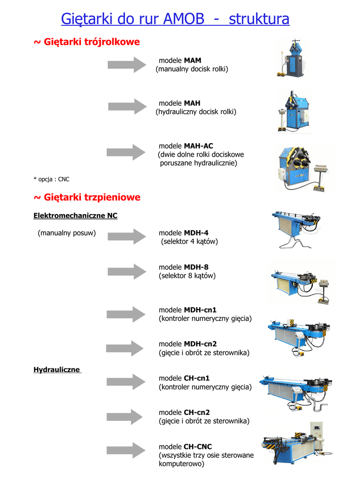 Giętarki do rur AMOB - struktura ~ Giętarki trójrolkowe modele MAM (manualny docisk rolki) modele MAH (hydrauliczny docisk rolki) modele MAH-AC (dwie dolne rolki dociskowe poruszane hydraulicznie) * opcja : CNC ~ Giętarki trzpieniowe Elektromechaniczne NC (manualny posuw) modele MDH-4 (selektor 4 kątów) modele MDH-8 (selektor 8 kątów) modele MDH-cn1 (kontroler numeryczny gięcia) modele MDH-cn2 (gięcie i obrót ze sterownika) Hydrauliczne modele CH-cn1 (kontroler numeryczny gięcia) modele CH-cn2 (gięcie i obrót ze sterownika) modele CH-CNC (wszystkie trzy osie sterowane komputerowo)