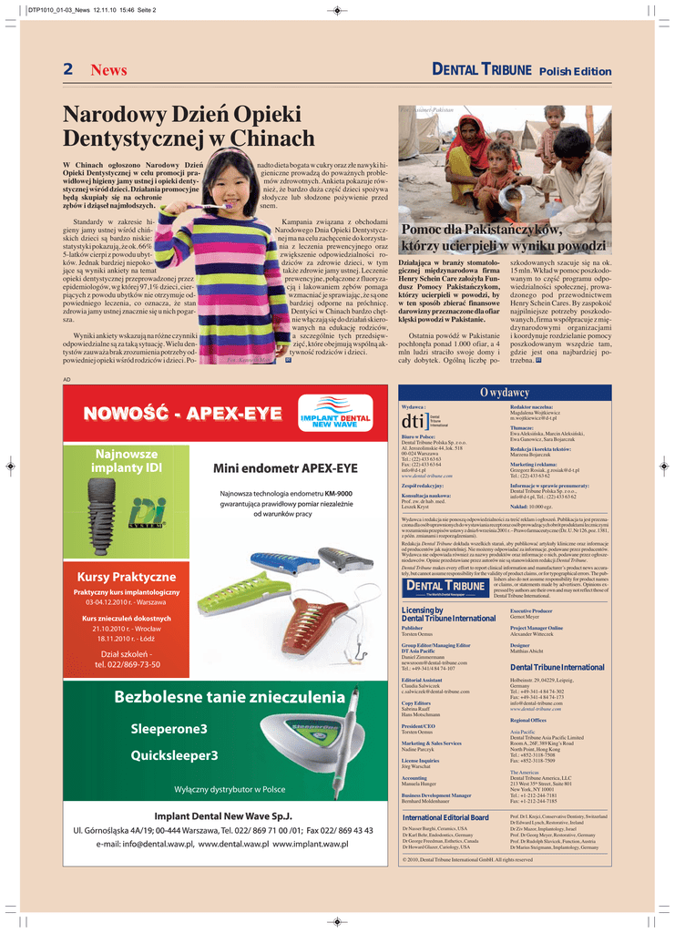 DTP1010_01-03_News 12.11.10 15:46 Seite 2 2 News DENTAL TRIBUNE Narodowy Dzień Opieki Dentystycznej w Chinach Polish Edition Fot.: Asianet-Pakistan nadto dieta bogata w cukry oraz złe nawyki higieniczne prowadzą do poważnych problemów zdrowotnych. Ankieta pokazuje również, że bardzo duża część dzieci spożywa słodycze lub słodzone pożywienie przed snem. W Chinach ogłoszono Narodowy Dzień Opieki Dentystycznej w celu promocji prawidłowej higieny jamy ustnej i opieki dentystycznej wśród dzieci. Działania promocyjne będą skupiały się na ochronie zębów i dziąseł najmłodszych. Standardy w zakresie higieny jamy ustnej wśród chińskich dzieci są bardzo niskie: statystyki pokazują, że ok. 66% 5-latków cierpi z powodu ubytków. Jednak bardziej niepokojące są wyniki ankiety na temat opieki dentystycznej przeprowadzonej przez epidemiologów, wg której 97,1% dzieci, cierpiących z powodu ubytków nie otrzymuje odpowiedniego leczenia, co oznacza, że stan zdrowia jamy ustnej znacznie się u nich pogarsza. Kampania związana z obchodami Narodowego Dnia Opieki Dentystycznej ma na celu zachęcenie do korzystania z leczenia prewencyjnego oraz zwiększenie odpowiedzialności rodziców za zdrowie dzieci, w tym także zdrowie jamy ustnej. Leczenie prewencyjne, połączone z fluoryzacją i lakowaniem zębów pomaga wzmacniać je sprawiając, że są one bardziej odporne na próchnicę. Dentyści w Chinach bardzo chętnie włączają się do działań skierowanych na edukację rodziców, a szczególnie tych przedsięwzięć, które obejmują wspólną aktywność rodziców i dzieci. Wyniki ankiety wskazują na różne czynniki odpowiedzialne są za taką sytuację. Wielu dentystów zauważa brak zrozumienia potrzeby odpowiedniej opieki wśród rodziców i dzieci. Po- Fot.:Kenneth Man DT Pomoc dla Pakistańczyków, którzy ucierpieli w wyniku powodzi Działająca w branży stomatologicznej międzynarodowa firma Henry Schein Care założyła Fundusz Pomocy Pakistańczykom, którzy ucierpieli w powodzi, by w ten sposób zbierać finansowe darowizny przeznaczone dla ofiar klęski powodzi w Pakistanie. Ostatnia powódź w Pakistanie pochłonęła ponad 1.000 ofiar, a 4 mln ludzi straciło swoje domy i cały dobytek. Ogólną liczbę po- szkodowanych szacuje się na ok. 15 mln. Wkład w pomoc poszkodowanym to część programu odpowiedzialności społecznej, prowadzonego pod przewodnictwem Henry Schein Cares. By zaspokoić najpilniejsze potrzeby poszkodowanych, firma współpracuje z międzynarodowymi organizacjami i koordynuje rozdzielanie pomocy poszkodowanym wszędzie tam, gdzie jest ona najbardziej potrzebna. DT AD O wydawcy 12:2ģý$3(;(<( 1 2:2ģý$3(;(<( Najnowsze implanty IDI M Mini ini endometr APEX-EYE APEX-EYE Wydawca : Biuro w Polsce: Dental Tribune Polska Sp. z o.o. Al. Jerozolimskie 44, lok. 518 00-024 Warszawa Tel.: (22) 433 63 63 Fax: (22) 433 63 64 [email protected] www.dental-tribune.com Zespół redakcyjny: Najno Najnowsza wsza ttechnologia KM-9000 -9000 echnologia endometru KM gw gwarantująca arantująca pr prawidłowy awidłowy pomiar niezależnie pracy od warunków warunków pr acy Kursy Praktyczne Praktyczny kurs implantologiczny 03-04.12.2010 r. - Warszawa Kurs znieczuleń dokostnych 21.10.2010 r. - Wrocław 18.11.2010 r. - Łódź Dział szkoleń tel. 022/869-73-50 Bezbolesne tanie znieczulenia Konsultacja naukowa: Prof. zw. dr hab. med. Leszek Kryst Redaktor naczelna: Magdalena Wojtkiewicz [email protected] Tłumacze: Ewa Aleksińska, Marcin Aleksiński, Ewa Ganowicz, Sara Bojarczuk Redakcja i korekta tekstów: Marzena Bojarczuk Marketing i reklama: Grzegorz Rosiak, [email protected] Tel.: (22) 433 63 62 Informacje w sprawie prenumeraty: Dental Tribune Polska Sp. z o.o., [email protected], Tel.: (22) 433 63 62 Nakład: 10.000 egz. Wydawca i redakcja nie ponoszą odpowiedzialności za treść reklam i ogłoszeń. Publikacja ta jest przeznaczona dla osób uprawnionych do wystawiania recept oraz osób prowadzących obrót produktami leczniczymi w rozumieniu przepisów ustawy z dnia 6 września 2001 r. – Prawo farmaceutyczne (Dz. U. Nr 126, poz. 1381, z późn. zmianami i rozporządzeniami). Redakcja Dental Tribune dokłada wszelkich starań, aby publikować artykuły kliniczne oraz informacje od producentów jak najrzetelniej. Nie możemy odpowiadać za informacje, podawane przez producentów. Wydawca nie odpowiada również za nazwy produktów oraz informacje o nich, podawane przez ogłoszeniodawców. Opinie przedstawiane przez autorów nie są stanowiskiem redakcji Dental Tribune. Dental Tribune makes every effort to report clinical information and manufacturer’s product news accurately, but cannot assume responsibility for the validity of product claims, or for typographical errors. The publishers also do not assume responsibility for product names or claims, or statements made by advertisers. Opinions expressed by authors are their own and may not reflect those of The World’s Dental Newspaper Dental Tribune International. DENTAL TRIBUNE Licensing by Dental Tribune International Executive Producer Gernot Meyer Publisher Torsten Oemus Project Manager Online Alexander Witteczek Group Editor/Managing Editor DT Asia Pacific Daniel Zimmermann [email protected] Tel.: +49-341/4 84 74-107 Designer Matthias Abicht Editorial Assistant Claudia Salwiczek [email protected] Copy Editors Sabrina Raaff Hans Motschmann Dental Tribune International Holbeinstr. 29, 04229, Leipzig, Germany Tel.: +49-341-4 84 74-302 Fax: +49-341-4 84 74-173 [email protected] www.dental-tribune.com Regional Offices Sleeperone3 Quicksleeper3 Wyłączny dystrybutor w Polsce IImplant mplant Dental Dental New New Wave Wave Sp.J. Sp.J. Ul órnośląska 4A/19; 00-444 Warszawa, Fax 022/ 869 43 43 Ul.. G Górnośląska Warszawa, Tel. Te el. 022/ 869 71 00 /01; Fax e -mail: [email protected], [email protected], www.dental.waw.pl www.dental.waw.pl www.implant.waw.pl www.implant.waw.pl e-mail: 