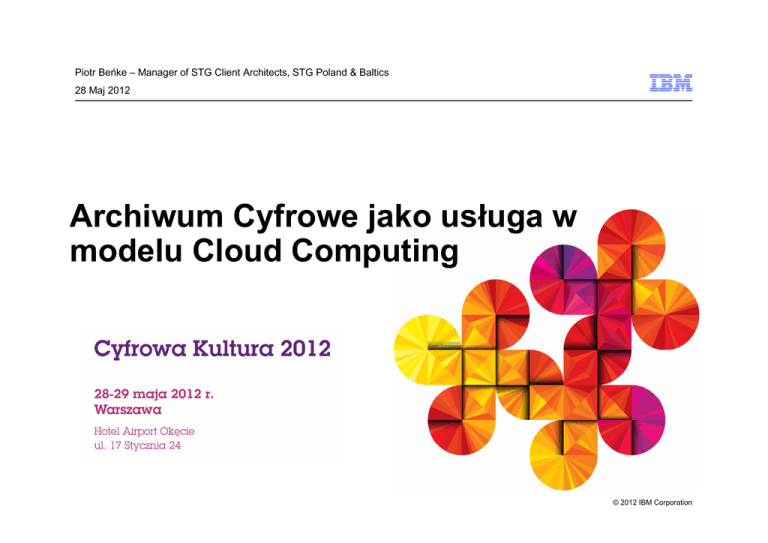 Piotr Beńke – Manager of STG Client Architects, STG Poland & Baltics 28 Maj 2012 Archiwum Cyfrowe jako usługa w modelu Cloud Computing © 2012 IBM Corporation Agenda Gdzie zmierza IT – trochę o liczbach Chmura – definicja, atrybuty, parametery Archiwum cyfrowe w chmurze 2 © 2012 IBM Corporation IT w liczbach Co roku przybywa 42% urządzeń podłączonych do Internetu 32.6-80 milionów serwerów na całym świecie 85% niewykorzystanej mocy komputerów 15% serwerów pracujących 24/7 nie jest wykorzystywanych codziennie 1.2 Zetabajty (1.2 x 1012 Gigabajów) rozmiar współczesnego „świata cyfrowego” 50% przyrost danych co rok 25% danych jest unikalna; 75% danych to kopie W latach 2000-2010 – Ilość serwerów wzrosłła 6x – Wielkość przestrzeni pamięci masowych wzrosłła 69x W latach 2004-2010 – średni roczny przyrost ilości maszyn wirtualnych wynosił 51% Średnia liczba tworzonych serwerów wirtualnych 80-100mln W ciągu ostatnich 5 lat DC zwiększyły zapotrzebowanie na energię elektryczną 2x Koszt energii w DC wzrósł o 18% 20 MW – pobór mocy dużego DC Od roku 2000 podatność na nieautoryzowany dostęp do danych/systemów wzrosła 8x 3 © 2012 IBM Corporation Tempo zmian w IT stale rośnie... Zapotrzebowanie na usługi IT 20% Presja kosztowa Zasobów IT zwirtualizowanych 2-3% 50% Roczny przyrost danych <30% Efektywność wykorzystania pamięci masowych 4 Potrzeba elastyczności Oczekiwany wzrost budżetów IT 70¢ 5-60% Z każdego $ wydanego na IT idzie na utrzymanie środowiska Zasobów IT może być dostępnych „w chmurze” © 2012 IBM Corporation Czy jest chmura obliczeniowa ? Chmura obliczeniowa – model przetwarzania oparty na użytkowaniu usług dostarczonych poprzez sieć. Źródło: Wikipedia 5 © 2012 IBM Corporation Chmura – cd. Podstawowe Atrybuty: – Prostota obsługi – Ekonomia skali – Otwartość na potrzeby biznesowe – Wymiarowanie wg obciążenia Cechy charakterystyczne : – Elastyczne Skalowanie – Elastycza Wycena – Szybka realizacja/dostawa usługi – Globalny dostęp – Samoobsługa – Standaryzacja – Automatyzacja 6 © 2012 IBM Corporation Dlaczego Archiwum cyfrowe w chmurze? Model chmury pozwala na: zarządzanie różnego rodzaju archiwami efektywne wykorzystanie posiadanych zasobów sprzętowych i oprogramowania szybkie modelowanie zmian związanych z funkcjonalnościami archiwum rozliczalnie z wykorzystania zasobów skuteczne panowanie nad ciągłością warstwy technicznej rozwiązania w czasie 7 © 2012 IBM Corporation Korzyści z zastosowania modelu chmury – wg CIO Redukcja kosztów Czas udostępnienia usługi Wysoka dostępność 8 Licencje na oprogramowanie • Koszty sprzę ętu • Koszty kadry IT i utrzymania • Koszty zewnę ętrznego utrzymania • Brak zapotrzebowania na wewnę ętrzne zasoby • Łatwe aktualizacje i zmiany • Szybki rozwój • 77% 72% • Skalowanie zasobów IT do faktycznych potrzeb Wysoka dostę ępność rozwiązań • 50% © 2012 IBM Corporation Najważniejsze wyzwania w obszarze długoterminowego przechowywania informacji Wiecznie rosnące koszty przechowywania danych Logiczna i/lub fizyczna migracja danych co kilka/kilkanaście lat Rozbudowywalność rozwiązania nadążająca za dynamicznym przyrostem danych Zarządzanie metadanymi Utrzymywanie dostępu, bezpieczeństwo, poufność, autentyczność, audytowalność, integralność danych, ochrona oraz dostępność danych w długim okresie czasu Ryzyko utraty danych w dłuższym okresie czasu 9 © 2012 IBM Corporation Wymagania dla ochrony informacji w chmurze Informacje w chmurze muszą być: zorganizowane, zidentyfikowane i poindeksowane, kompletne, autentyczne i ważne/aktualne, Skatalogowane, przekształcone do standardowych formatów, przekazywane jako rzetelne i zweryfikowane, niesfałszowane, zabezpieczone przed zmianą, audytowalne cyfrowo i zabezpieczone przed zniszczeniem lub utratą, z rejestrowanym dostępem, migrowalne zarówno logicznie jak i fizycznie, niezależne od nośnika, na którym są składowane, użyteczne i dostępne, zarządzalne pod kątem retencji i kasowania. 10 © 2012 IBM Corporation Model OAIS w chmurze? 11 © 2012 IBM Corporation IBM Presentation Template Full Version Bariery adaptacji „chumry” dla potrzeb archiwum cyfrowego Źródło: 2010 IBM Global IT Risk Study Source: If applicable, describe source origin 12 © 2012 IBM Corporation Dziękuję 13 © 2012 IBM Corporation