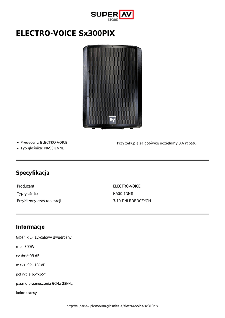 ELECTRO-VOICE Sx300PIX Producent: ELECTRO-VOICE Typ głośnika: NAŚCIENNE Przy zakupie za gotówkę udzielamy 3% rabatu Specyfikacja Producent ELECTRO-VOICE Typ głośnika NAŚCIENNE Przybliżony czas realizacji 7-10 DNI ROBOCZYCH Informacje Głośnik LF 12-calowy dwudrożny moc 300W czułość 99 dB maks. SPL 131dB pokrycie 65°x65° pasmo przenoszenia 60Hz-25kHz kolor czarny http://super-av.pl/store/naglosnienie/electro-voice-sx300pix wersja do pracy na zewnątrz IP55 transformator 70/100V Super AV al. Jana Pawła II 32 43 - 100 Tychy tel: 32 217 01 12 http://super-av.pl/store/naglosnienie/electro-voice-sx300pix