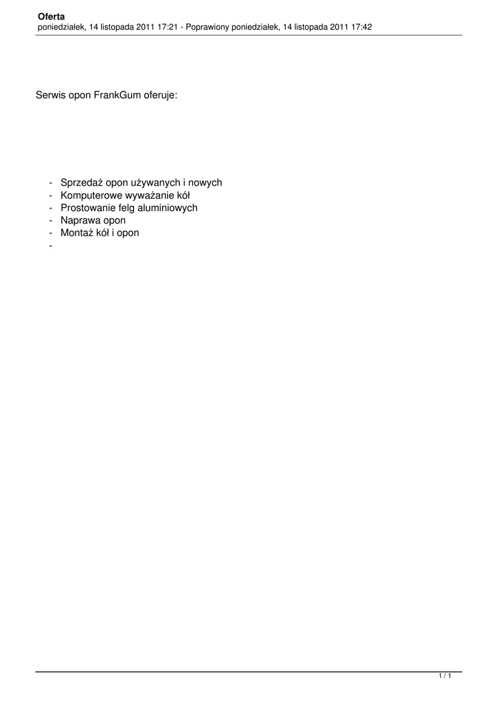 Oferta poniedziałek, 14 listopada 2011 17:21 - Poprawiony poniedziałek, 14 listopada 2011 17:42 Serwis opon FrankGum oferuje: - Sprzedaż opon używanych i nowych Komputerowe wyważanie kół Prostowanie felg aluminiowych Naprawa opon Montaż kół i opon 1/1