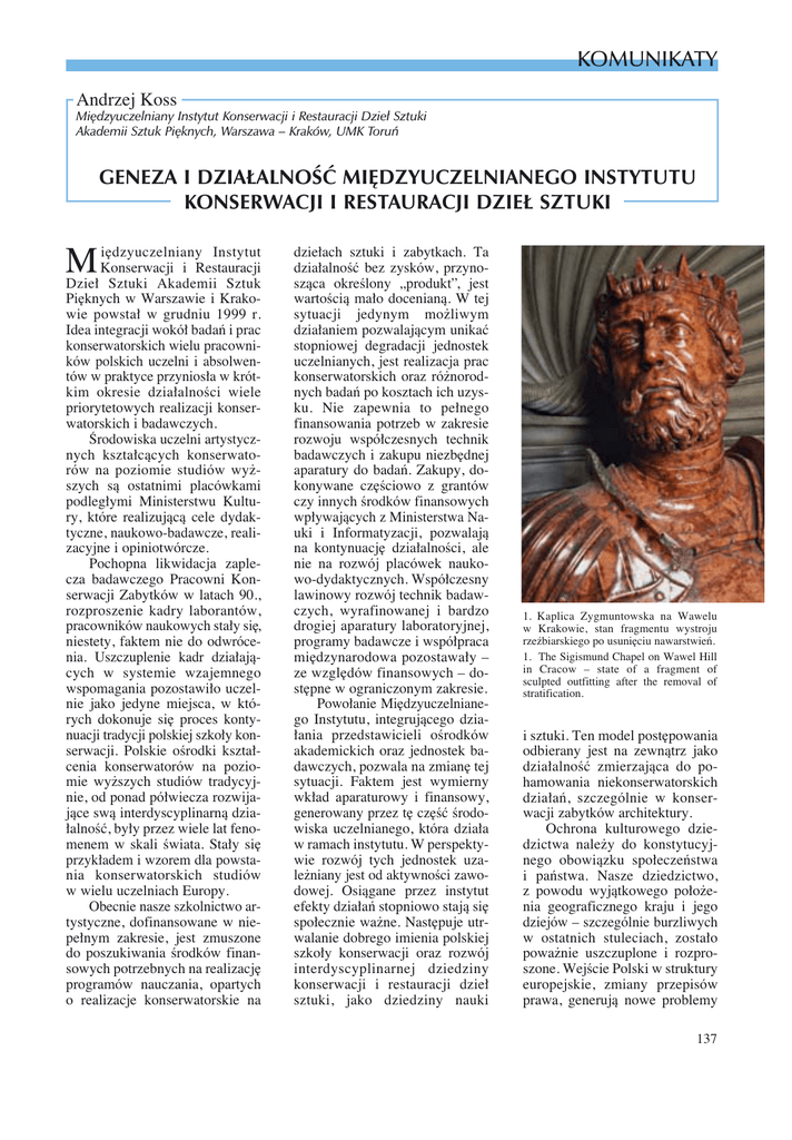 KOMUNIKATY Andrzej Koss Mi´dzyuczelniany Instytut Konserwacji i Restauracji Dzie∏ Sztuki Akademii Sztuk Pi´knych, Warszawa – Kraków, UMK Toruƒ GENEZA I DZIA¸ALNOÂå MI¢DZYUCZELNIANEGO INSTYTUTU KONSERWACJI I RESTAURACJI DZIE¸ SZTUKI M i´dzyuczelniany Instytut Konserwacji i Restauracji Dzie∏ Sztuki Akademii Sztuk Pi´knych w Warszawie i Krakowie powsta∏ w grudniu 1999 r. Idea integracji wokó∏ badaƒ i prac konserwatorskich wielu pracowników polskich uczelni i absolwentów w praktyce przynios∏a w krótkim okresie dzia∏alnoÊci wiele priorytetowych realizacji konserwatorskich i badawczych. Ârodowiska uczelni artystycznych kszta∏càcych konserwatorów na poziomie studiów wy˝szych sà ostatnimi placówkami podleg∏ymi Ministerstwu Kultury, które realizujàcà cele dydaktyczne, naukowo-badawcze, realizacyjne i opiniotwórcze. Pochopna likwidacja zaplecza badawczego Pracowni Konserwacji Zabytków w latach 90., rozproszenie kadry laborantów, pracowników naukowych sta∏y si´, niestety, faktem nie do odwrócenia. Uszczuplenie kadr dzia∏ajàcych w systemie wzajemnego wspomagania pozostawi∏o uczelnie jako jedyne miejsca, w których dokonuje si´ proces kontynuacji tradycji polskiej szko∏y konserwacji. Polskie oÊrodki kszta∏cenia konserwatorów na poziomie wy˝szych studiów tradycyjnie, od ponad pó∏wiecza rozwijajàce swà interdyscyplinarnà dzia∏alnoÊç, by∏y przez wiele lat fenomenem w skali Êwiata. Sta∏y si´ przyk∏adem i wzorem dla powstania konserwatorskich studiów w wielu uczelniach Europy. Obecnie nasze szkolnictwo artystyczne, dofinansowane w niepe∏nym zakresie, jest zmuszone do poszukiwania Êrodków finansowych potrzebnych na realizacj´ programów nauczania, opartych o realizacje konserwatorskie na dzie∏ach sztuki i zabytkach. Ta dzia∏alnoÊç bez zysków, przynoszàca okreÊlony „produkt”, jest wartoÊcià ma∏o docenianà. W tej sytuacji jedynym mo˝liwym dzia∏aniem pozwalajàcym unikaç stopniowej degradacji jednostek uczelnianych, jest realizacja prac konserwatorskich oraz ró˝norodnych badaƒ po kosztach ich uzysku. Nie zapewnia to pe∏nego finansowania potrzeb w zakresie rozwoju wspó∏czesnych technik badawczych i zakupu niezb´dnej aparatury do badaƒ. Zakupy, dokonywane cz´Êciowo z grantów czy innych Êrodków finansowych wp∏ywajàcych z Ministerstwa Nauki i Informatyzacji, pozwalajà na kontynuacj´ dzia∏alnoÊci, ale nie na rozwój placówek naukowo-dydaktycznych. Wspó∏czesny lawinowy rozwój technik badawczych, wyrafinowanej i bardzo drogiej aparatury laboratoryjnej, programy badawcze i wspó∏praca mi´dzynarodowa pozostawa∏y – ze wzgl´dów finansowych – dost´pne w ograniczonym zakresie. Powo∏anie Mi´dzyuczelnianego Instytutu, integrujàcego dzia∏ania przedstawicieli oÊrodków akademickich oraz jednostek badawczych, pozwala na zmian´ tej sytuacji. Faktem jest wymierny wk∏ad aparaturowy i finansowy, generowany przez t´ cz´Êç Êrodowiska uczelnianego, która dzia∏a w ramach instytutu. W perspektywie rozwój tych jednostek uzale˝niany jest od aktywnoÊci zawodowej. Osiàgane przez instytut efekty dzia∏aƒ stopniowo stajà si´ spo∏ecznie wa˝ne. Nast´puje utrwalanie dobrego imienia polskiej szko∏y konserwacji oraz rozwój interdyscyplinarnej dziedziny konserwacji i restauracji dzie∏ sztuki, jako dziedziny nauki 1. Kaplica Zygmuntowska na Wawelu w Krakowie, stan fragmentu wystroju rzeêbiarskiego po usuni´ciu nawarstwieƒ. 1. The Sigismund Chapel on Wawel Hill in Cracow – state of a fragment of sculpted outfitting after the removal of stratification. i sztuki. Ten model post´powania odbierany jest na zewnàtrz jako dzia∏alnoÊç zmierzajàca do pohamowania niekonserwatorskich dzia∏aƒ, szczególnie w konserwacji zabytków architektury. Ochrona kulturowego dziedzictwa nale˝y do konstytucyjnego obowiàzku spo∏eczeƒstwa i paƒstwa. Nasze dziedzictwo, z powodu wyjàtkowego po∏o˝enia geograficznego kraju i jego dziejów – szczególnie burzliwych w ostatnich stuleciach, zosta∏o powa˝nie uszczuplone i rozproszone. WejÊcie Polski w struktury europejskie, zmiany przepisów prawa, generujà nowe problemy 137 i potrzeby zmian w zakresie ochrony dziedzictwa kultury takie, jak choçby zachowanie zabytków jako dowodów to˝samoÊci narodowej, zabezpieczenia ich przed kradzie˝ami, odzyskiwanie utraconych dzie∏ z mi´dzynarodowego rynku handlu dzie∏ami sztuki w innej skali ni˝ dotychczas. Zachowanie dziedzictwa narodowego, wymaga podejmowania dzia∏aƒ zmierzajàcych do lepszego, nowoczesnego kszta∏cenia zawodowego, dokszta∏cania kadr konserwatorów i spo∏eczeƒstwa, zintensyfikowania i pog∏´bienia badaƒ konserwatorskich i badaƒ uzupe∏niajàcych (np. archeologicznych, architektonicznych) oraz prac przy dzie∏ach sztuki i zabytkach. ˚adna z trzech uczelni, kszta∏càcych obecnie konserwatorów, nie jest w stanie samodzielnie sprostaç potrzebom paƒstwa w tej dziedzinie. T´ luk´ – poprzez swojà dzia∏alnoÊç – przynajmniej cz´Êciowo stara si´ wype∏niaç Mi´dzyuczelniany Instytut Konserwacji i Restauracji Dzie∏ Sztuki. 2. Kaplica Zygmuntowska na Wawelu w Krakowie, stan zachowania medalionu wykonanego z alabastru. 2. The Sigismund Chapel on Wawel Hill in Cracow – state of preservation of an alabaster medallion. 138 Minione cztery lata w realizacji zadaƒ statutowych Instytutu zaowocowa∏y wspó∏pracà z wieloma jednostkami naukowo-badawczymi w szerokim, interdyscyplinarnym zakresie. To wspó∏dzia∏anie stanowi potwierdzenie potrzeby integracji na rzecz dzia∏ania edukacyjnego i rozwoju wspó∏czesnej nauki i sztuki konserwacji. Do najwa˝niejszych osiàgni´ç instytutu nale˝y zaliczyç prace zwiàzane z realizacjà trzyletniego mi´dzynarodowego grantu Komitetu Badaƒ Naukowych, dotyczàcego badaƒ i wdro˝enia techniki laserowej w konserwacji (Eureka E!2542). Z∏o˝ono nowe aplikacje do zastosowaƒ tej tec