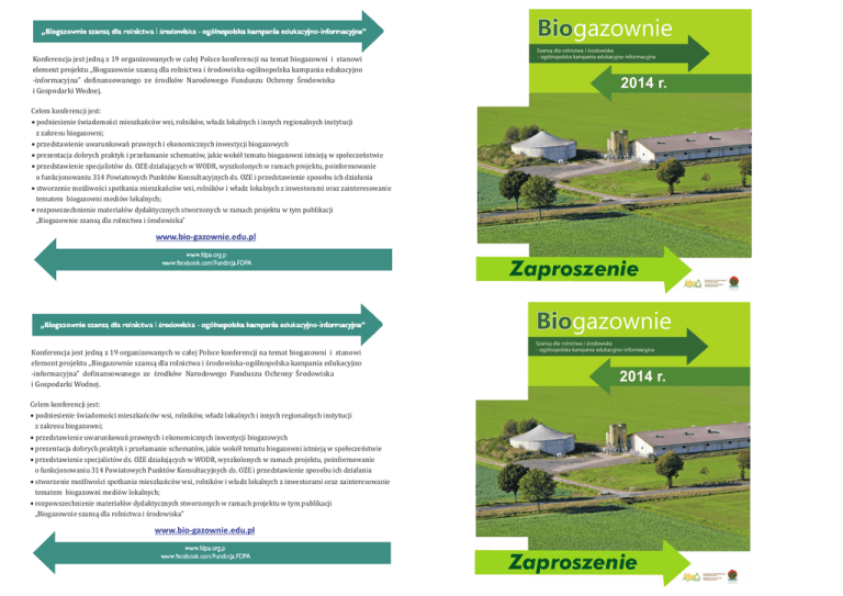 Konferencja jest jedną z 19 organizowanych w całej Polsce konferencji na temat biogazowni i stanowi element projektu „Biogazownie szansą dla rolnictwa i środowiska-ogólnopolska kampania edukacyjno -informacyjna” dofinansowanego ze środków Narodowego Funduszu Ochrony Środowiska i Gospodarki Wodnej. 2014 r. Celem konferencji jest: podniesienie świadomości mieszkańców wsi, rolników, władz lokalnych i innych regionalnych instytucji z zakresu biogazowni; przedstawienie uwarunkowań prawnych i ekonomicznych inwestycji biogazowych prezentacja dobrych praktyk i przełamanie schematów, jakie wokół tematu biogazowni istnieją w społeczeństwie przedstawienie specjalistów ds. OZE działających w WODR, wyszkolonych w ramach projektu, poinformowanie o funkcjonowaniu 314 Powiatowych Punktów Konsultacyjnych ds. OZE i przedstawienie sposobu ich działania stworzenie możliwości spotkania mieszkańców wsi, rolników i władz lokalnych z inwestorami oraz zainteresowanie tematem biogazowni mediów lokalnych; rozpowszechnienie materiałów dydaktycznych stworzonych w ramach projektu w tym publikacji „Biogazownie szansą dla rolnictwa i środowiska” www.bio-gazownie.edu.pl Zaproszenie Konferencja jest jedną z 19 organizowanych w całej Polsce konferencji na temat biogazowni i stanowi element projektu „Biogazownie szansą dla rolnictwa i środowiska-ogólnopolska kampania edukacyjno -informacyjna” dofinansowanego ze środków Narodowego Funduszu Ochrony Środowiska i Gospodarki Wodnej. 2014 r. Celem konferencji jest: podniesienie świadomości mieszkańców wsi, rolników, władz lokalnych i innych regionalnych instytucji z zakresu biogazowni; przedstawienie uwarunkowań prawnych i ekonomicznych inwestycji biogazowych prezentacja dobrych praktyk i przełamanie schematów, jakie wokół tematu biogazowni istnieją w społeczeństwie przedstawienie specjalistów ds. OZE działających w WODR, wyszkolonych w ramach projektu, poinformowanie o funkcjonowaniu 314 Powiatowych Punktów Konsultacyjnych ds. OZE i przedstawienie sposobu ich działania stworzenie możliwości spotkania mieszkańców wsi, rolników i władz lokalnych z inwestorami oraz zainteresowanie tematem biogazowni mediów lokalnych; rozpowszechnienie materiałów dydaktycznych stworzonych w ramach projektu w tym publikacji „Biogazownie szansą dla rolnictwa i środowiska” www.bio-gazownie.edu.pl Zaproszenie Patronat honorowy Ministra Rolnictwa i Rozwoju Wsi Fundacja na rzecz Rozwoju Polskiego Rolnictwa i Zachodniopomorski Ośrodek Doradztwa Rolniczego mamy przyjemność zaprosić na konferencję Patronat medialny: „Biogazownie szansą dla rolnictwa i środowiska” która odbędzie się w dniu 14.02.2014 r., w godzinach 9.00-17.15 w ZODR w Barzkowicach (sala konferencyjna) Serdecznie zapraszamy Patronat honorowy Ministra Rolnictwa i Rozwoju Wsi Fundacja na rzecz Rozwoju Polskiego Rolnictwa i Zachodniopomorski Ośrodek Doradztwa Rolniczego mamy przyjemność zaprosić na konferencję Patronat medialny: „Biogazownie szansą dla rolnictwa i środowiska” która odbędzie się w dniu 14.02.2014 r., w godzinach 9.00-17.15 w ZODR w Barzkowicach (sala konferencyjna) Serdecznie zapraszamy